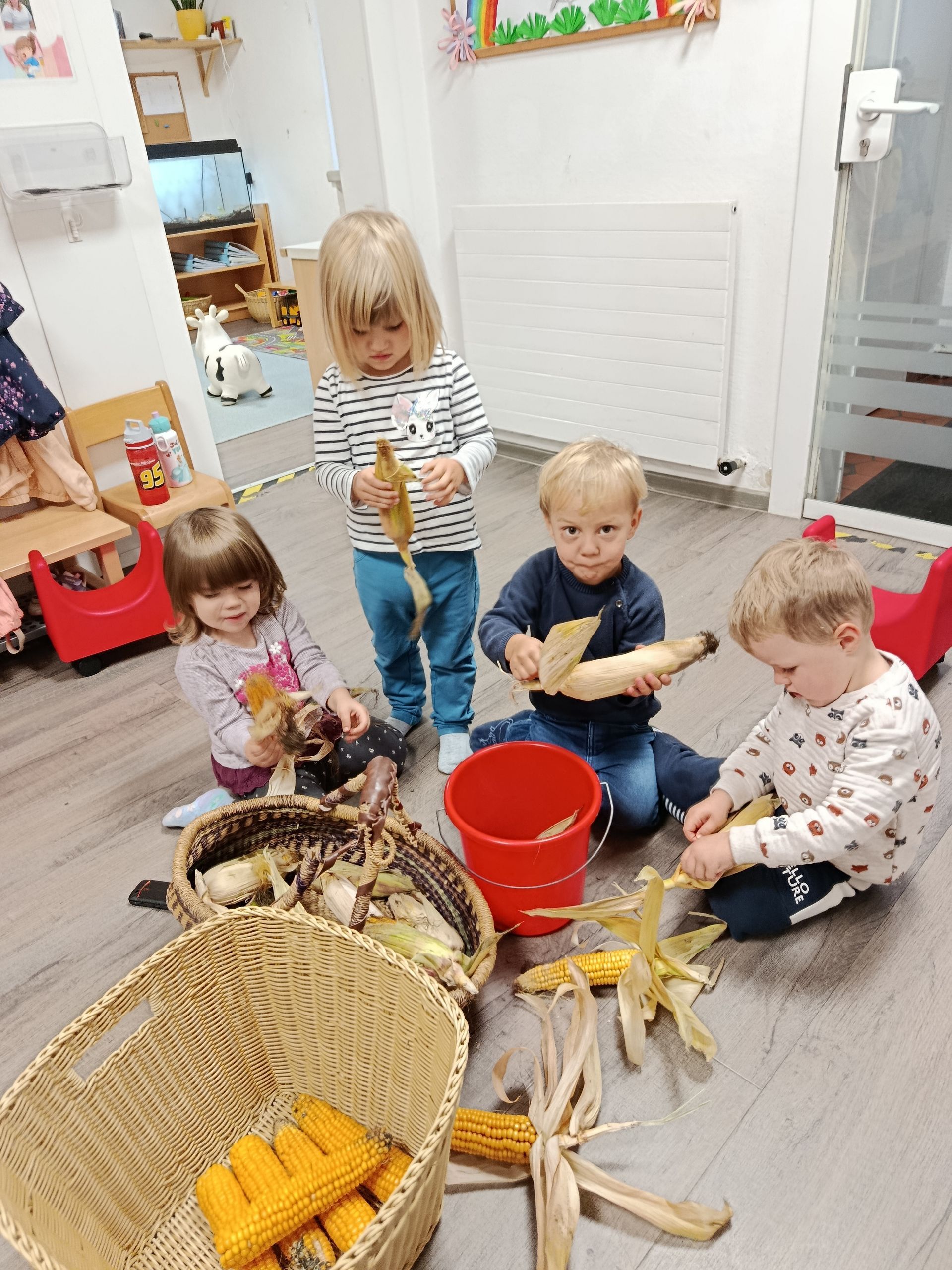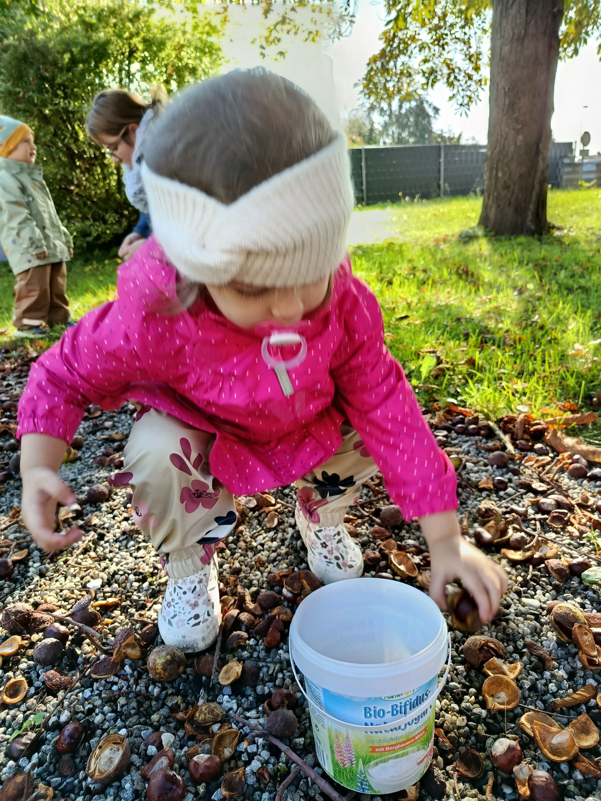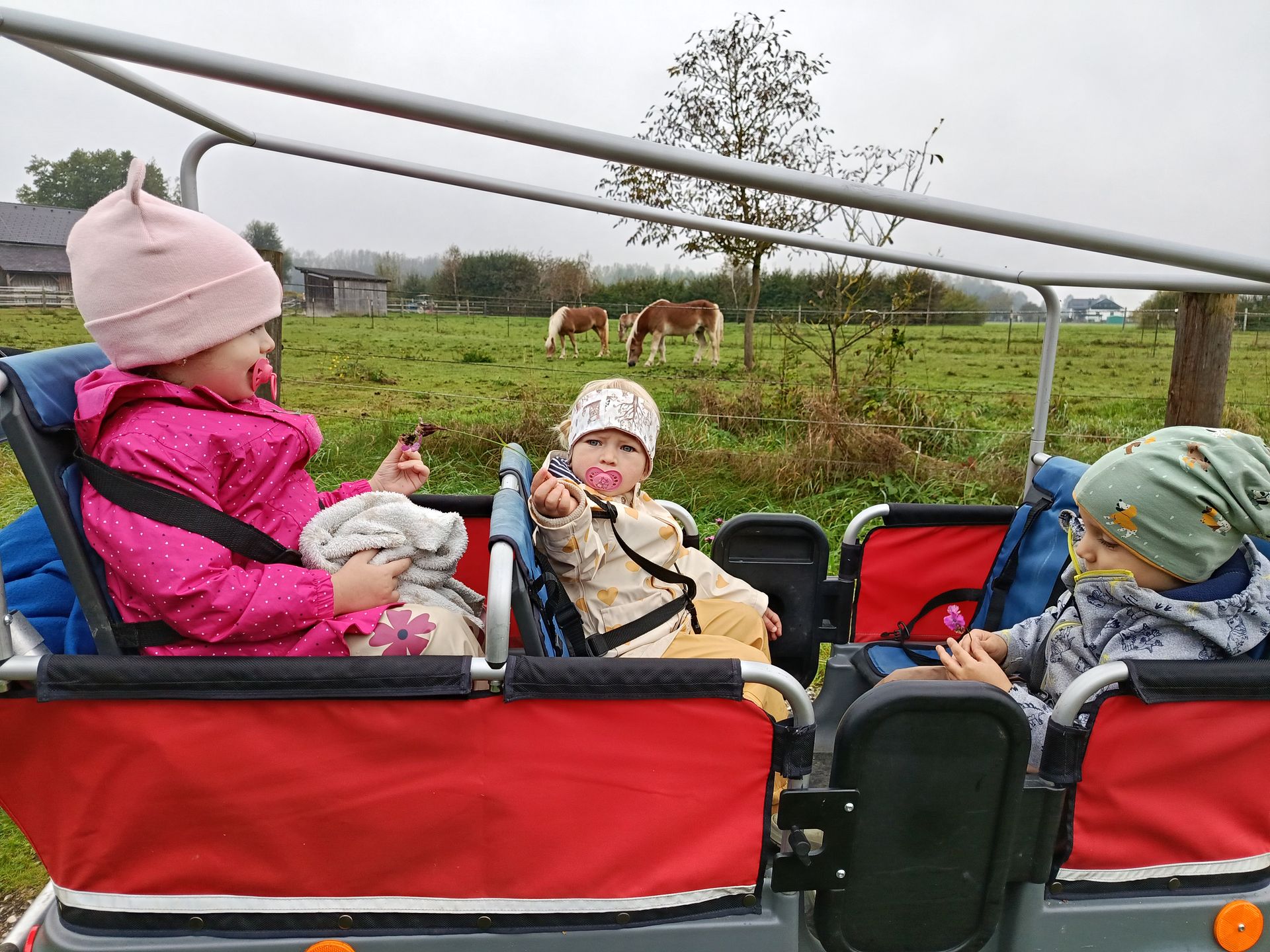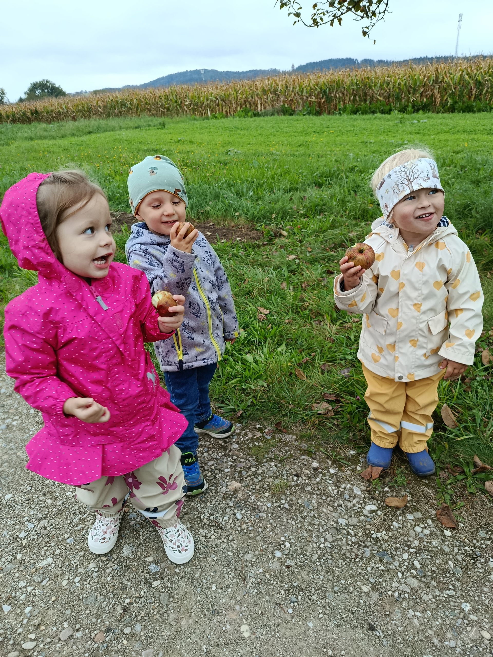 Die Kinder der Sonnengruppe haben sich in den neuen, hellen Räumlichkeiten schon sehr gut eingewöhnt. Außerdem waren sie schon fleißig mit dem Krabbelstubenbus unterwegs und durften die Umgebung erkunden – es wurden Kastanien gesammelt, Äpfel gepflückt und die Pferde auf der Weide besucht!