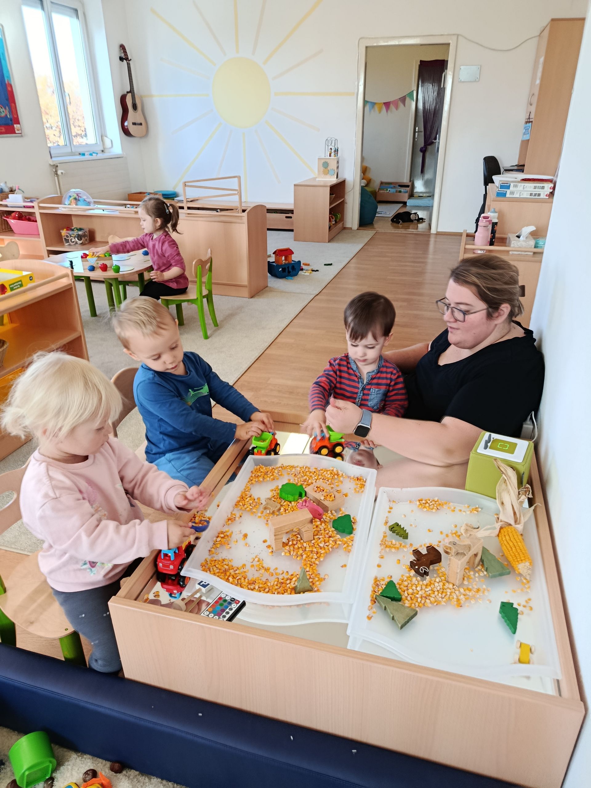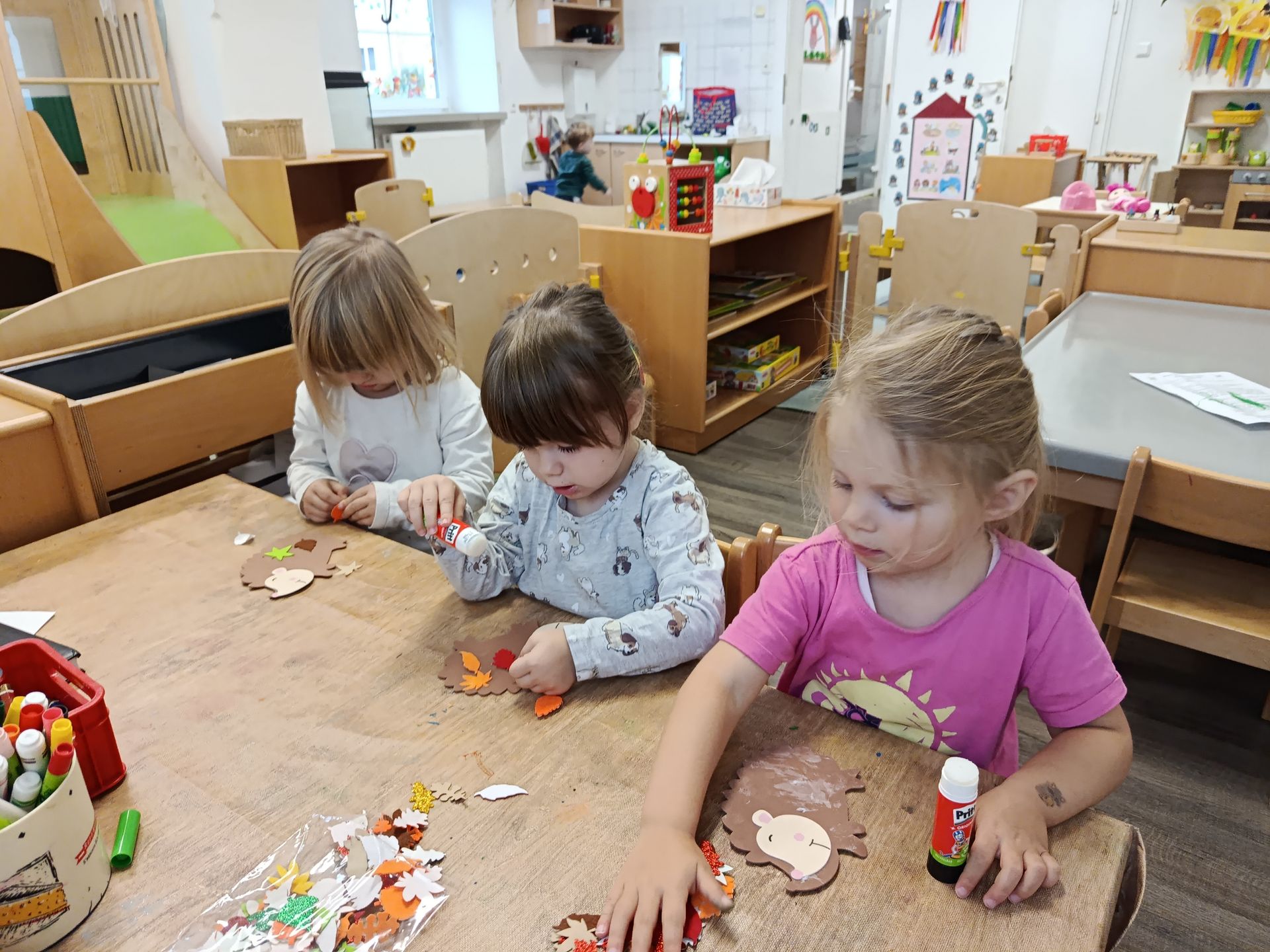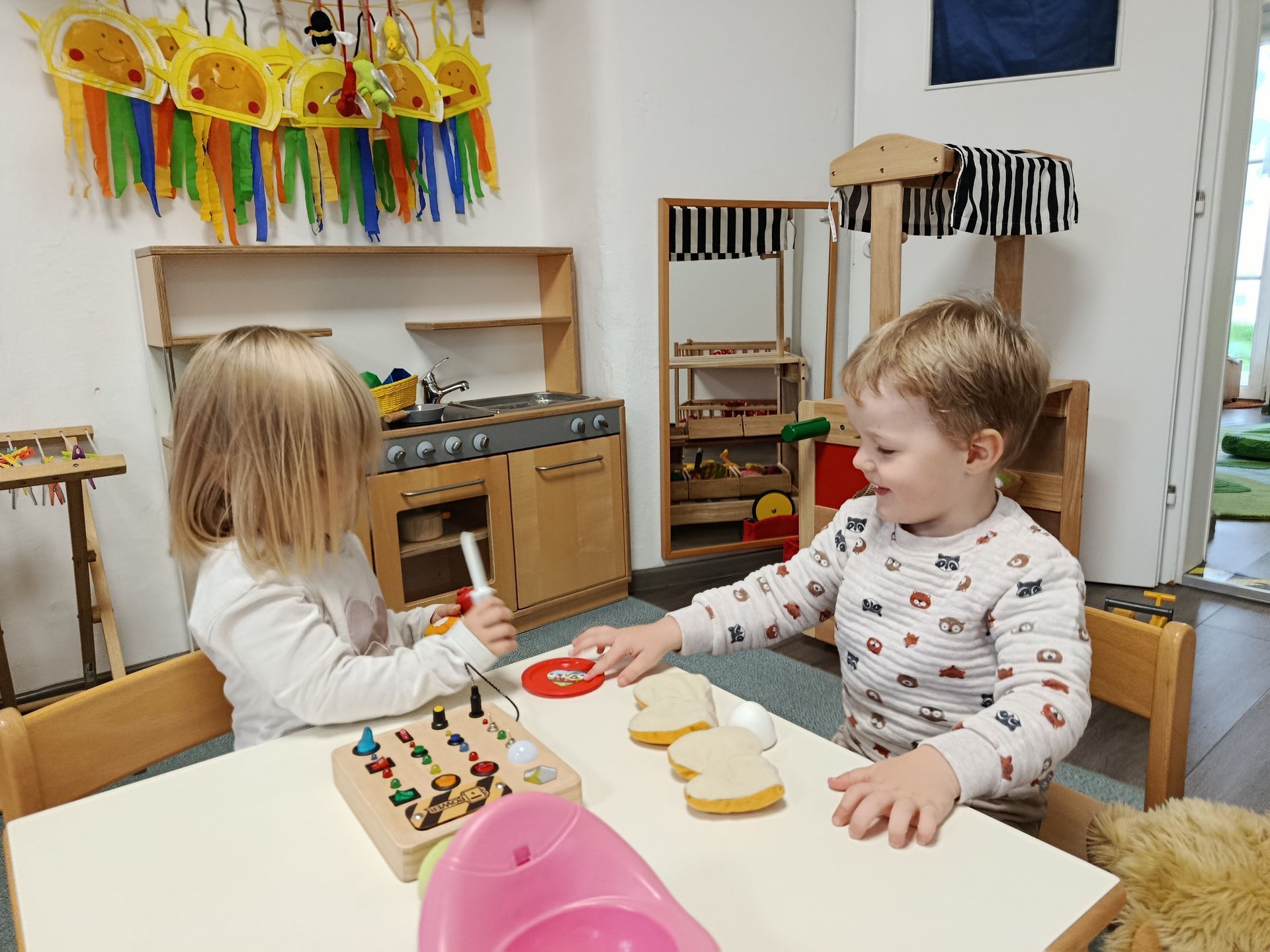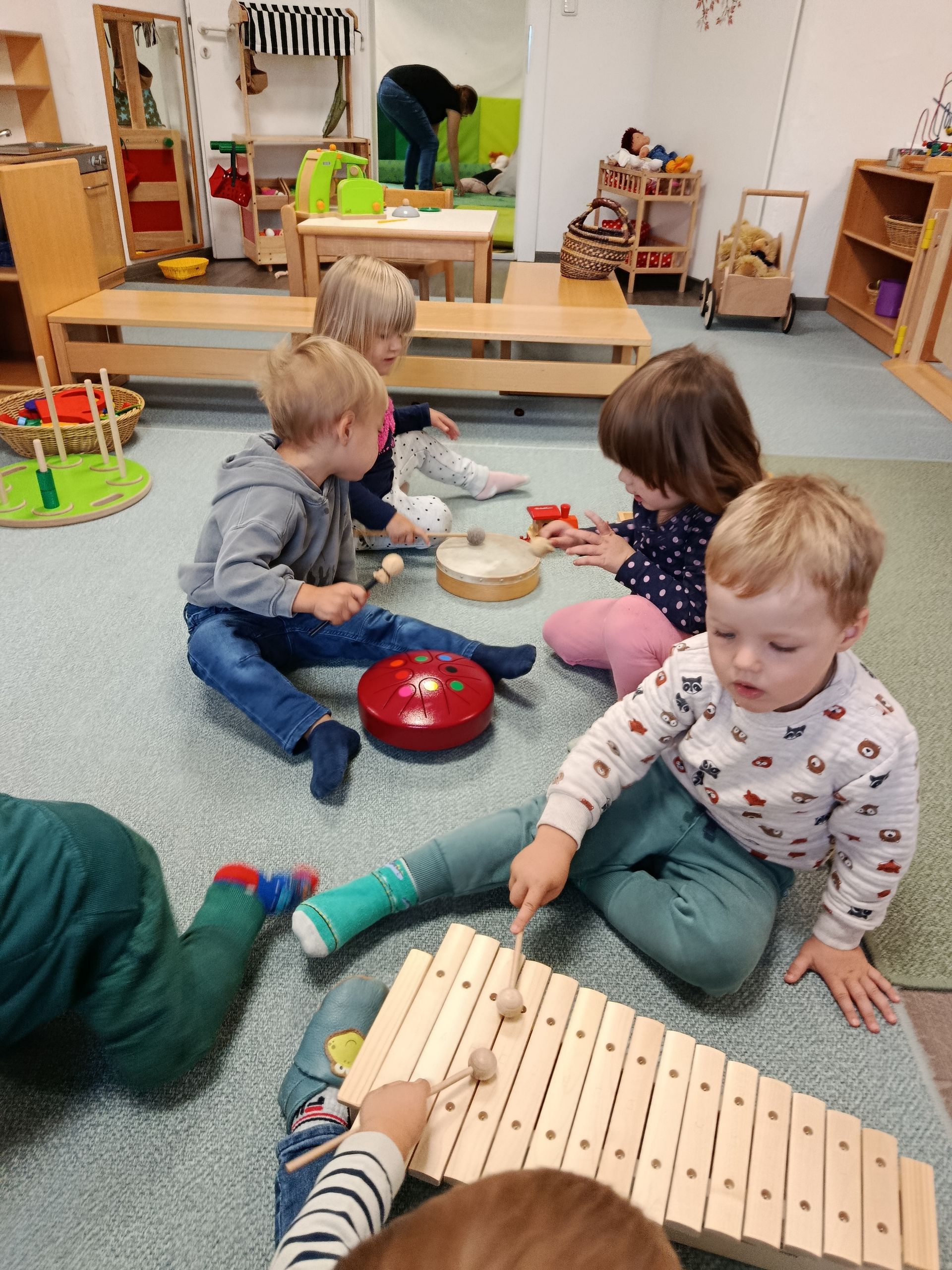 Die Kinder der Sonnengruppe haben sich in den neuen, hellen Räumlichkeiten schon sehr gut eingewöhnt. Außerdem waren sie schon fleißig mit dem Krabbelstubenbus unterwegs und durften die Umgebung erkunden – es wurden Kastanien gesammelt, Äpfel gepflückt und die Pferde auf der Weide besucht!