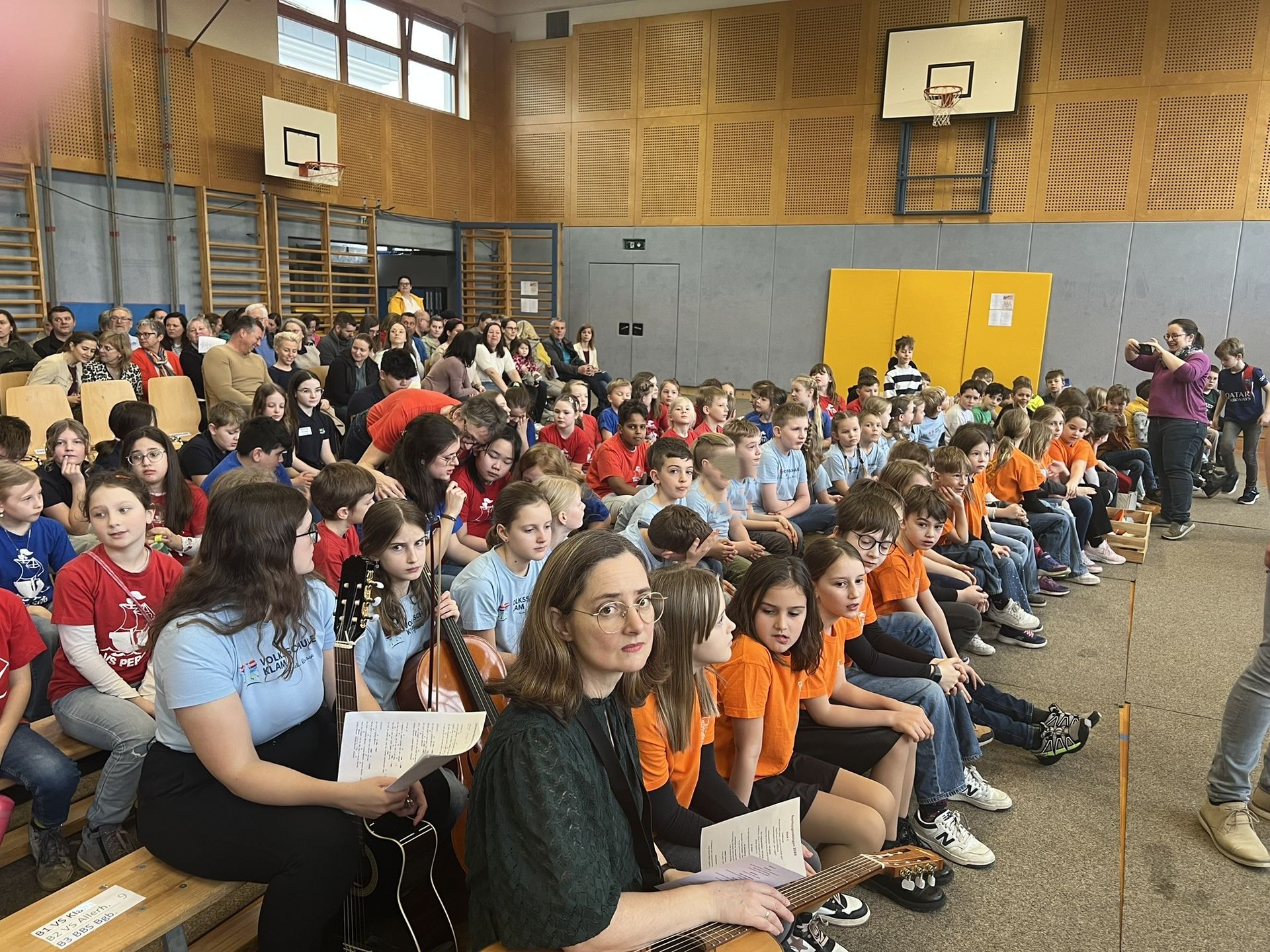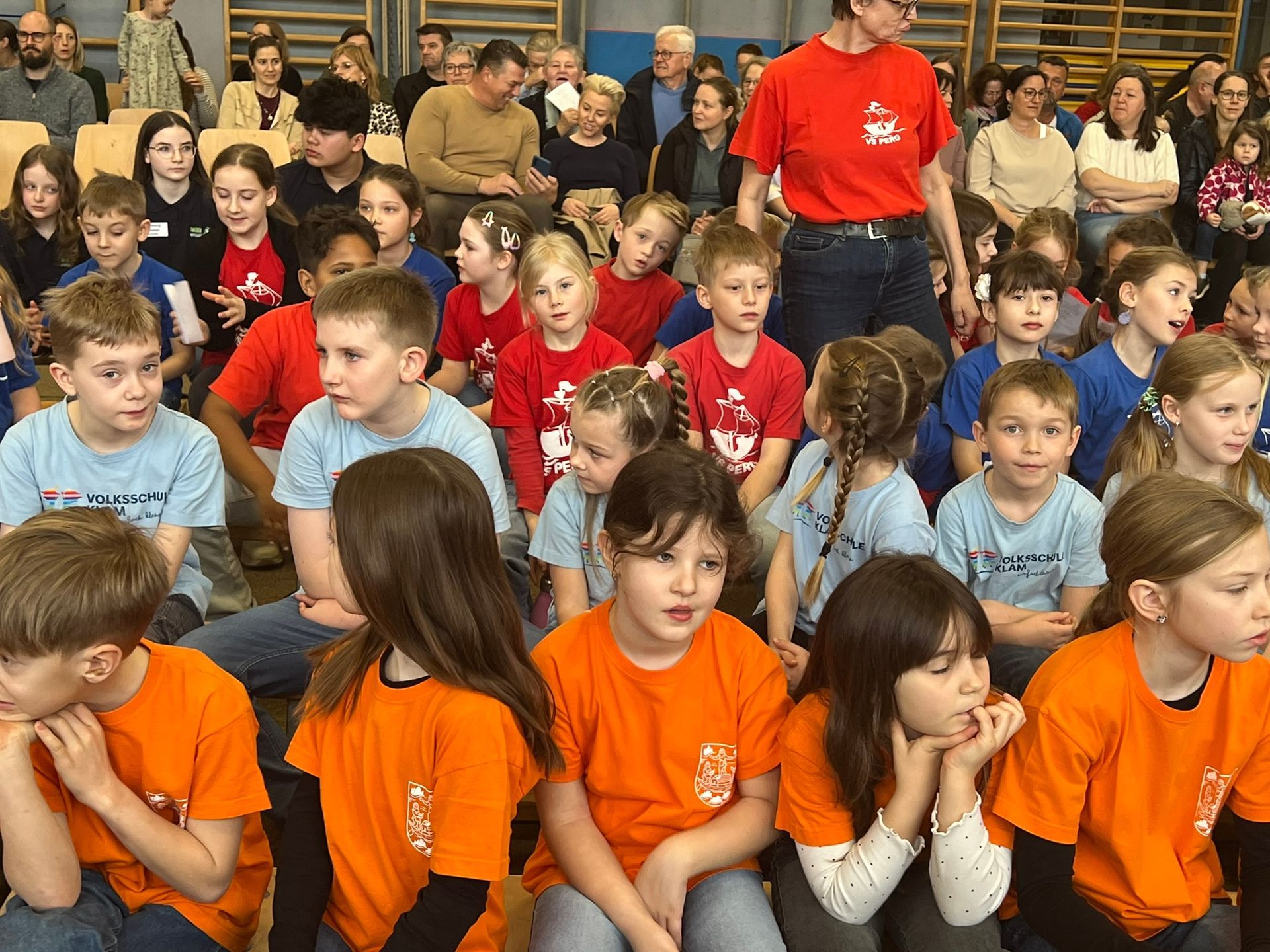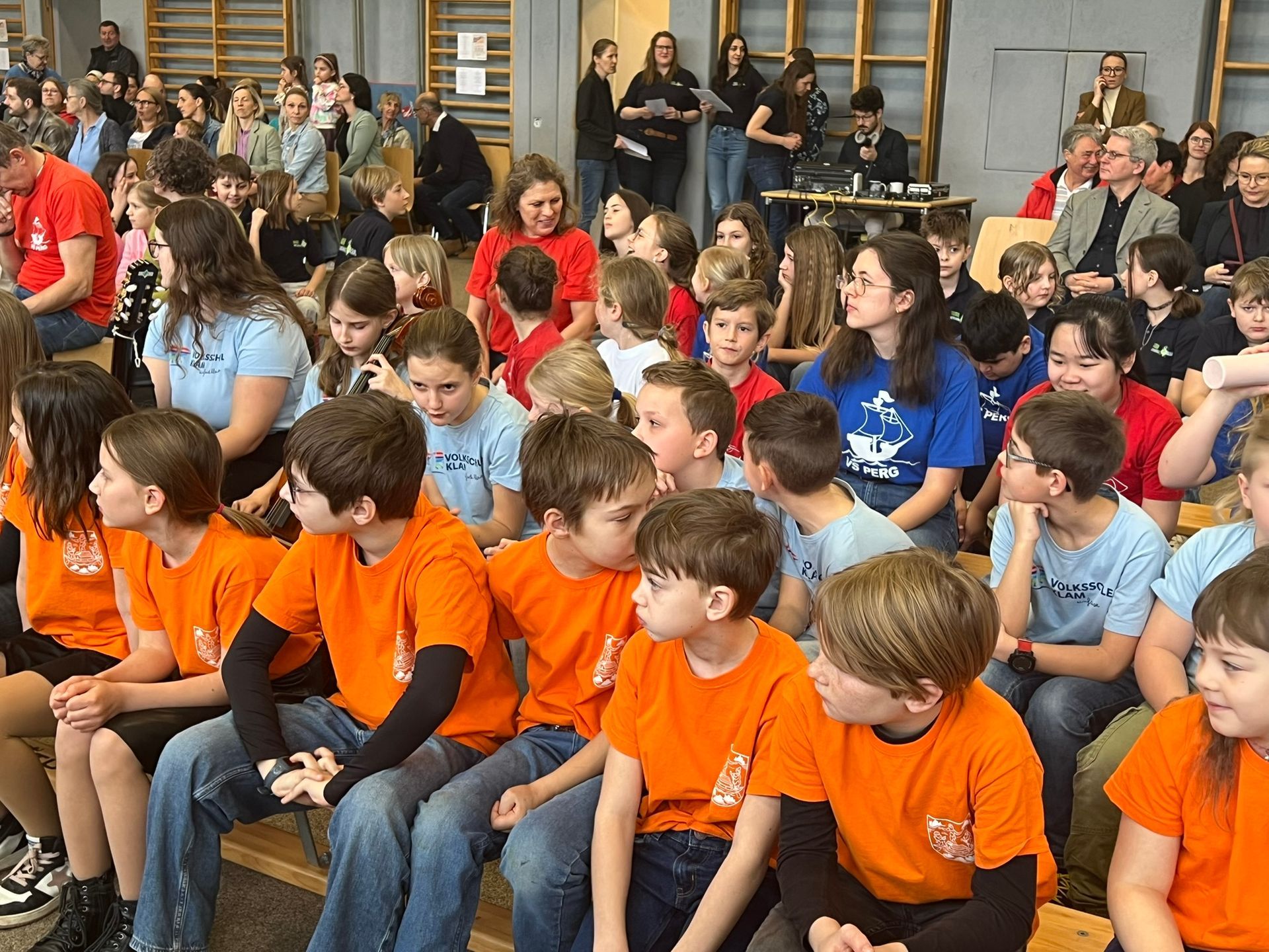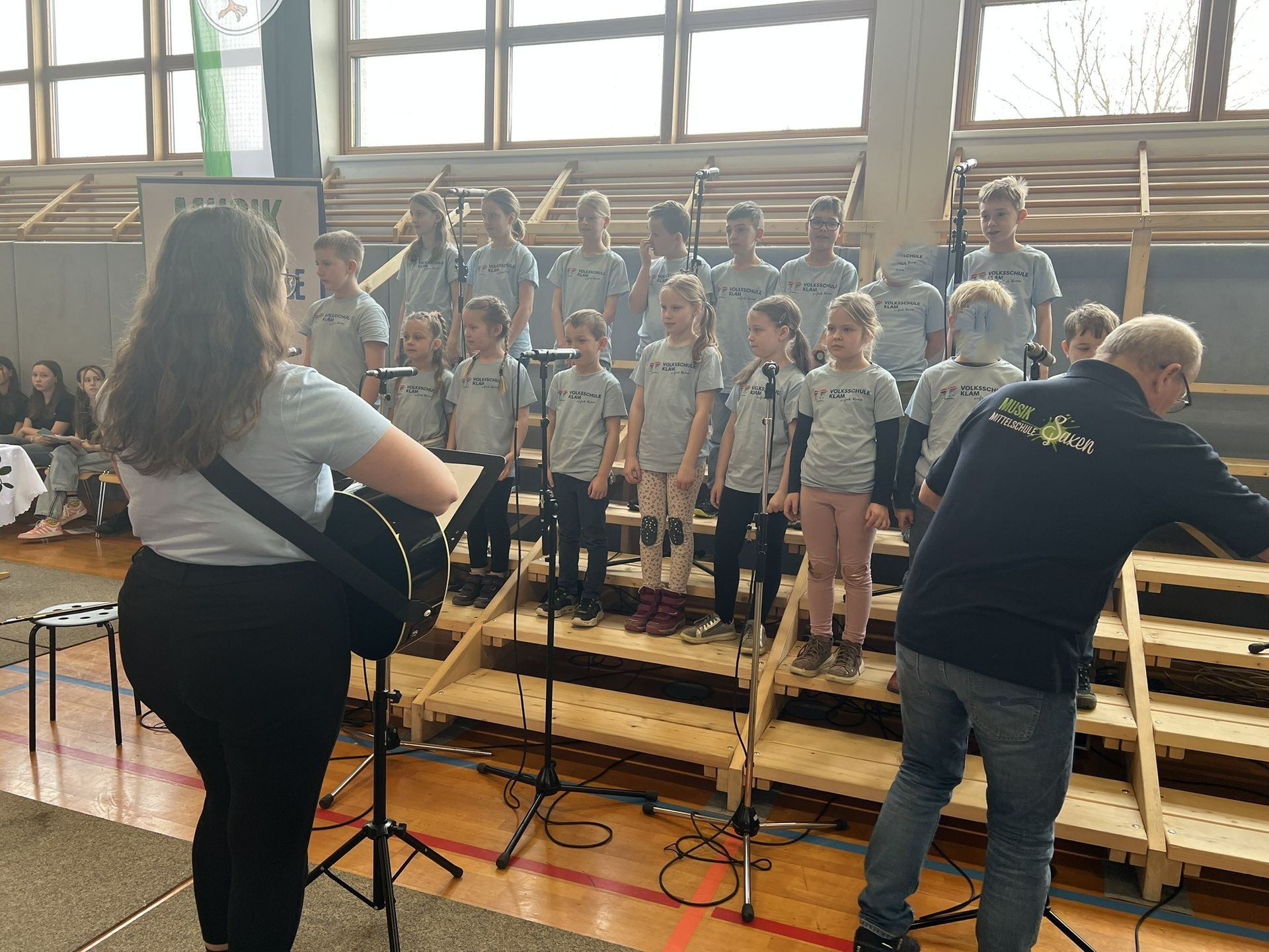 Nach dem Einsingen in einer Klasse durften die Kinder im Turnsaal auf den Bänken Platz nehmen.