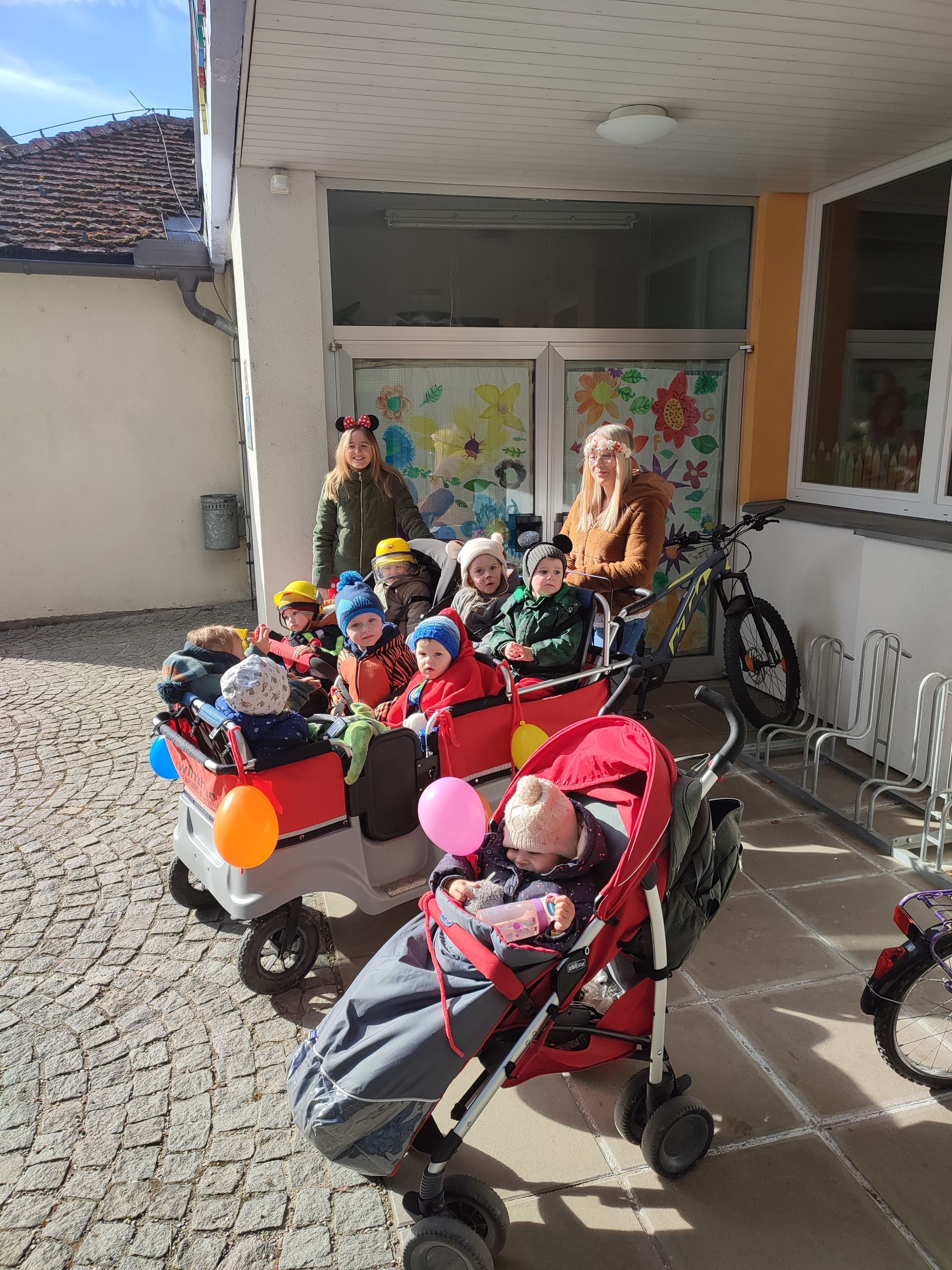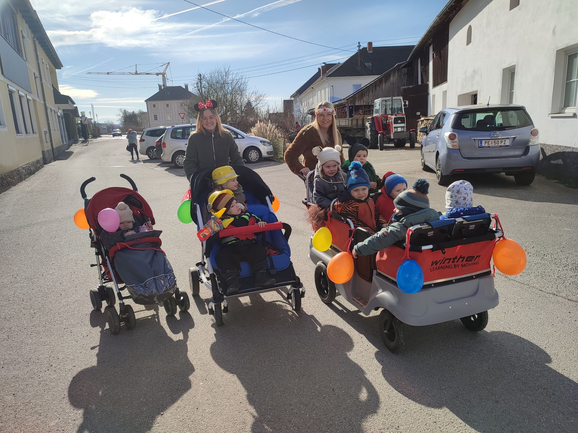 Nach der leckeren Stärkung hieß es ab in den Krabbelstubenbus und auf zur Volksschule, wo wir den Umzug der Volksschulkinder abwarteten, und die vielfältigen Kostüme der Kinder bestaunten. Danach fuhren wir, in Begleitung von lustiger Faschingsmusik, eine Runde durch den Ort und wünschten allen einen schönen Faschingsdienstag.