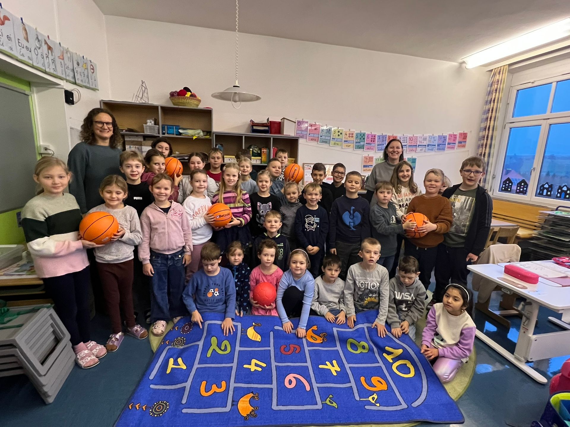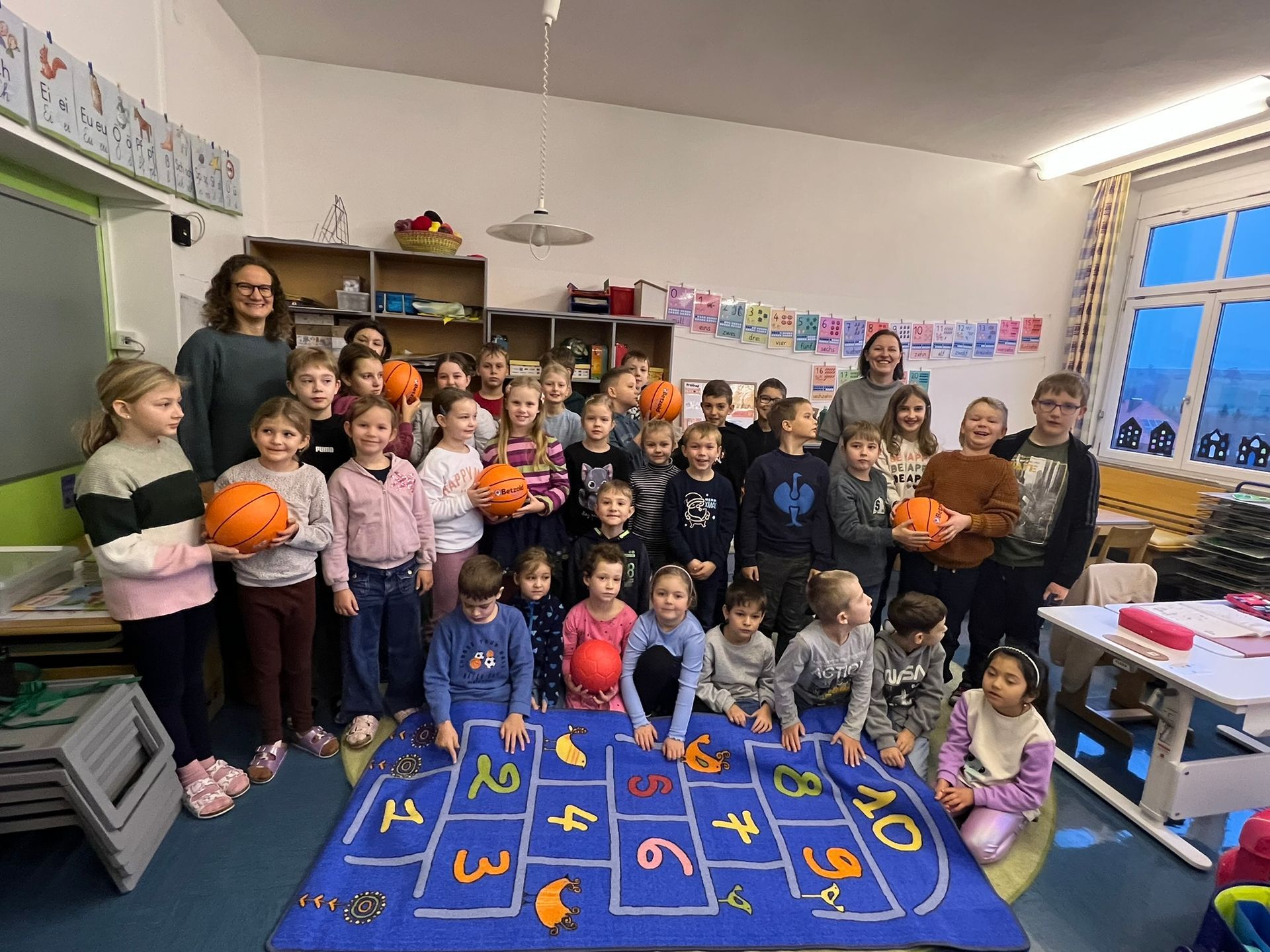 5 Basketbälle, einen Softfußball und einen Tempelhüpf- Teppich dürfen die Kinder nun in den Sportstunden und Pausen verwenden.