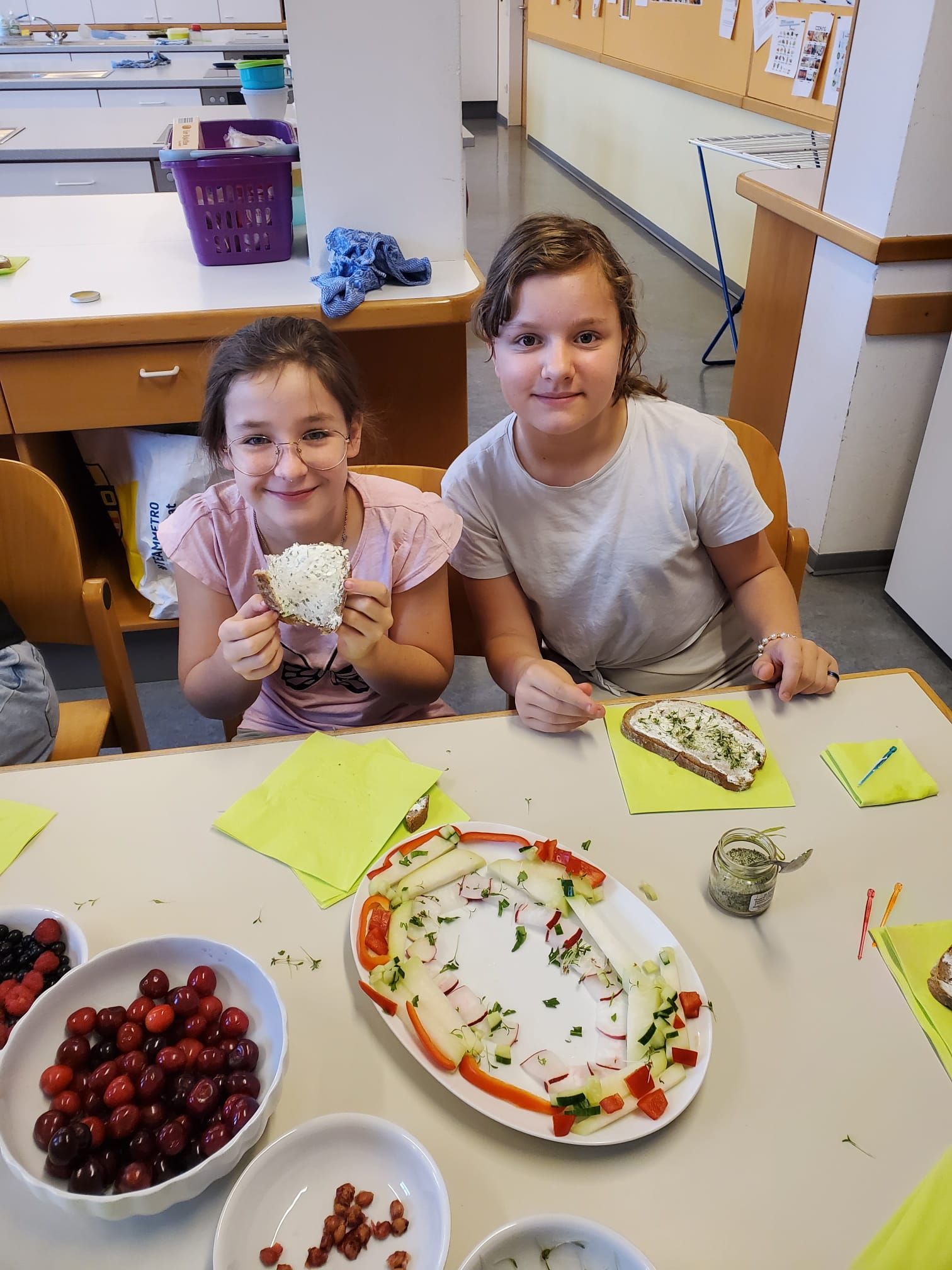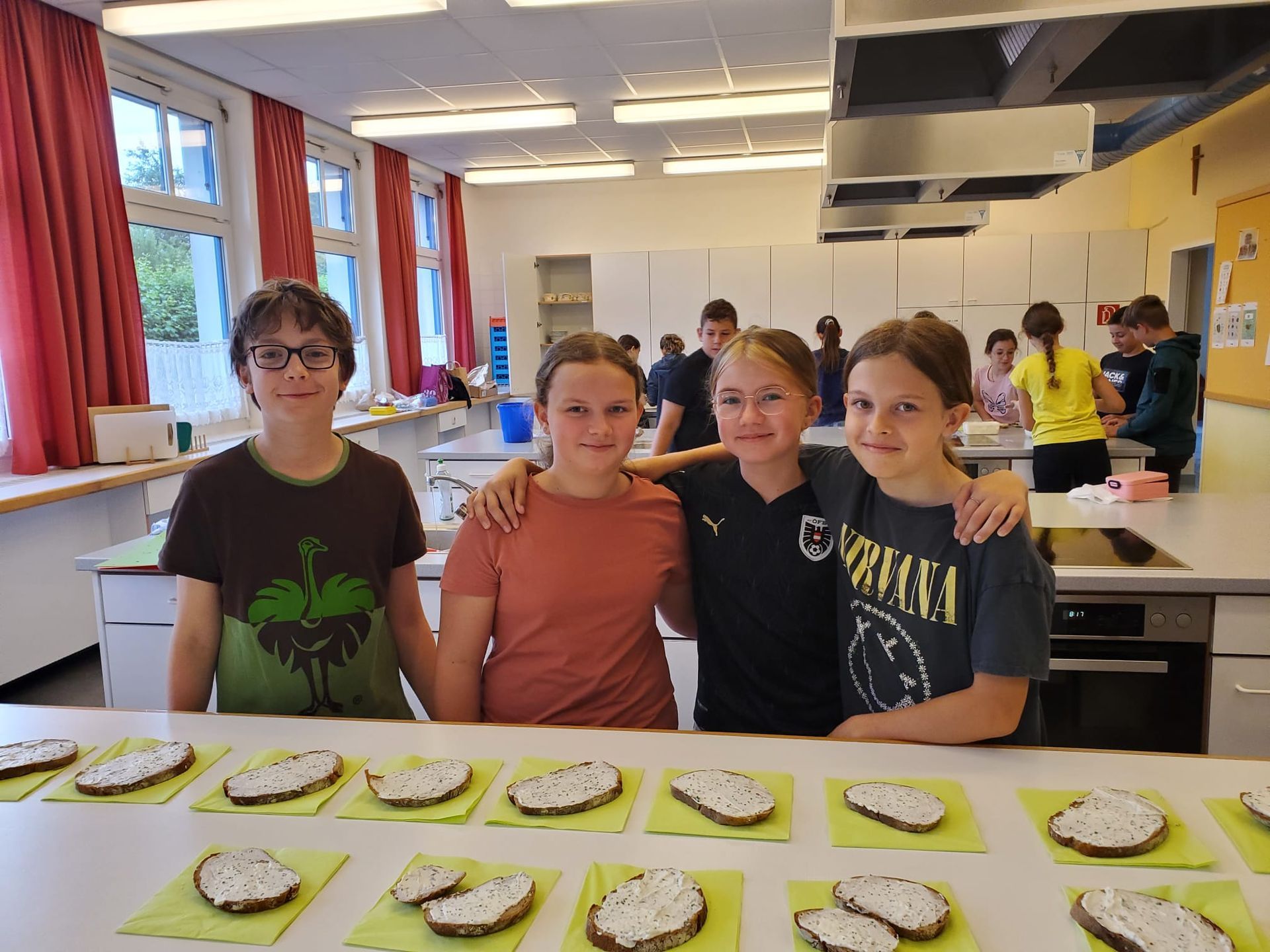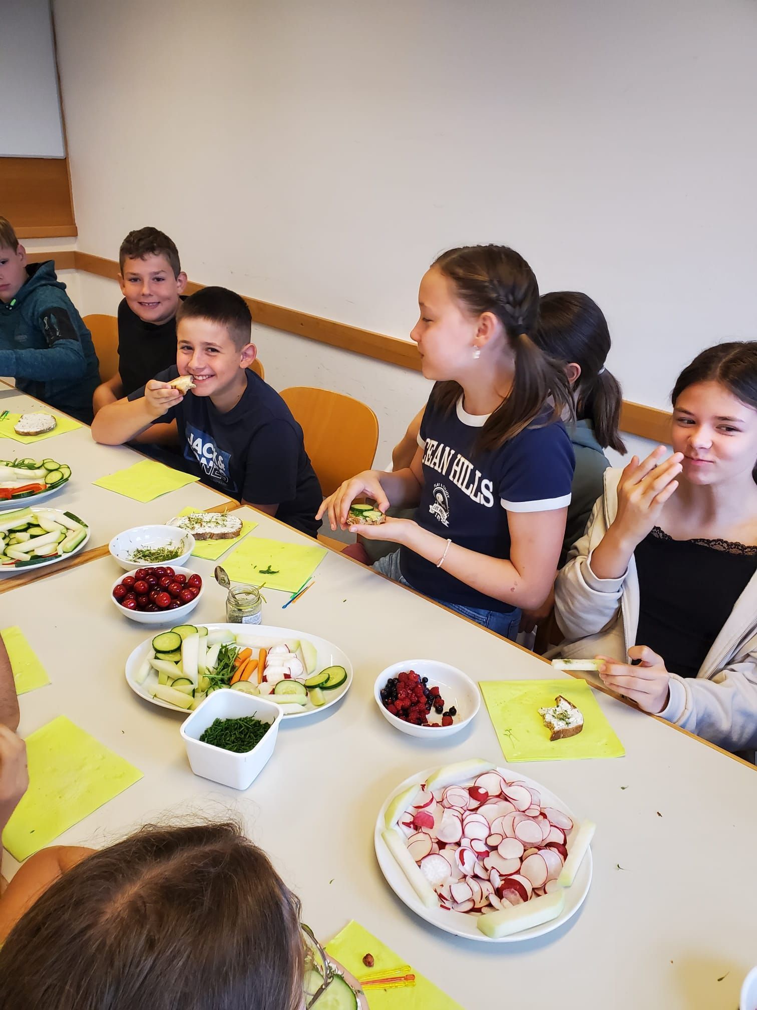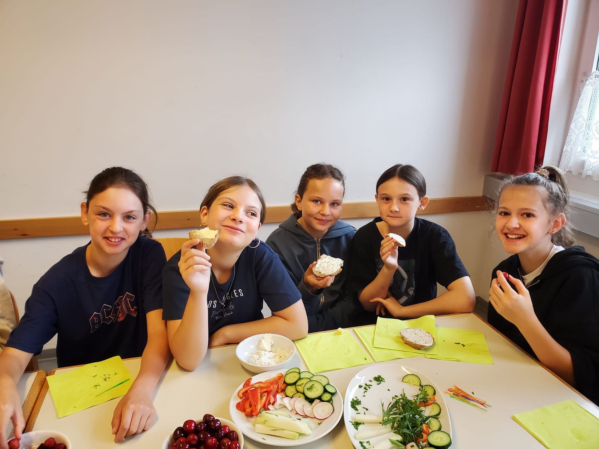 In Rahmen de s Biologieunterrichts wurde in der 1. Klasse unter Anleitung von Frau Christine Wallner ein gesunder Jausentisch zubereitet.....