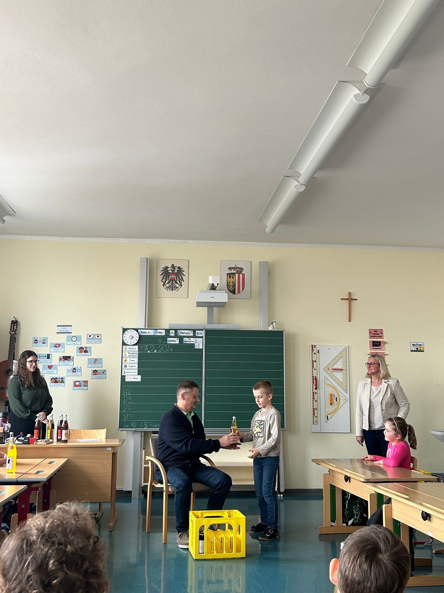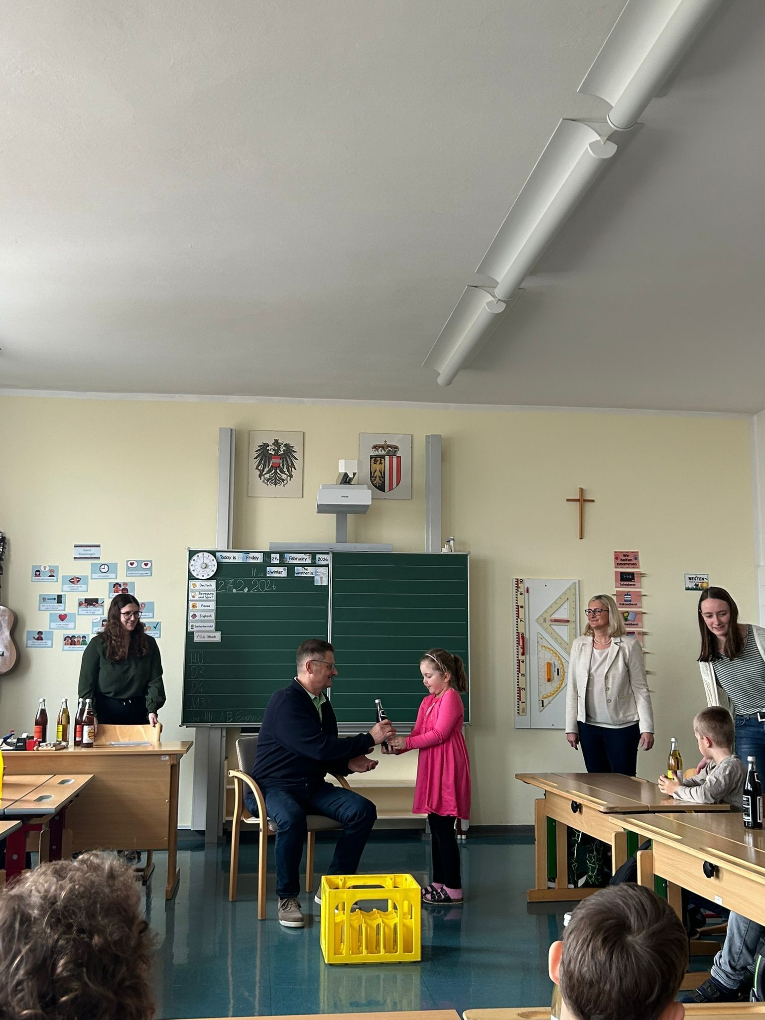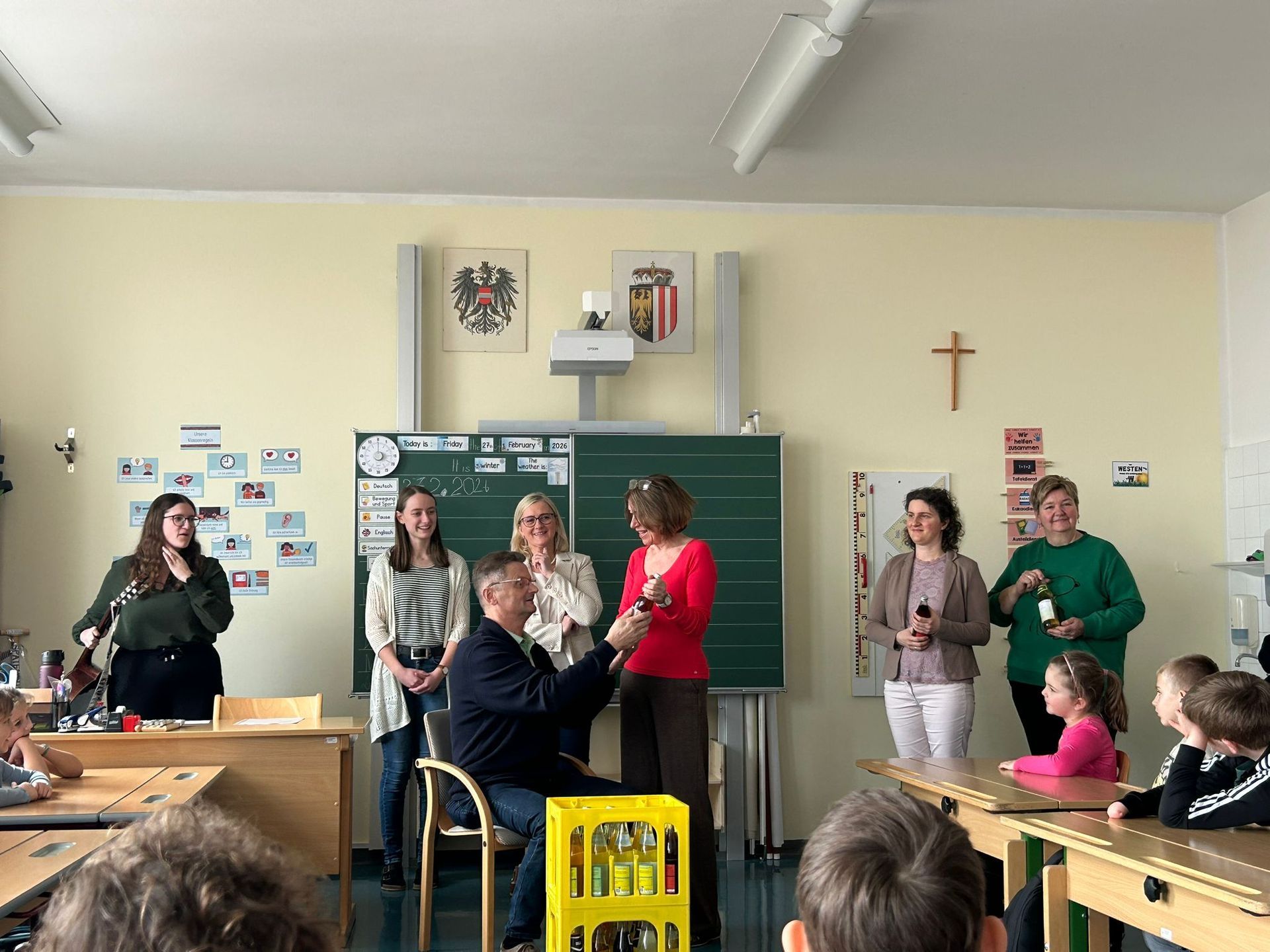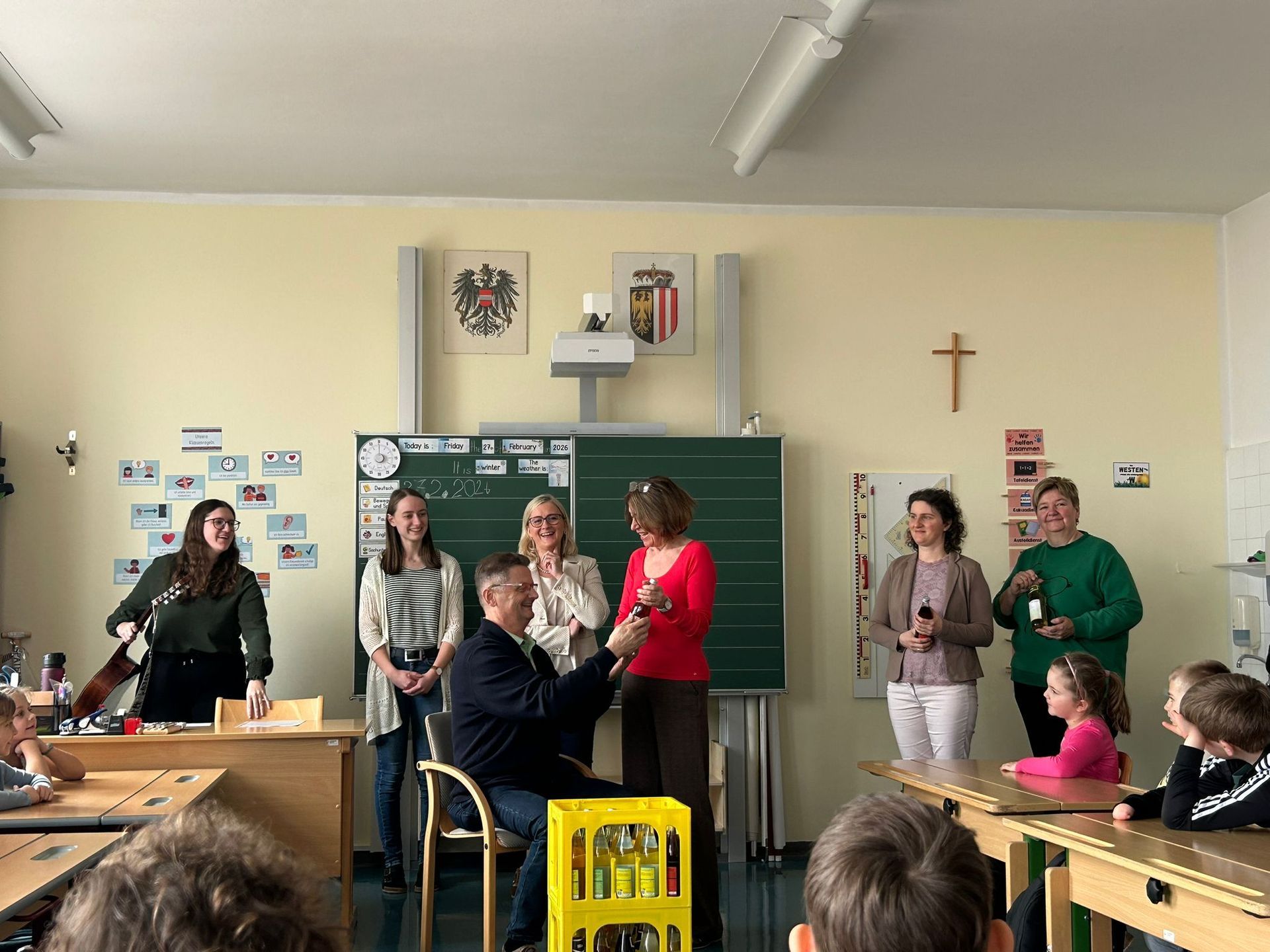 27. Februar 2026 bei einer kleinen Abschiedsfeier für seinen tollen Einsatz. Die Schüler und Schülerinnen gestalteten Herbert Etiketten für seine Lieblingslimonaden und sangen ihm 2 Lieder vor.