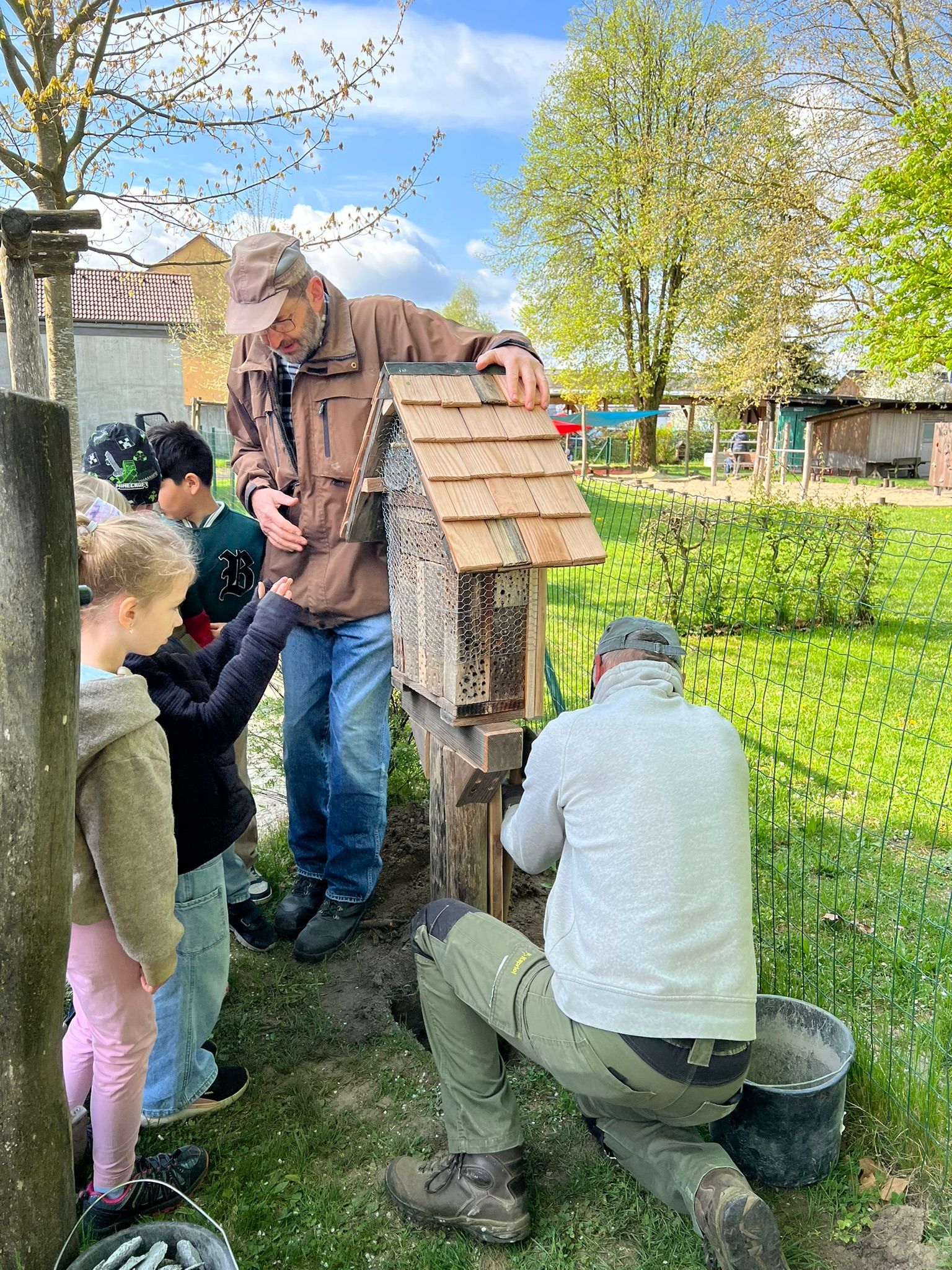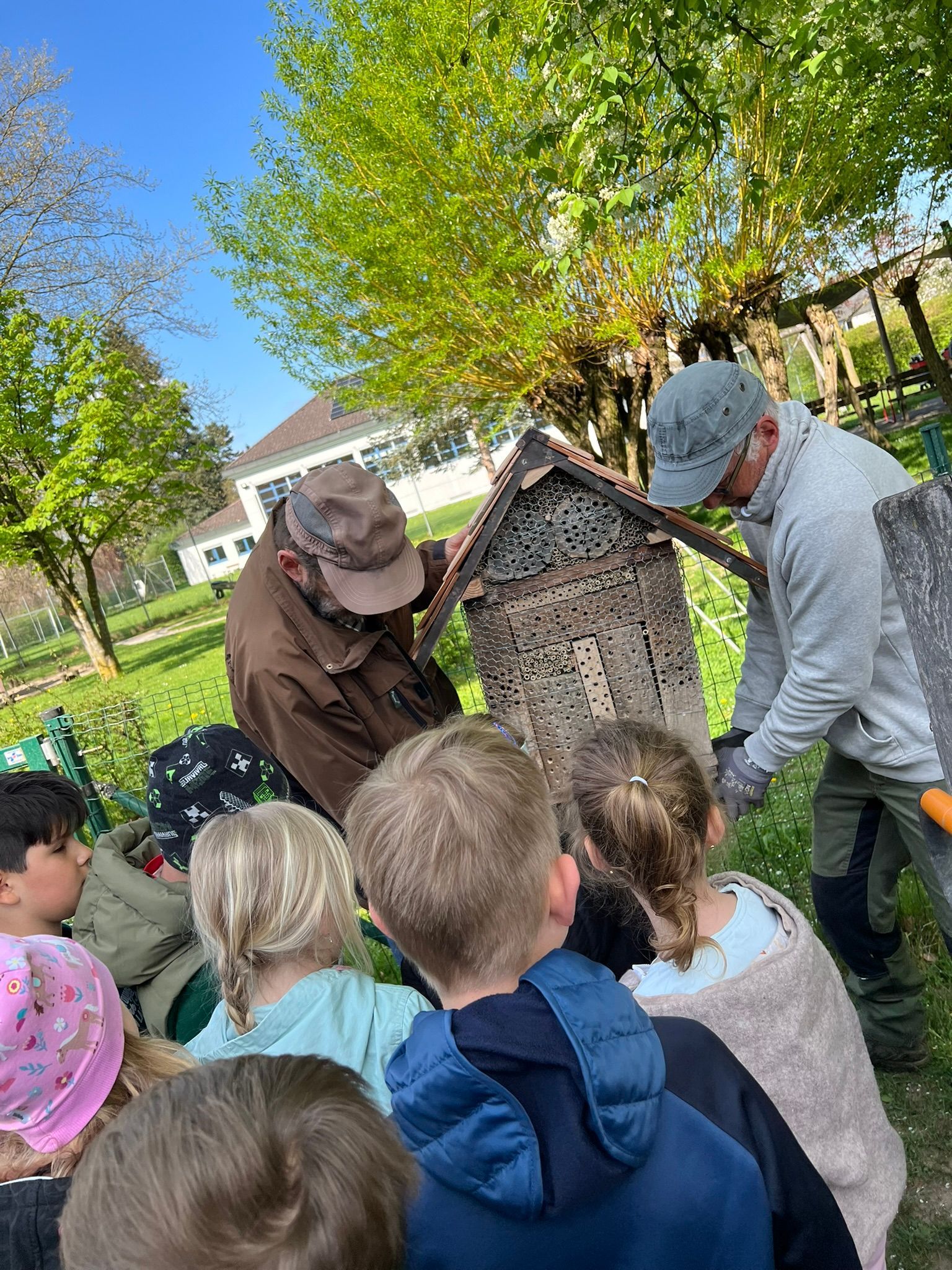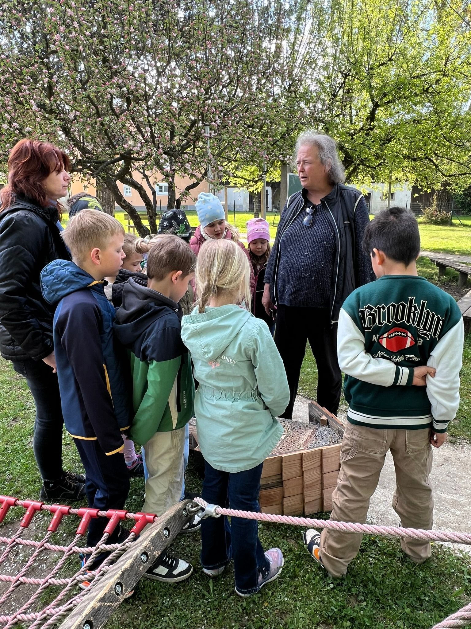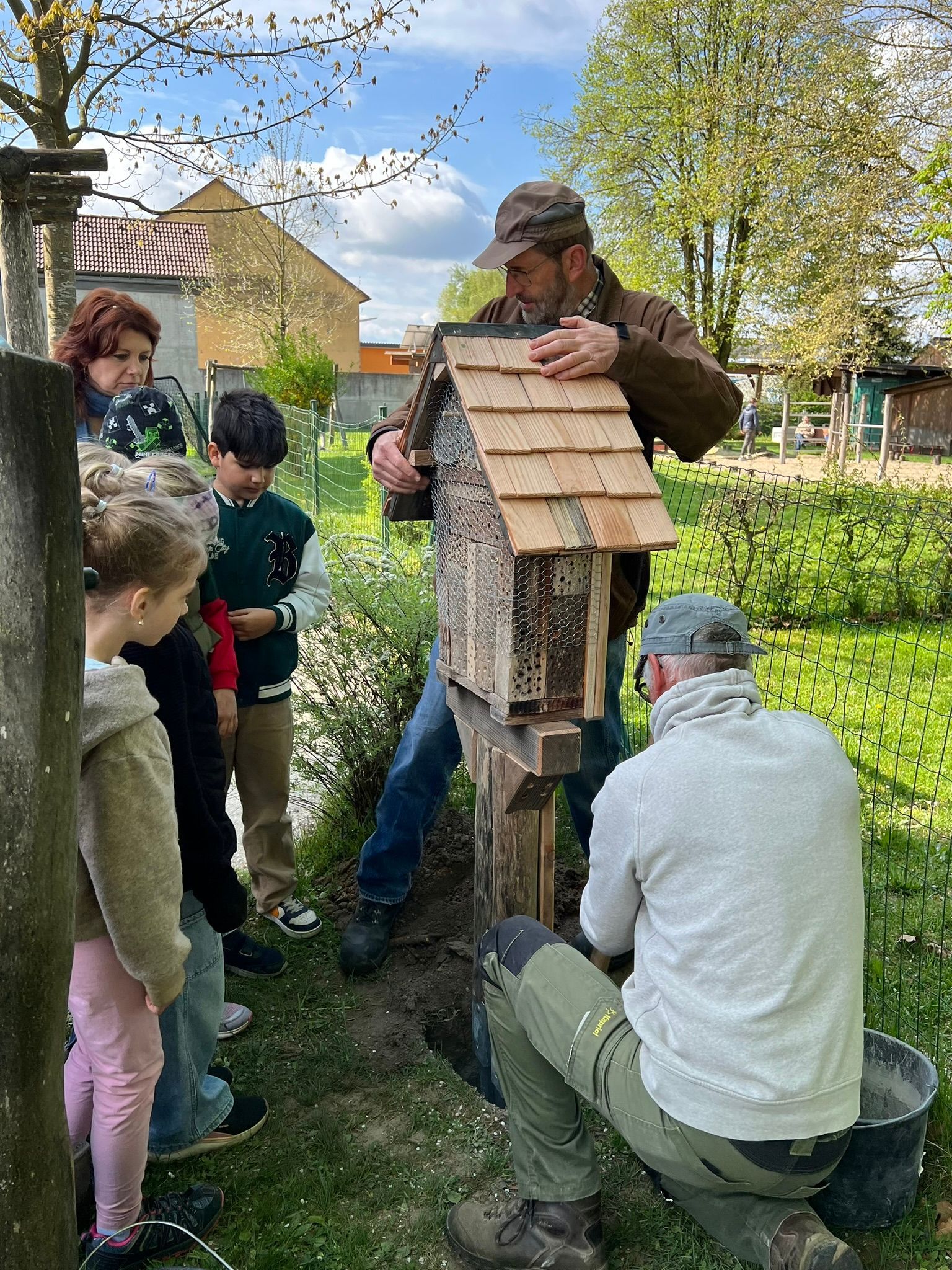 Drei Mitarbeiter des Naturschutzbundes OÖ besuchten am Montag, 20. April 2026, die Kinder der 2. Klasse im Sachunterricht. Hannes Schwaiger aus Saxen, Ira Orlicek aus Grein und Rainer Knothe aus Perg stellten gemeinsam mit den Kindern ein Insektenhotel auf. Der Bau und die Funktion dieses besonderen Hauses wurde den Kindern genau erklärt. In nächster Zeit sollen viele Wildbienen und andere Insekten in das Hotel einziehen. Die Schüler:innen müssen es nun genau beobachten und frei von Spinnweben halten.