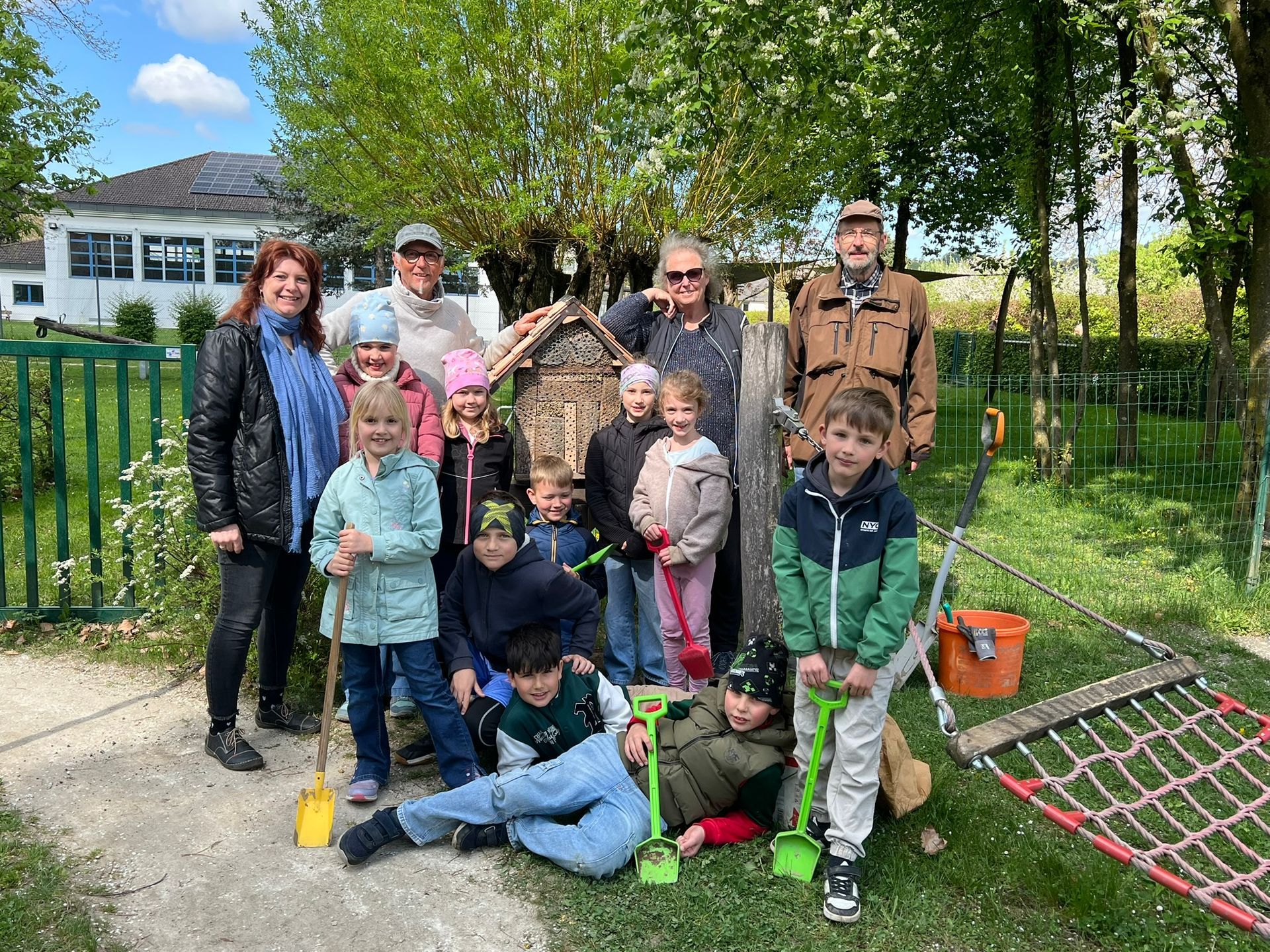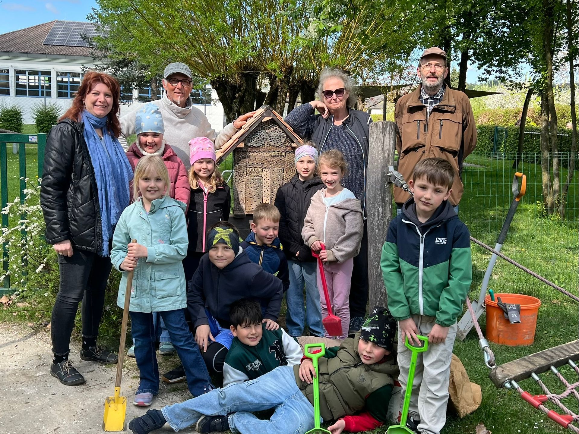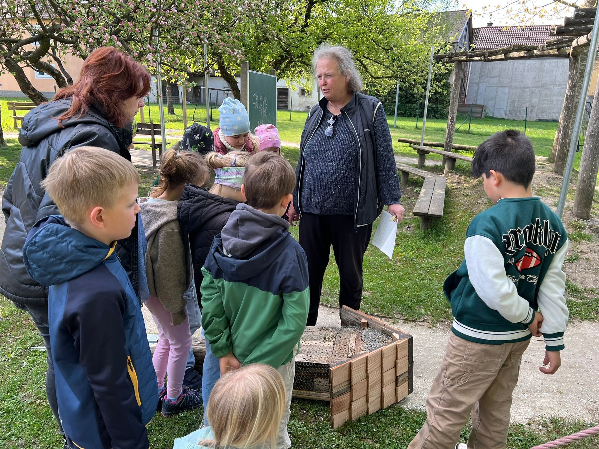 Drei Mitarbeiter des Naturschutzbundes OÖ besuchten am Montag, 20. April 2026, die Kinder der 2. Klasse im Sachunterricht. Hannes Schwaiger aus Saxen, Ira Orlicek aus Grein und Rainer Knothe aus Perg stellten gemeinsam mit den Kindern ein Insektenhotel auf. Der Bau und die Funktion dieses besonderen Hauses wurde den Kindern genau erklärt. In nächster Zeit sollen viele Wildbienen und andere Insekten in das Hotel einziehen. Die Schüler:innen müssen es nun genau beobachten und frei von Spinnweben halten.
