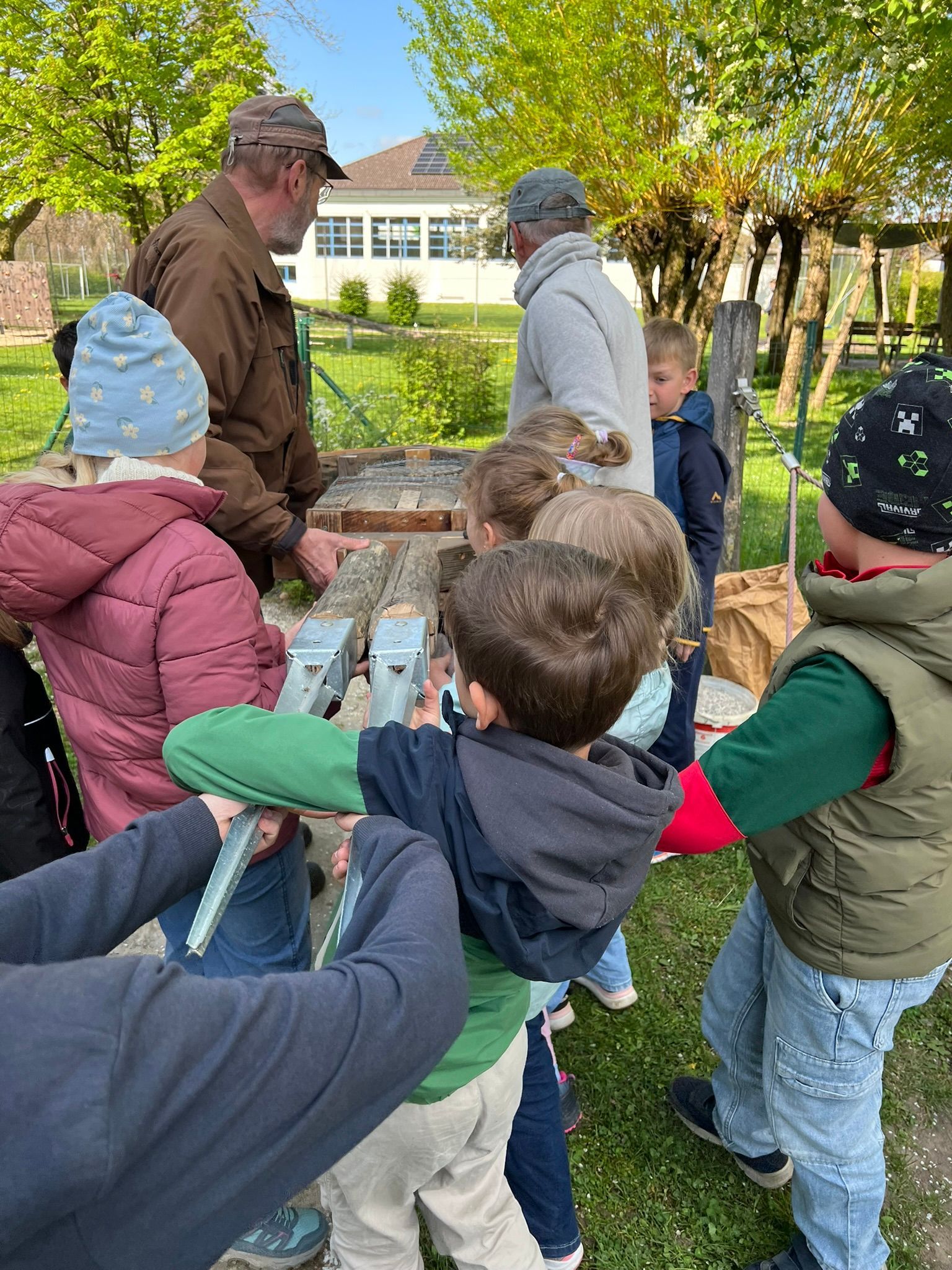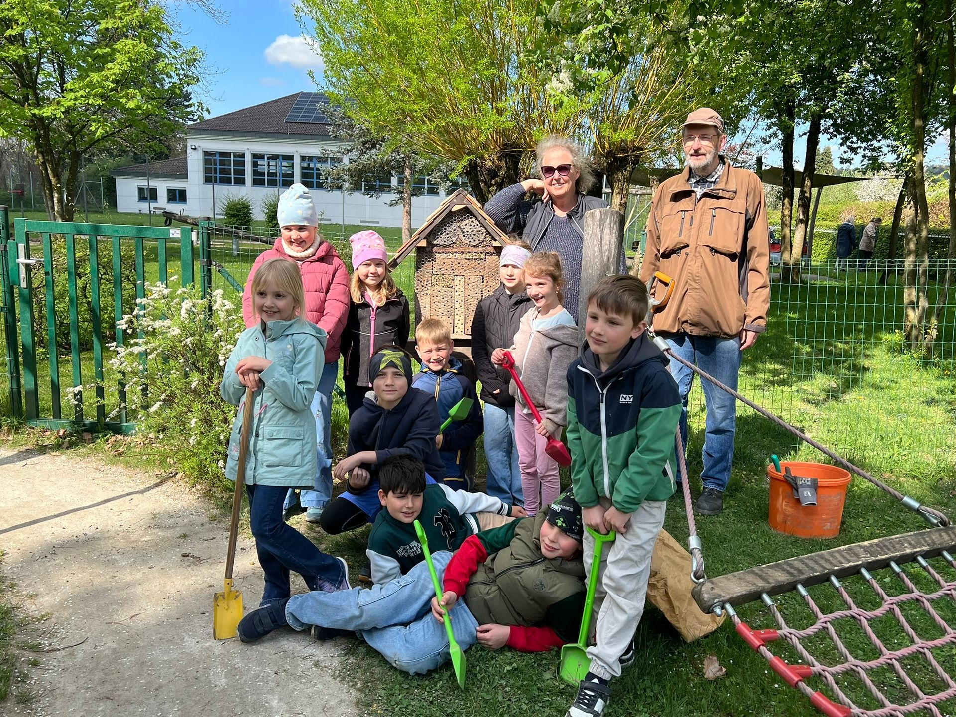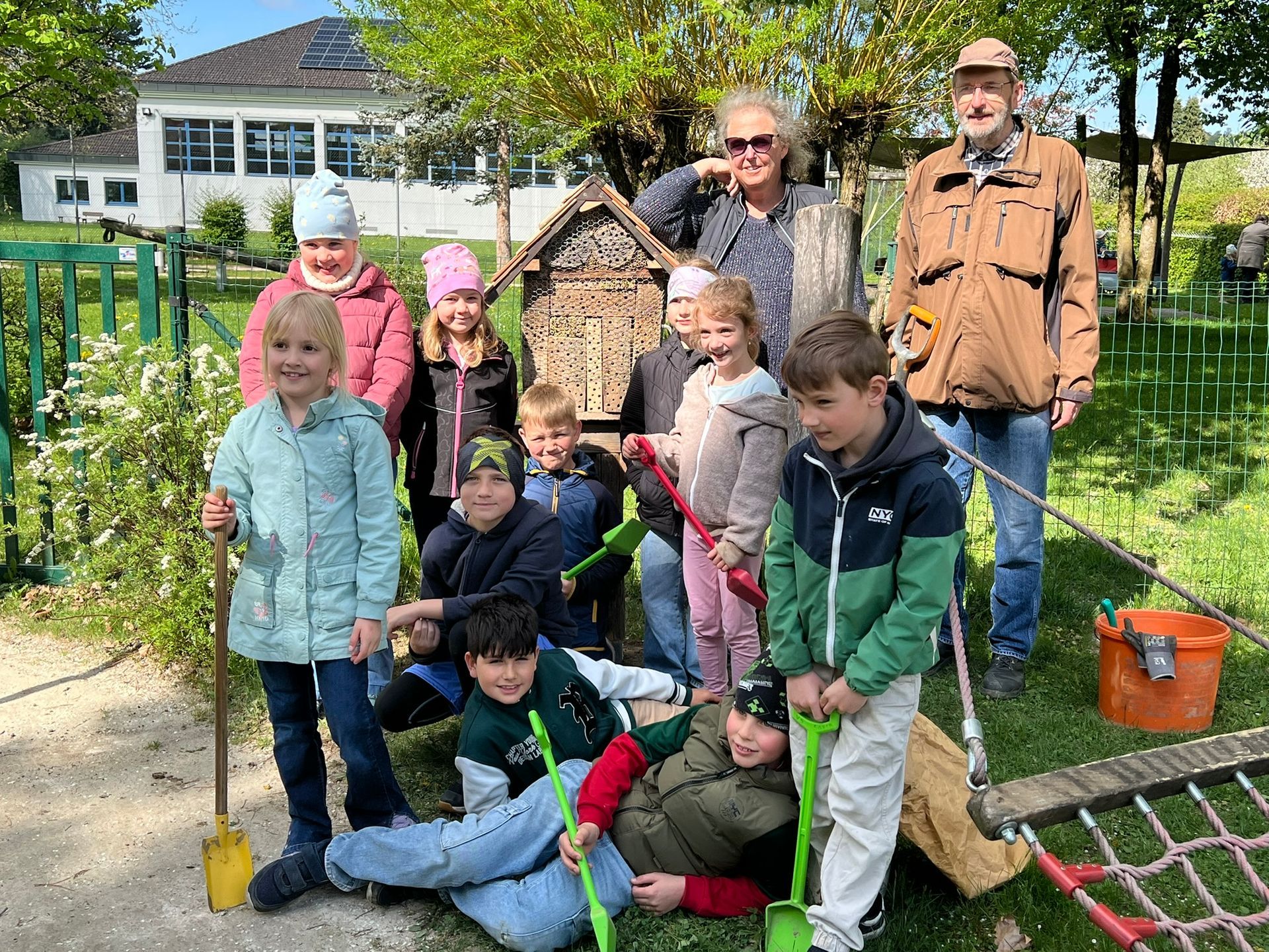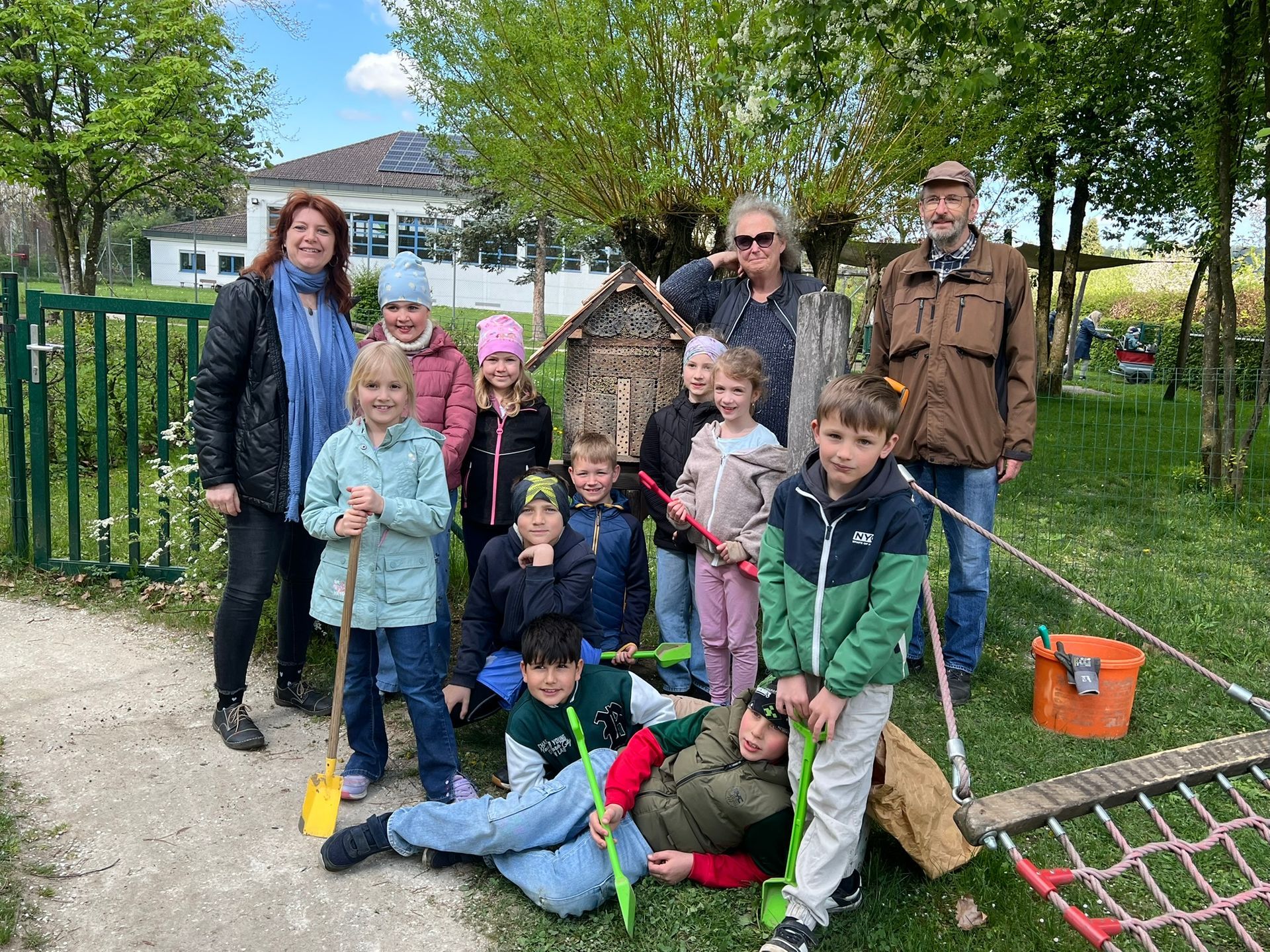 Drei Mitarbeiter des Naturschutzbundes OÖ besuchten am Montag, 20. April 2026, die Kinder der 2. Klasse im Sachunterricht. Hannes Schwaiger aus Saxen, Ira Orlicek aus Grein und Rainer Knothe aus Perg stellten gemeinsam mit den Kindern ein Insektenhotel auf. Der Bau und die Funktion dieses besonderen Hauses wurde den Kindern genau erklärt. In nächster Zeit sollen viele Wildbienen und andere Insekten in das Hotel einziehen. Die Schüler:innen müssen es nun genau beobachten und frei von Spinnweben halten.