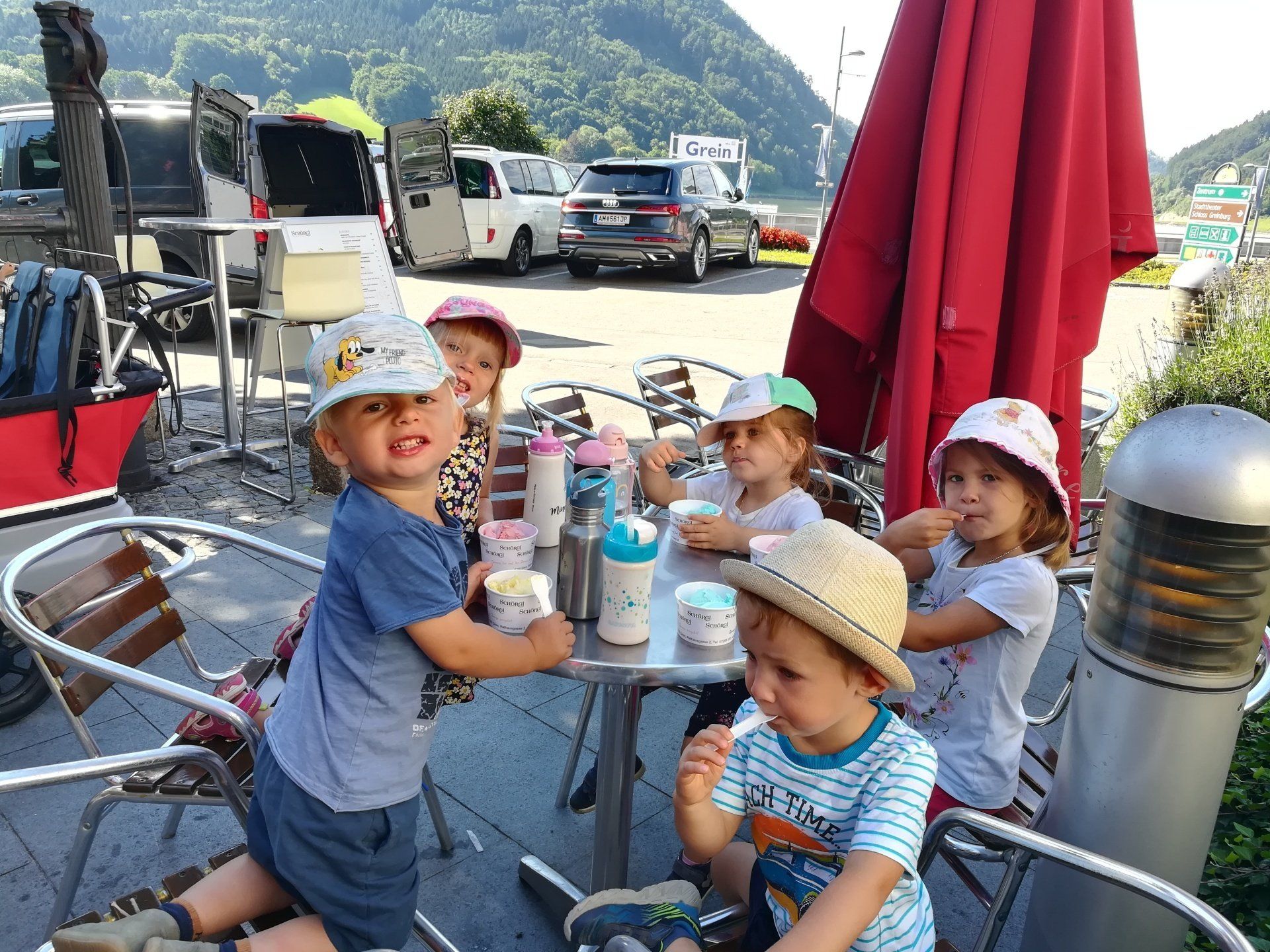 Auch in diesem Jahr machten wir mit den Kindern der Krabbelstube einen Ausflug mit dem Zug nach Grein und verbrachten dort den Vormittag. Erste Station war der große Spielplatz, wo wir uns nach ausgiebigen Toben unsere Jause schmecken ließen. Gestärkt ging die Reise weiter zum Eissalon Schörgi auf ein leckeres Eis - die Freude war groß! Auf dem Rückweg zum Bahnhof machten wir auch noch auf dem Motorikpark halt, wo die Kinder geschickt über die verschiedenen Hindernisse turnten. Es war ein sehr schöner und abwechslungsreicher Ausflug, der den Kindern sicher lange in Erinnerung bleiben wird!