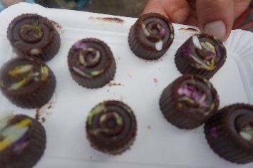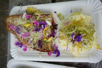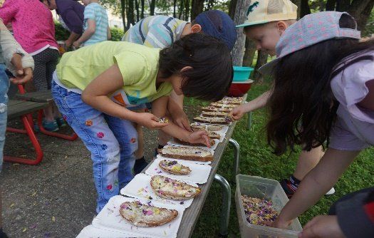 Ein paar sehr mutige Kinder probierten sogar eine rohe Brennnessel. Wieder zurück verarbeiteten sie die Wildkräuter zu einen leckeren Picknick und ließen sich Blütenbrote, Kartoffelsalat mit Löwenzahn, und eine köstliche Blütenschokolade schmecken. Auch ein Blütensalz durfte sich jedes Kind machen und mit Nachhause nehmen.