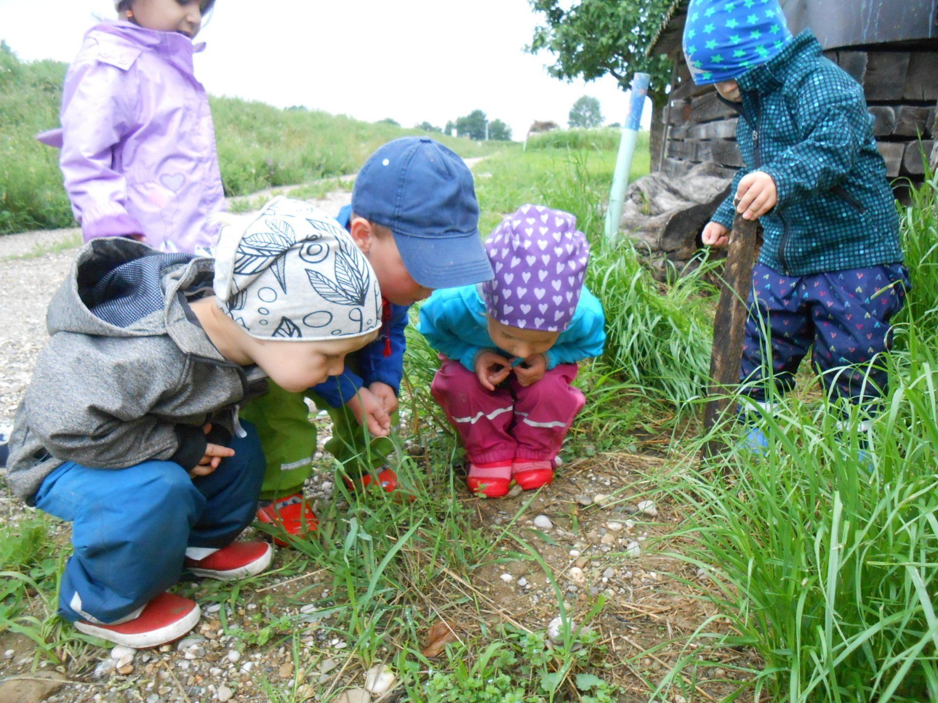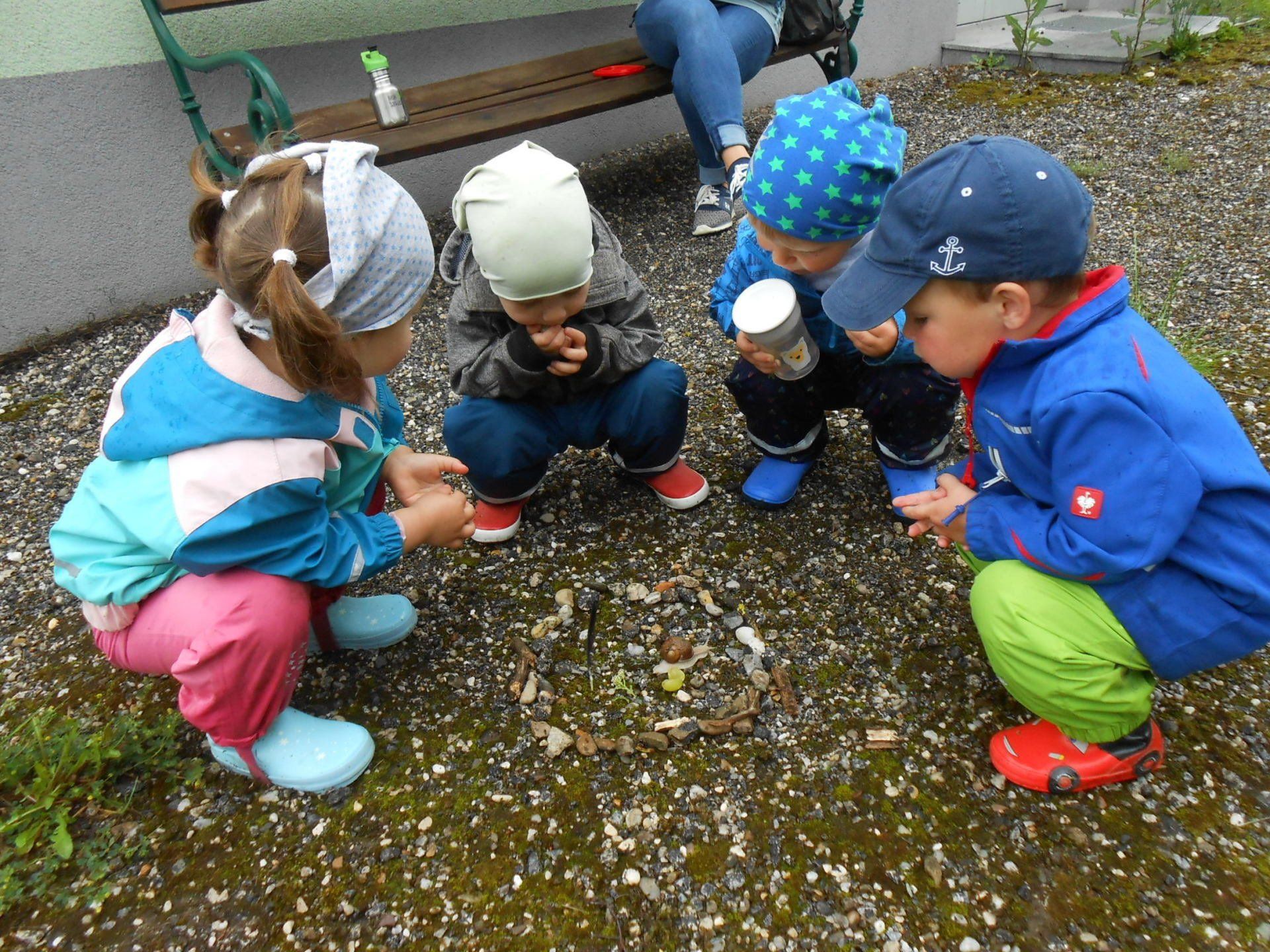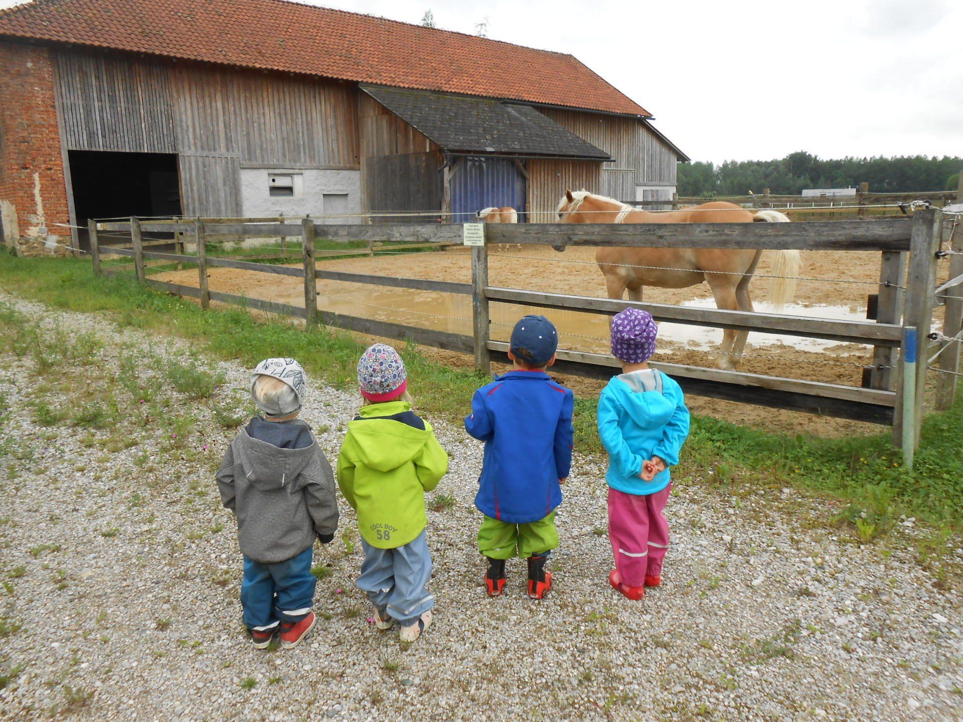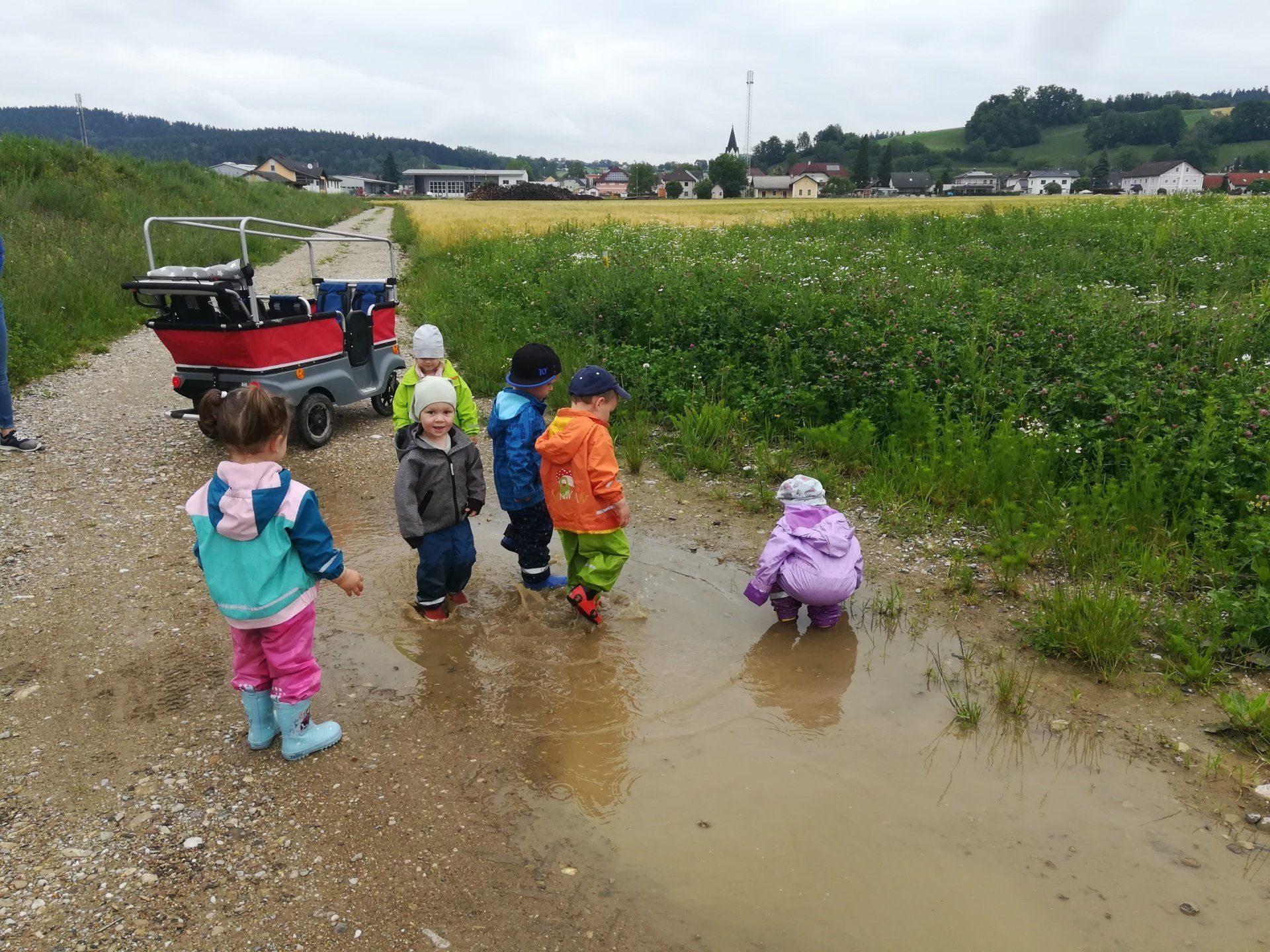 Mit unseren Krabbelstubenbussen, und auch fleißig zu Fuß, sind wir viel draußen unterwegs. Unsere Ausflüge führen uns durch den Wald, über Wiesen und Wege und zu den verschiedensten Spielplätzen in der Umgebung. Wir besuchen die Kühe am Bauernhof, die Pferde auf der Weide und entdecken am Wegesrand viele große und kleine Schnecken. Außerdem beobachten wir die Traktoren auf den Feldern, den Bagger auf der Baustelle und den regelmäßig vorbeifahrenden Zug. Draußen in der Natur gibt es immer was zu sehen!