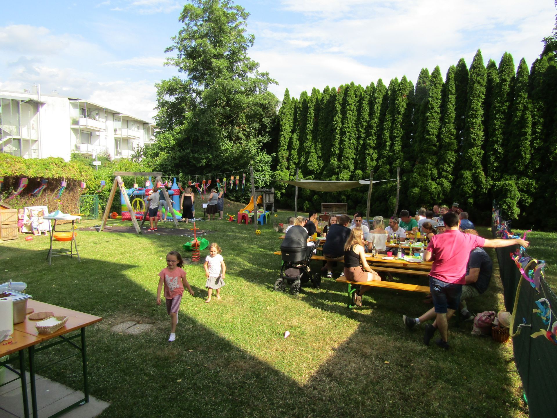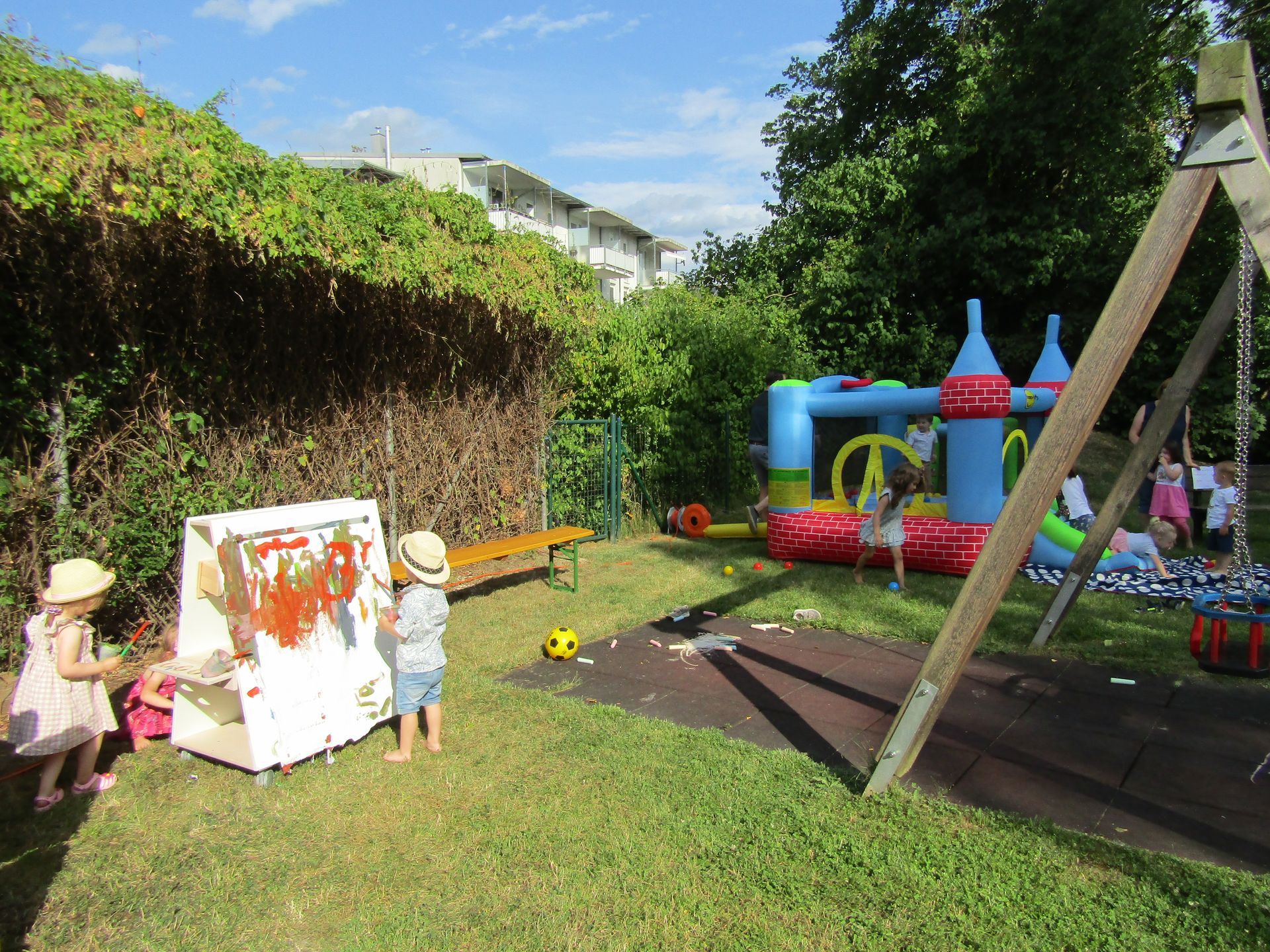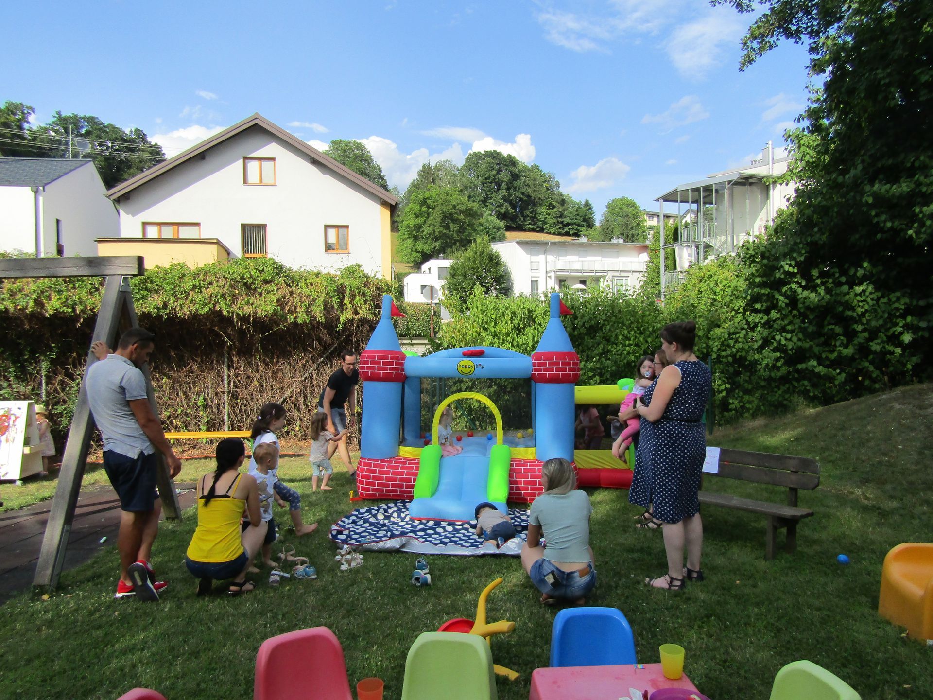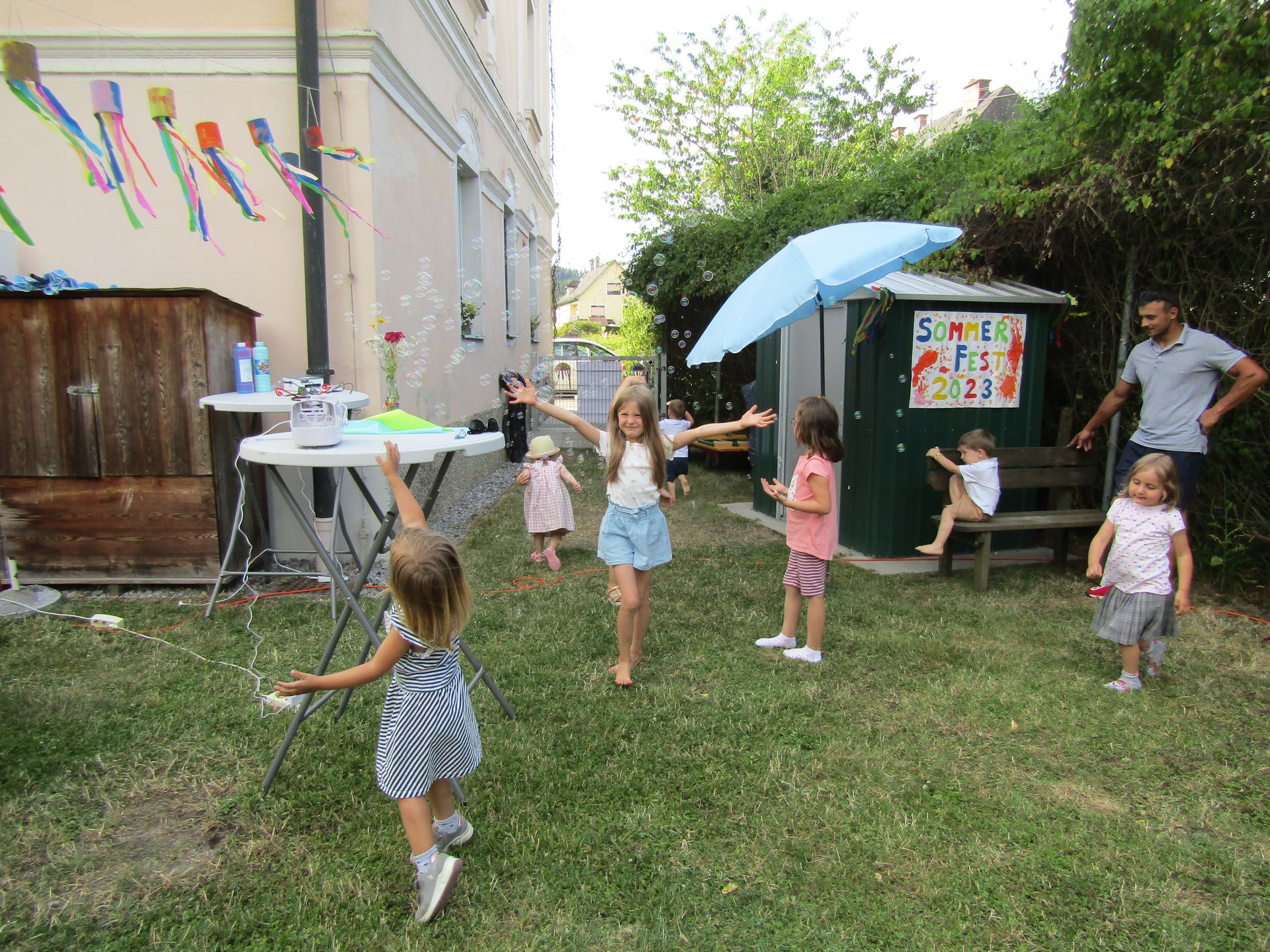 Bei wunderschönem Sommerwetter feierten wir im Garten der Krabbelstube unser jährliches Sommerfest. Gemeinsam mit den Kindern wurde eine bunte Gartendekoration gebastelt und Kuchen und Kekse gebacken. Zur Begrüßung durften alle Familien ein lustiges Familienfoto in der "Fotobox" machen. Beim Eröffnungslied "Schmetterling du kleines Ding" konnten die Kinder den stolzen Eltern ihre Tanzkünste in schönen Schmetterlingskostümen vorführen. Danach wurde bei Bratwürstel, Kuchen und Kaffee gemütlich geplaudert, während die Kinder bei den Spielestationen beschäftigt waren. Es gab Seifenblasen, eine Malwand, eine Verkleidungsecke und als großes Highlight eine Hüpfburg! Herzlichen Dank an alle Familien die mit uns gefeiert haben und dieses Fest zu etwas ganz Besonderem gemacht haben!