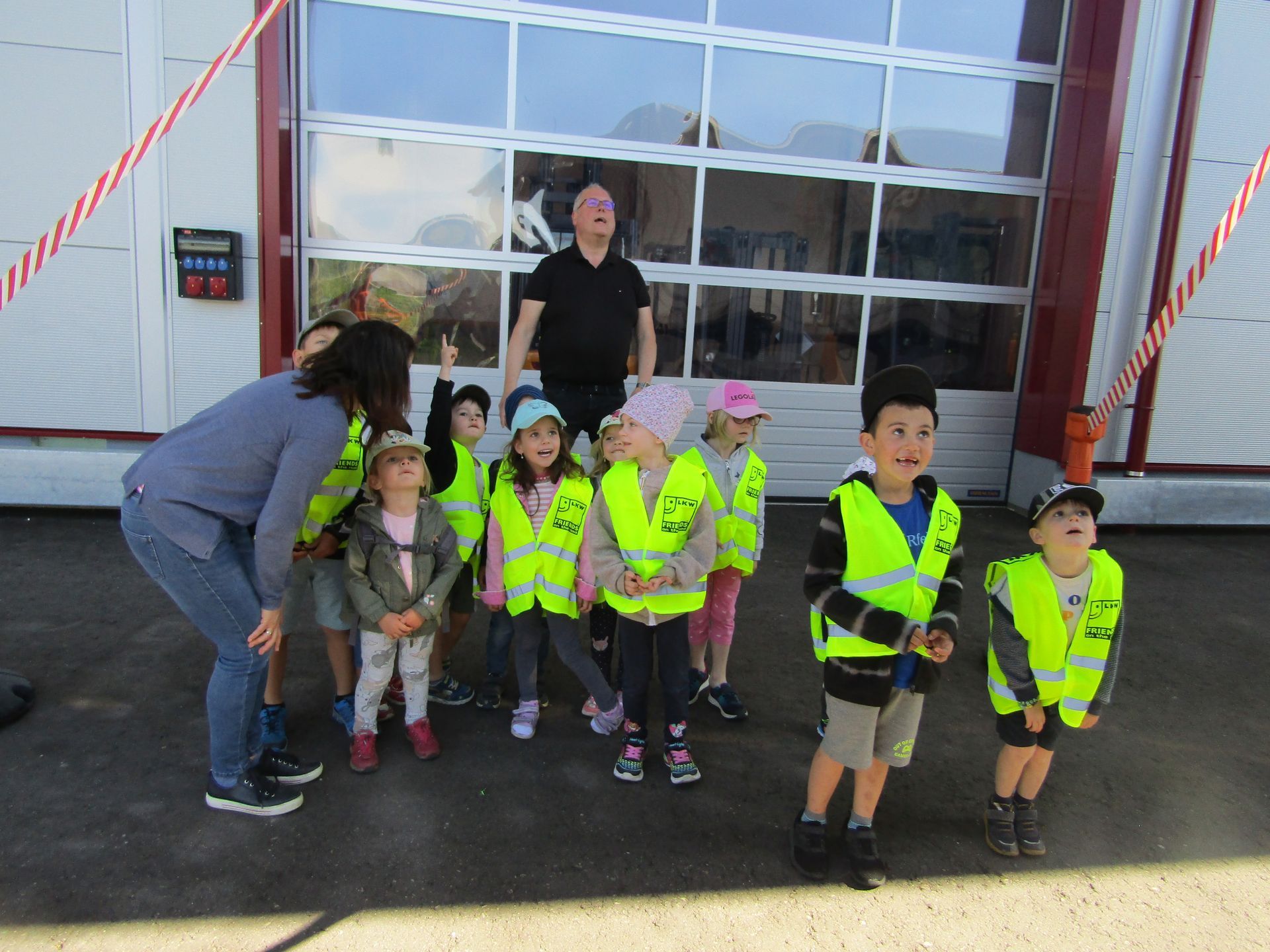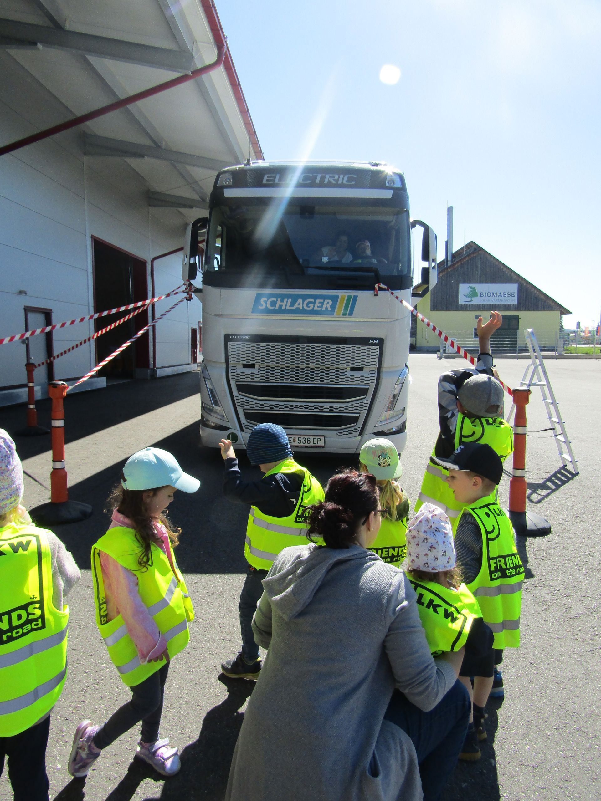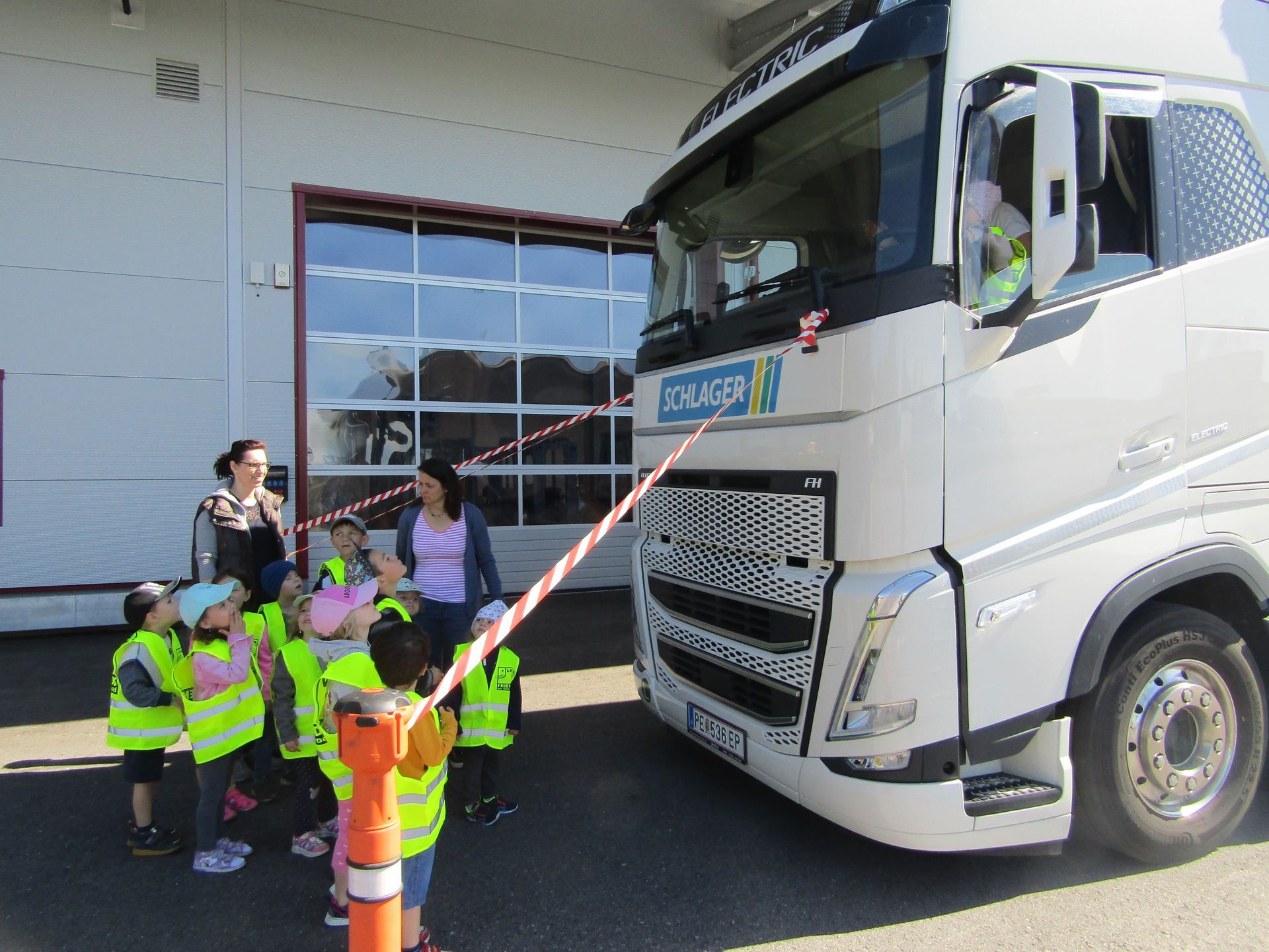 Am 15. Mai 2024 durfte die Gelbe Gruppe die Firma Schlager in Saxen besuchen. Die Kinder konnten hautnah erfahren und erproben, wie nahe man an einen Lastwagen herangehen kann, um vom Fahrer gesehen zu werden. Der Begriff “Toter Winkel” wurde kindgerecht erarbeitet und mehrmals geübt. Jedes Kind durfte einmal als LKW-Fahrer im Lastwagen sitzen und sich einen Überblick über die vorbeikommenden Kinder machen. Die Kinder konnten erkennen, dass man an gewissen Stellen die Fußgeher nicht sehen kann, obwohl sie in unmittelbarer Nähe sind. Außerdem werden leuchtende Warnwesten besonders schnell entdeckt. Das Highlight war der Ausblick aus dem Lastwagen.