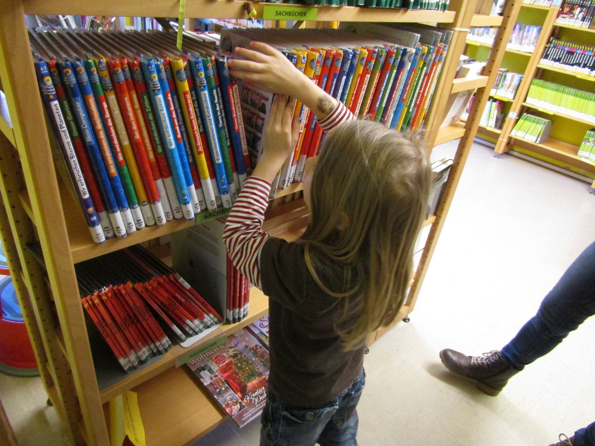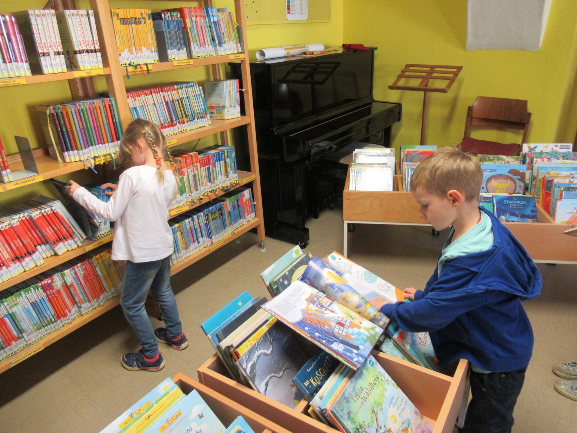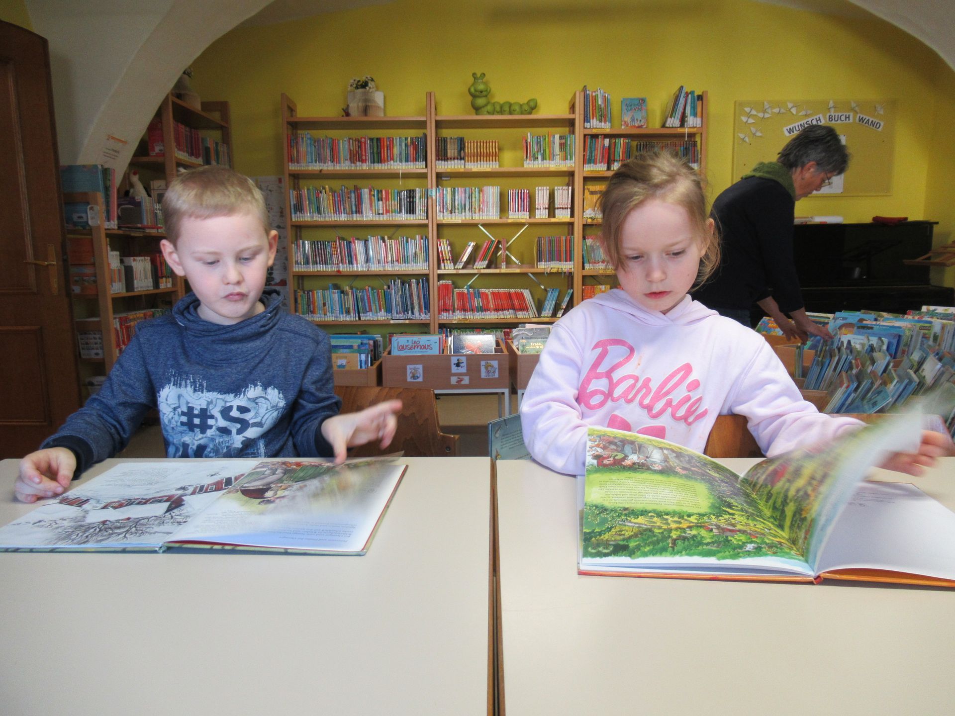 Edith und Julia führten die Kinder durch die verschiedenen Bereiche der Bücherei und zeigten ihnen die große Auswahl an Büchern. Dabei erklärten sie, wie man Bücher ausleiht und welche tollen Geschichten auf die kleinen Leser warten.