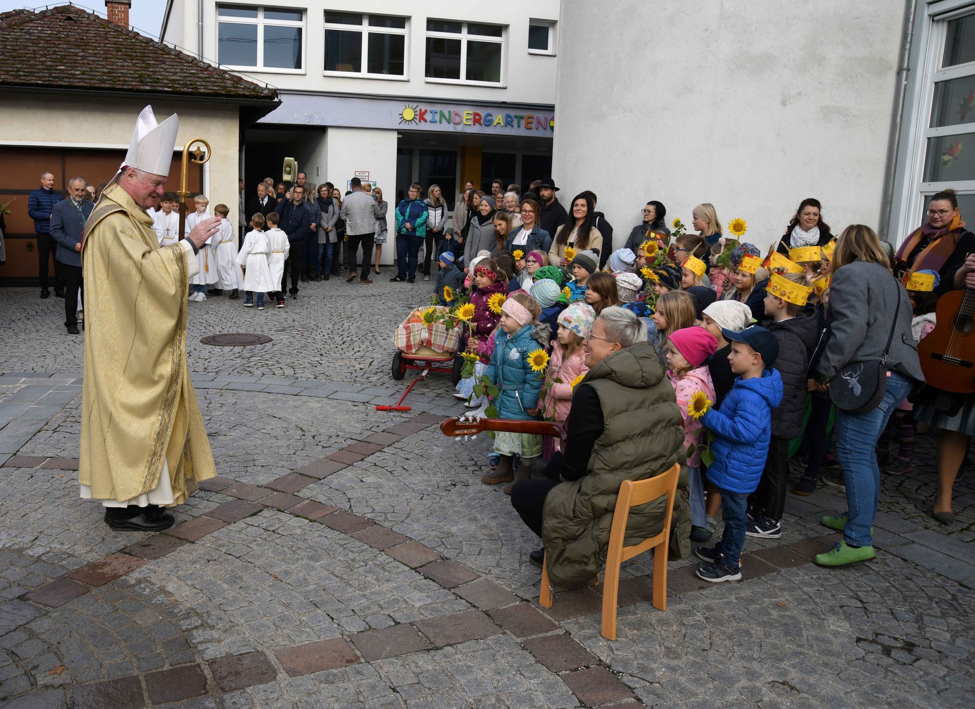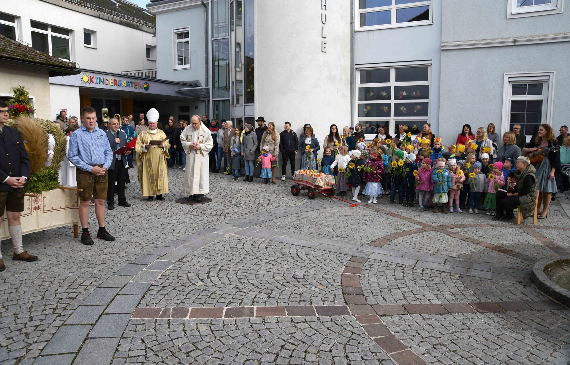 Wir sind schon wieder gut ins neue Kindergartenjahr gestartet. Die Eingewöhnungen der neuen Kindergartenkinder liefen bzw. laufen sehr entspannt. Es sind bereits neue Freundschaften entstanden und das Vertrauen zu den neuen Bezugspersonen wird täglich aufgebaut und verstärkt. Während der ersten Wochen haben wir uns auch auf das Erntedankfest vorbereitet, welches am Sonntag, 06.10. stattfand. Wir haben gemeinsam mit den Volksschülern unser Lied „Du hast uns deine Welt geschenkt“ gesungen und so gemeinsam „Ehrengast“ Bischof Dr. Manfred Scheuer begrüßt.