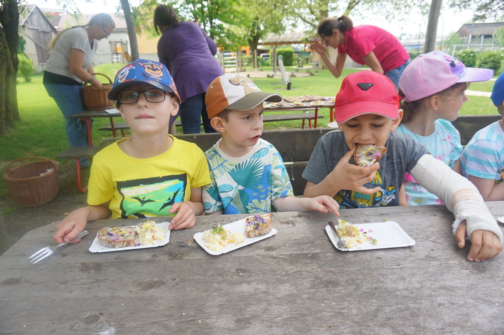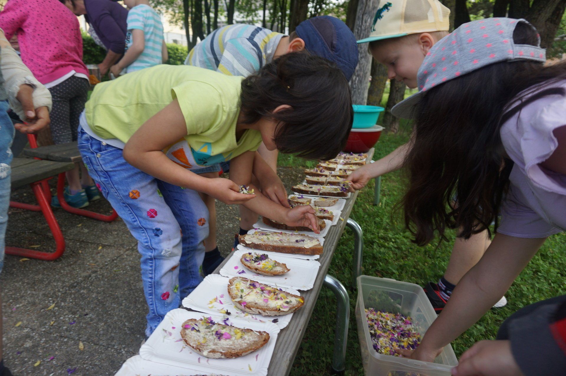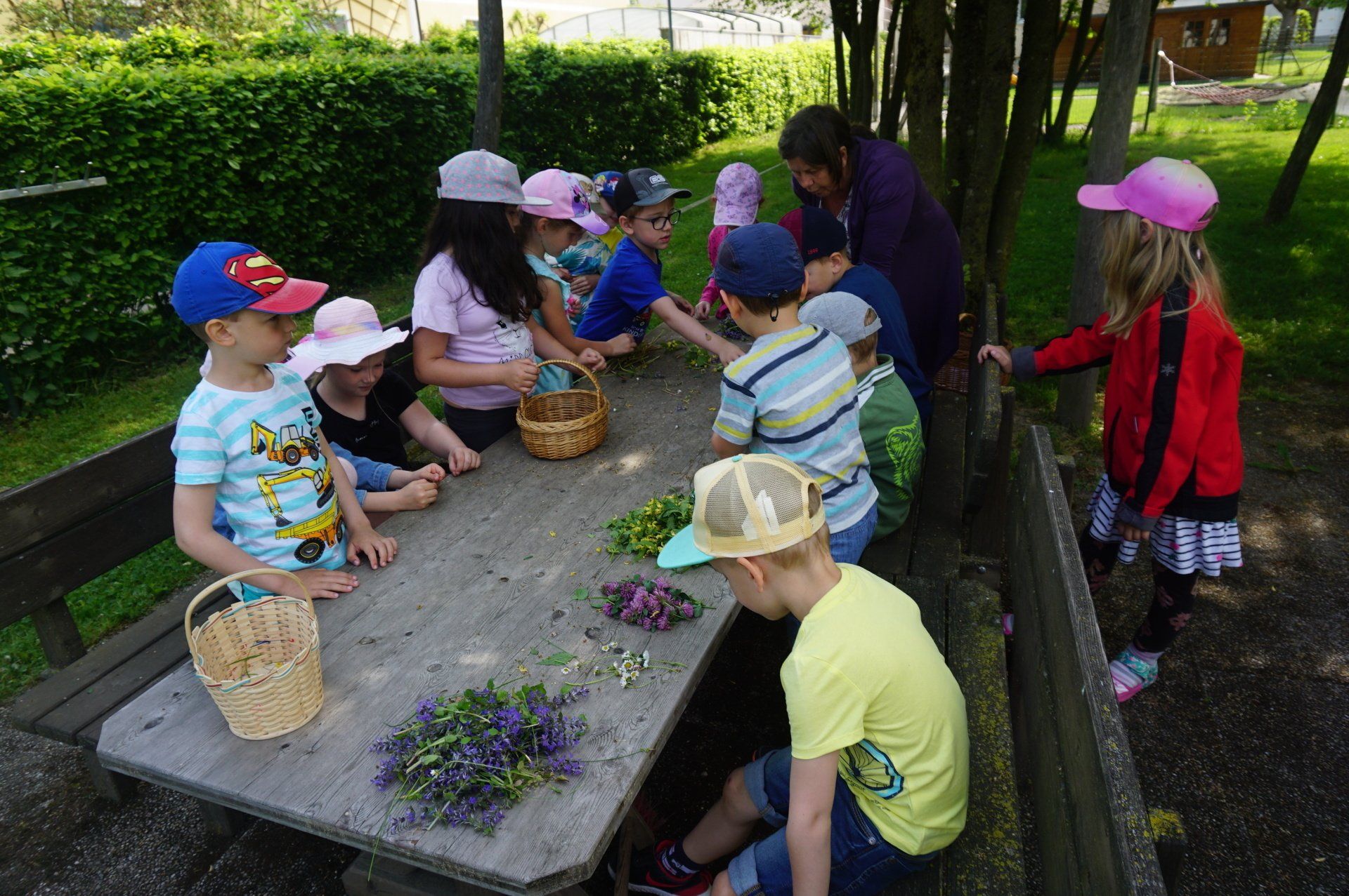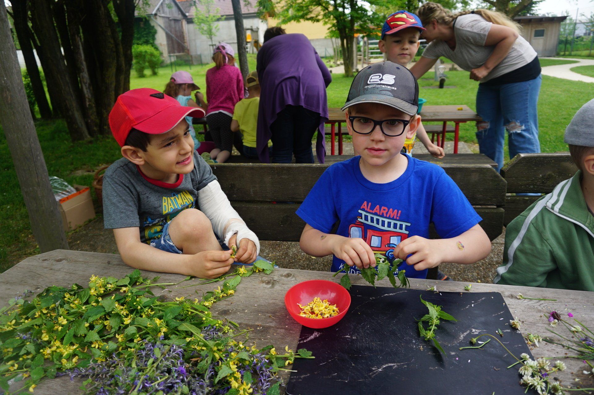 Nicht weit vom Kindergarten entfernt wurden wir fündig und sammelten essbare Blüten und Kräuter. Im Garten richteten die Kinder Blütenbrote, Kräutersalz, Löwenzahn - Kartoffelsalat und Blütenschokolade her. Diese leckeren Naturschätze ließen wir uns alle gut schmecken. Vielen Dank an den Elternverein Saxen und an die Gesunde Gemeinde, die den Kindern dieses tolle Projekt ermöglicht haben.