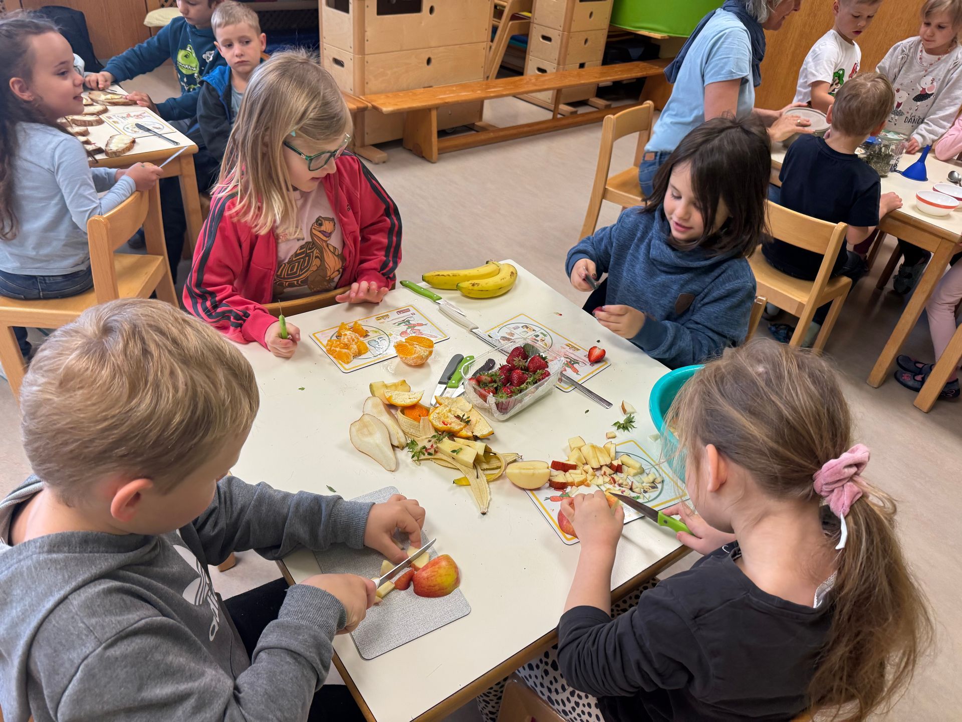 Zurück im Kindergarten ging es kreativ weiter: Aus den gesammelten Kräutern stellten die Kinder selbst Butterbrote mit frischen Kräutern, bunten Obstsalat mit essbaren Blüten und ihr eigenes Kräutersalz zum Mitnehmen her. Der Duft, die Farben, der Geschmack – dieser Tag sprach wirklich alle Sinne an.