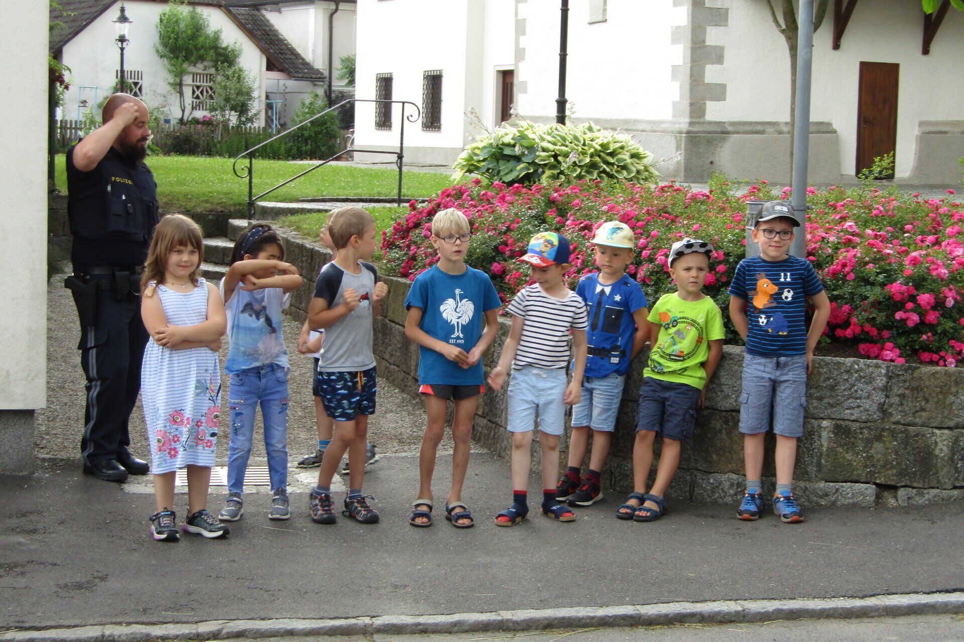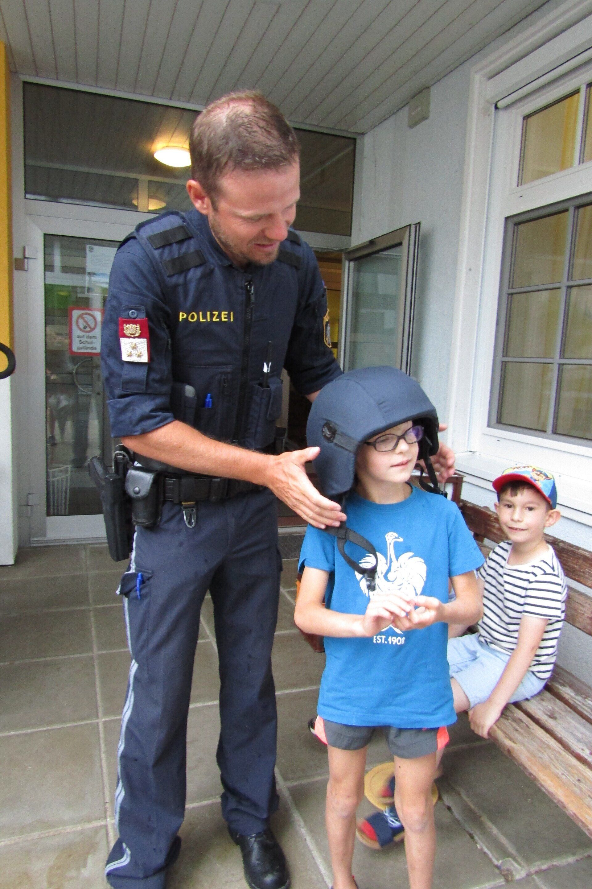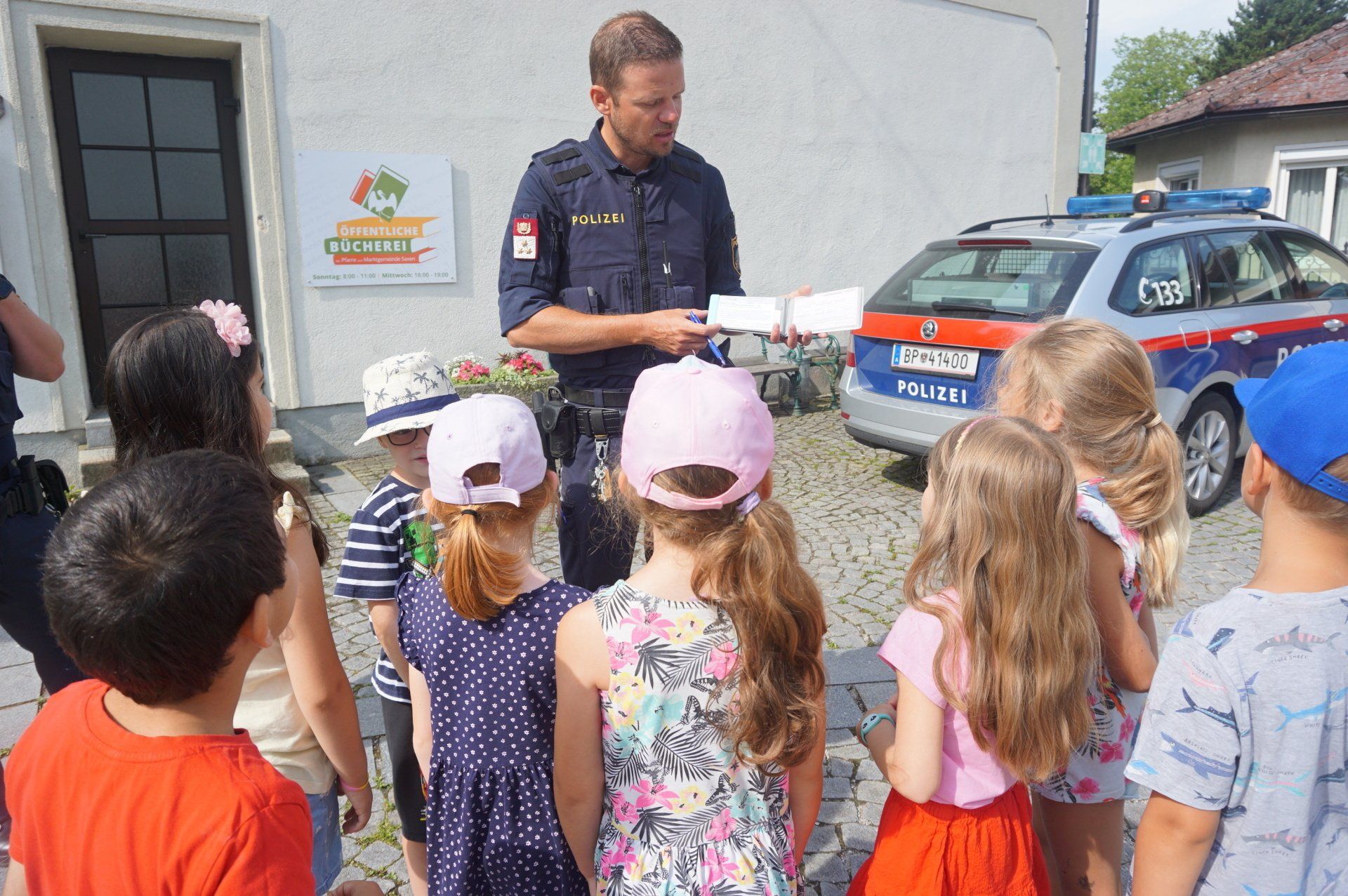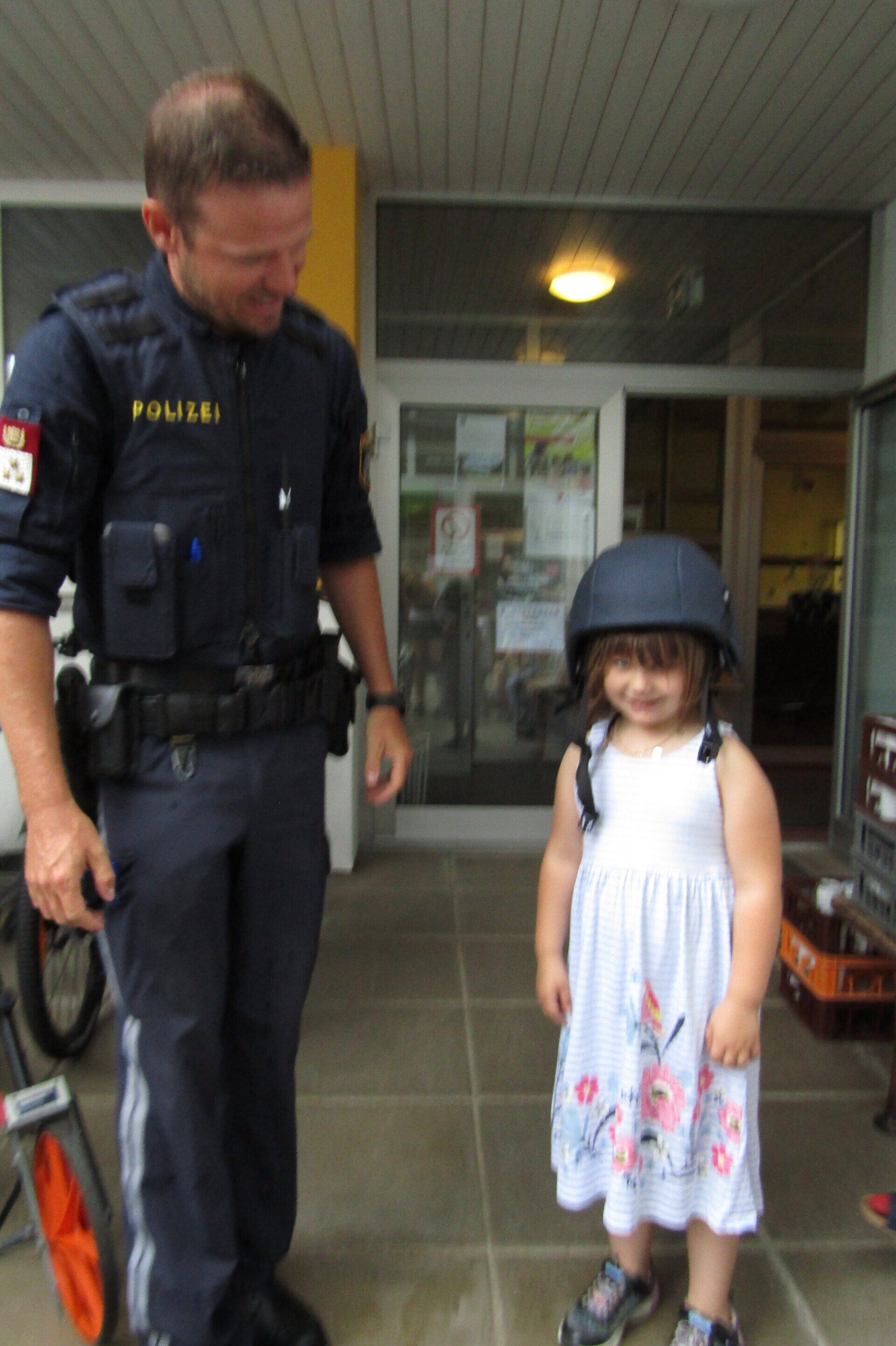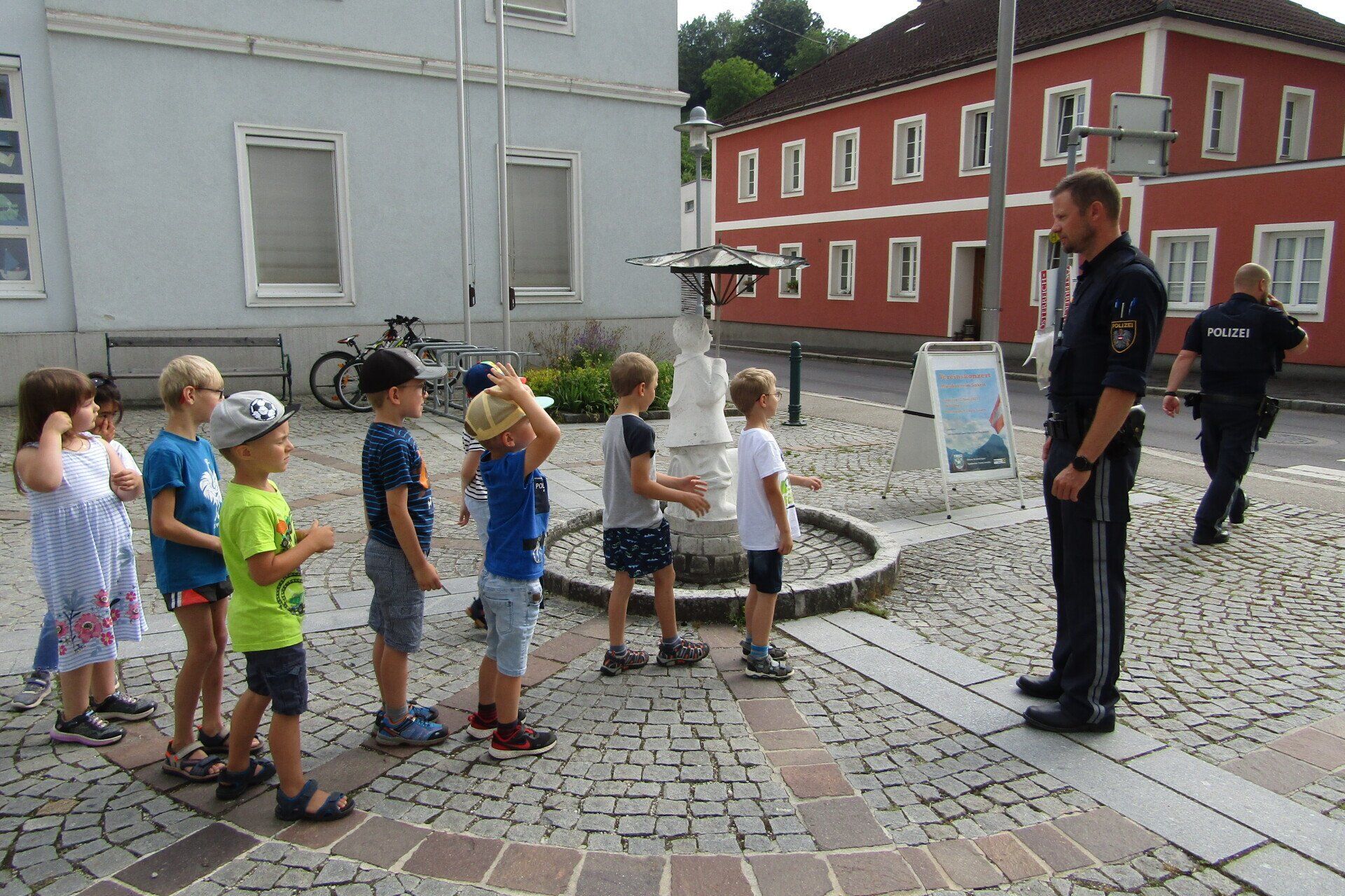 Am 21. Juni wurden die Schulanfänger des Kindergartens von zwei Polizisten vom Posten Grein besucht. In zwei Gruppen stellten die Polizisten kurz ihre Arbeit vor und erklärten den Kindern das richtige Verhalten im Straßenverkehr. Anschließend durfte jedes Kind alleine den Zebrastreifen vor der Schule überqueren und dabei das vorher Erlernte gleich anwenden.