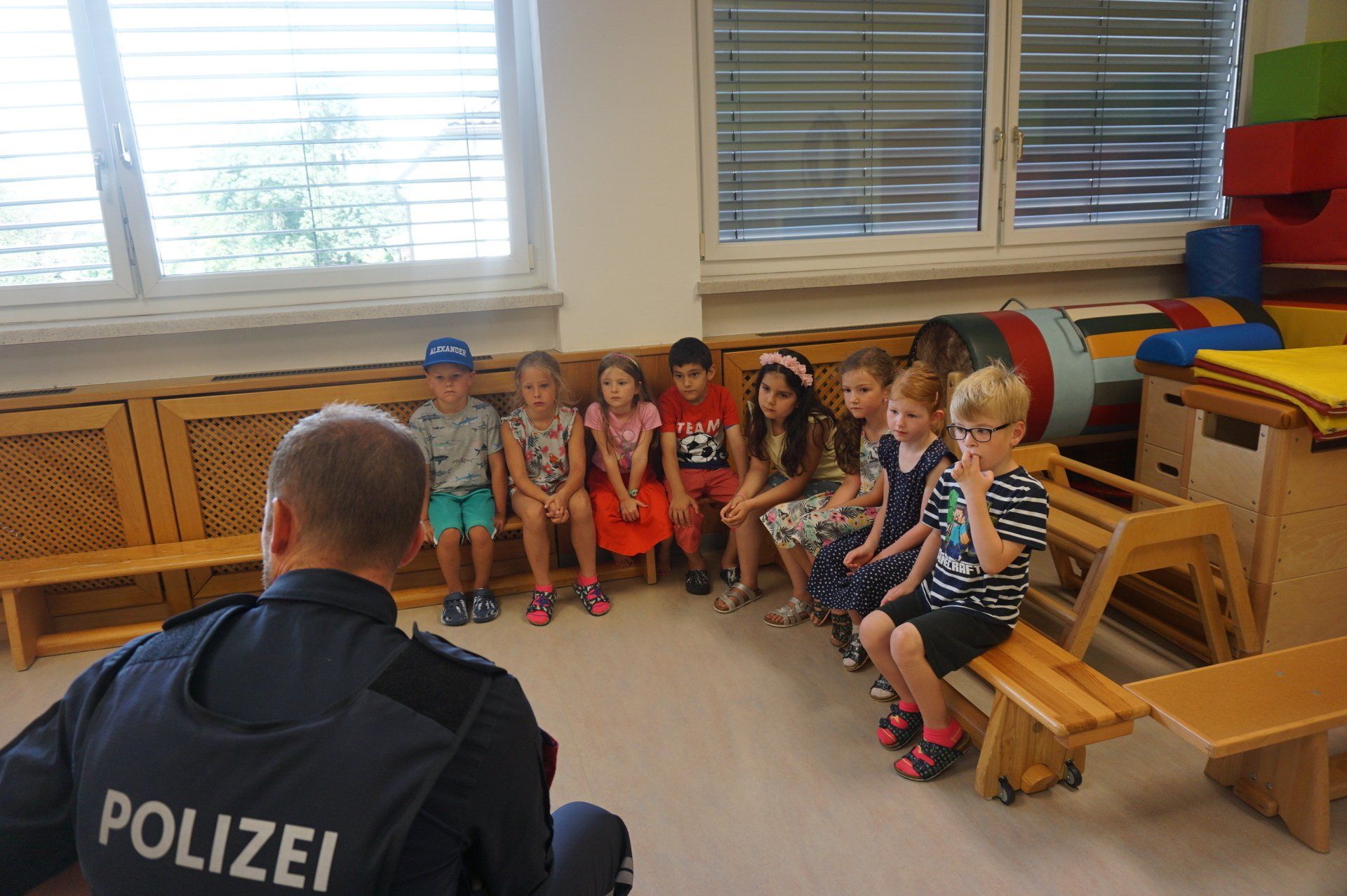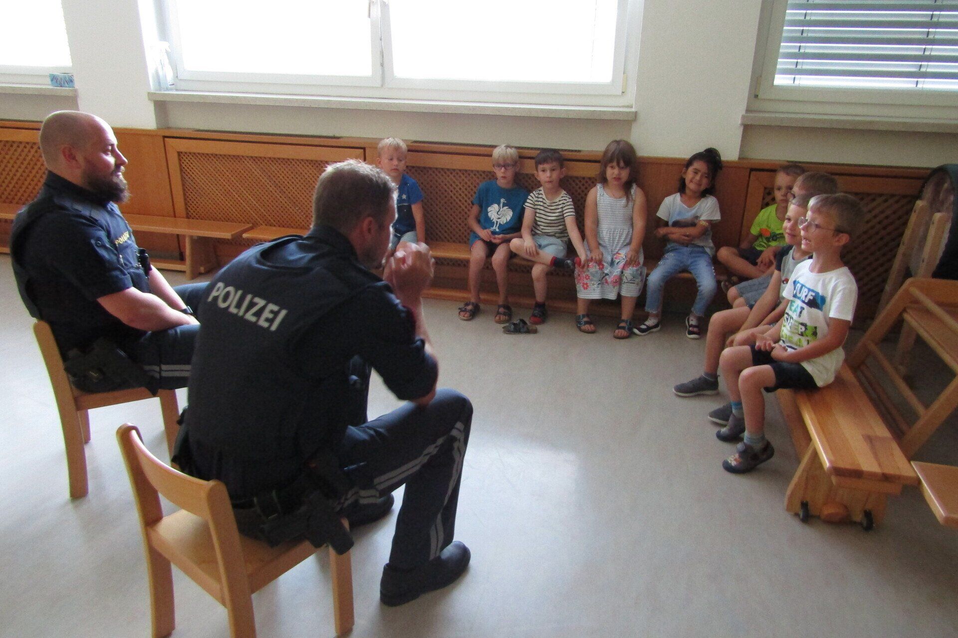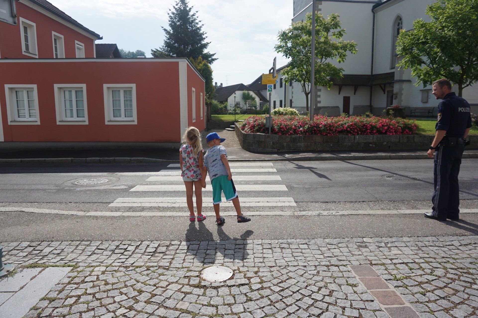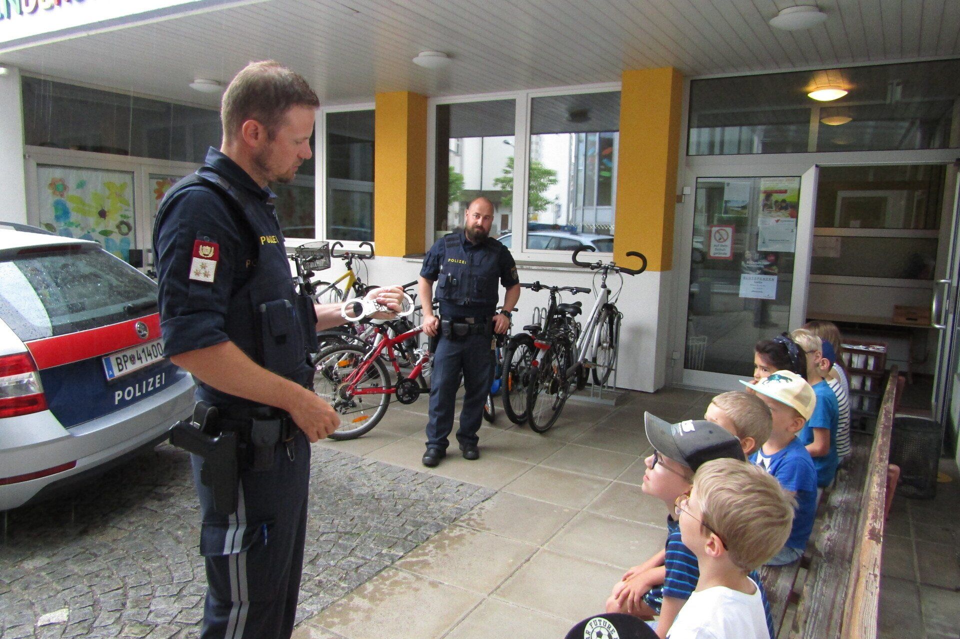 Am 21. Juni wurden die Schulanfänger des Kindergartens von zwei Polizisten vom Posten Grein besucht. In zwei Gruppen stellten die Polizisten kurz ihre Arbeit vor und erklärten den Kindern das richtige Verhalten im Straßenverkehr. Anschließend durfte jedes Kind alleine den Zebrastreifen vor der Schule überqueren und dabei das vorher Erlernte gleich anwenden.
