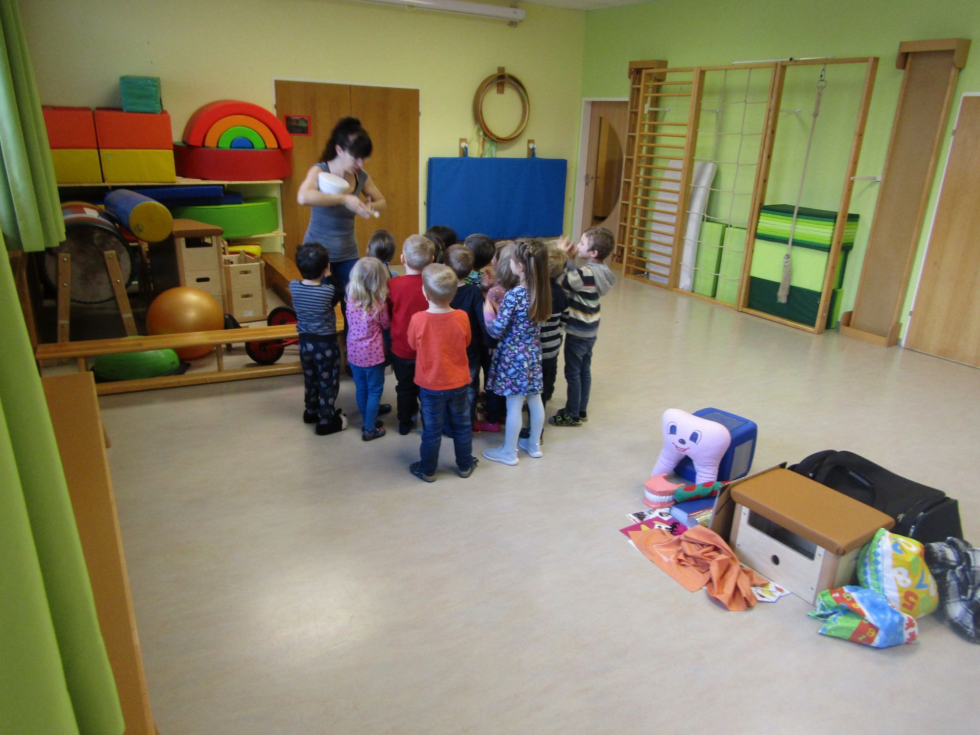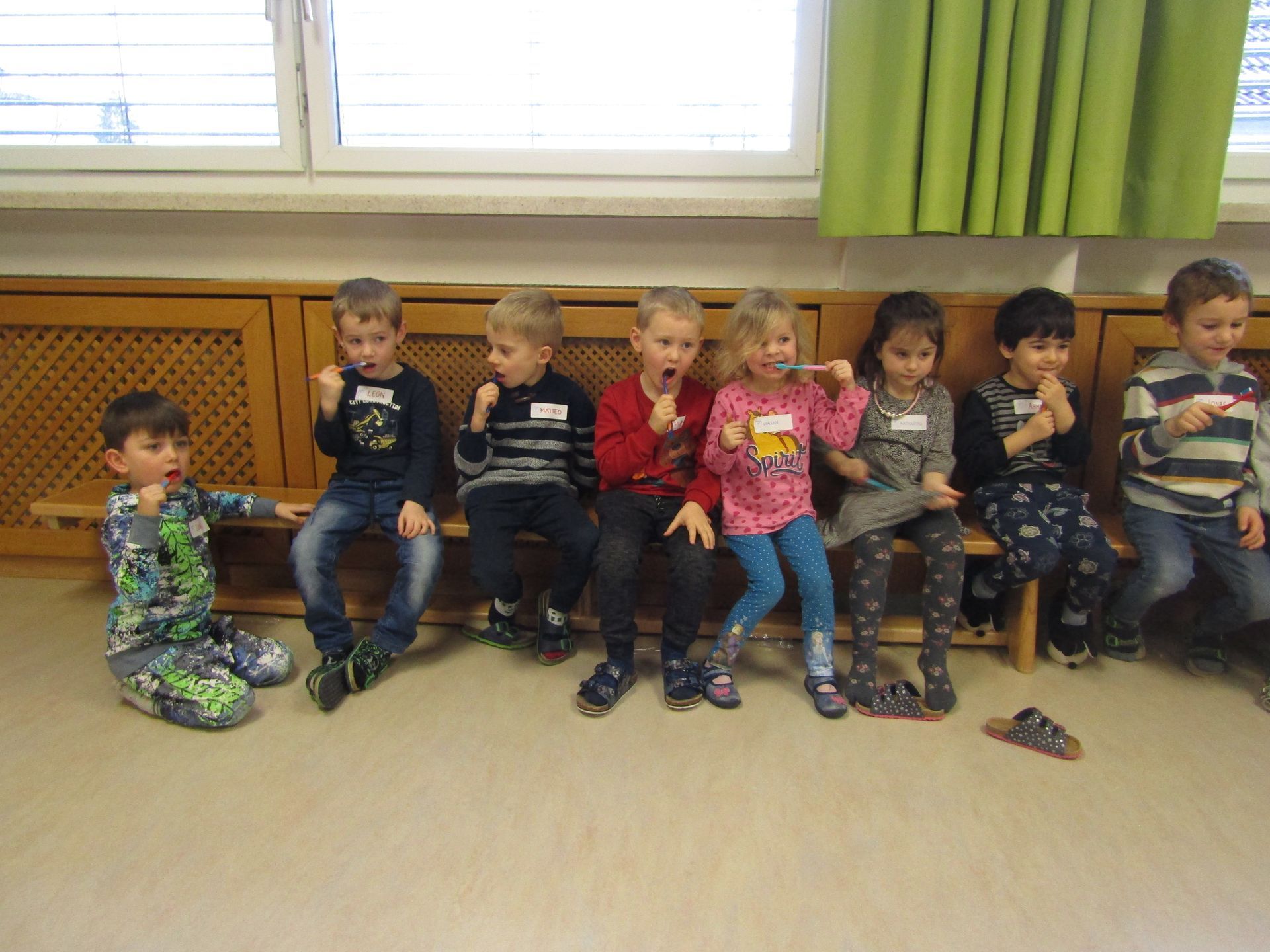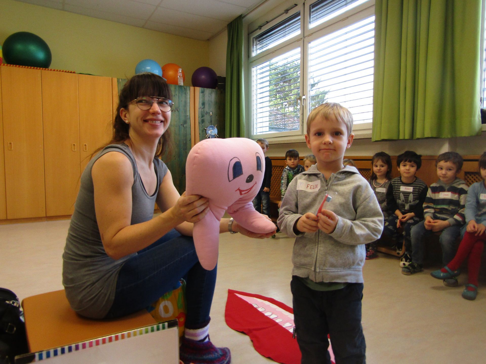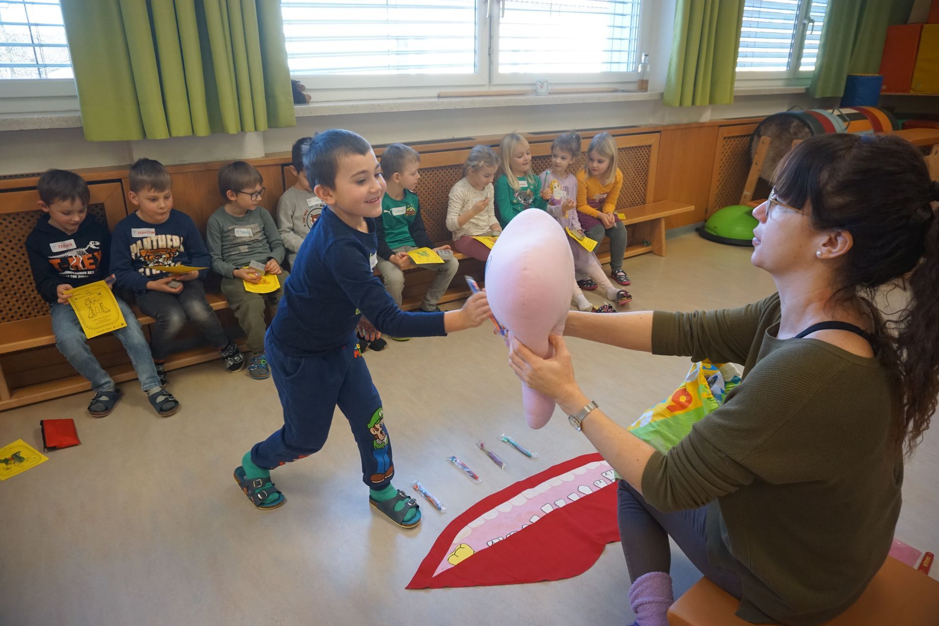 Das hat uns die Zahngesundheitserzieherin Manuela gemeinsam mit „Maxl“ und ihrer großen Zahnbürste anschaulich erklärt. Außerdem hat sie mit den Kindern besprochen, welche Lebensmittel für unsere Zähne gesund und welche eher ungesund sind. Zum Abschluss hat jedes Kind eine eigene Zahnbürste erhalten und die Schulanfänger sogar noch eine kleine Zahndose für die ersten Milchzähne.