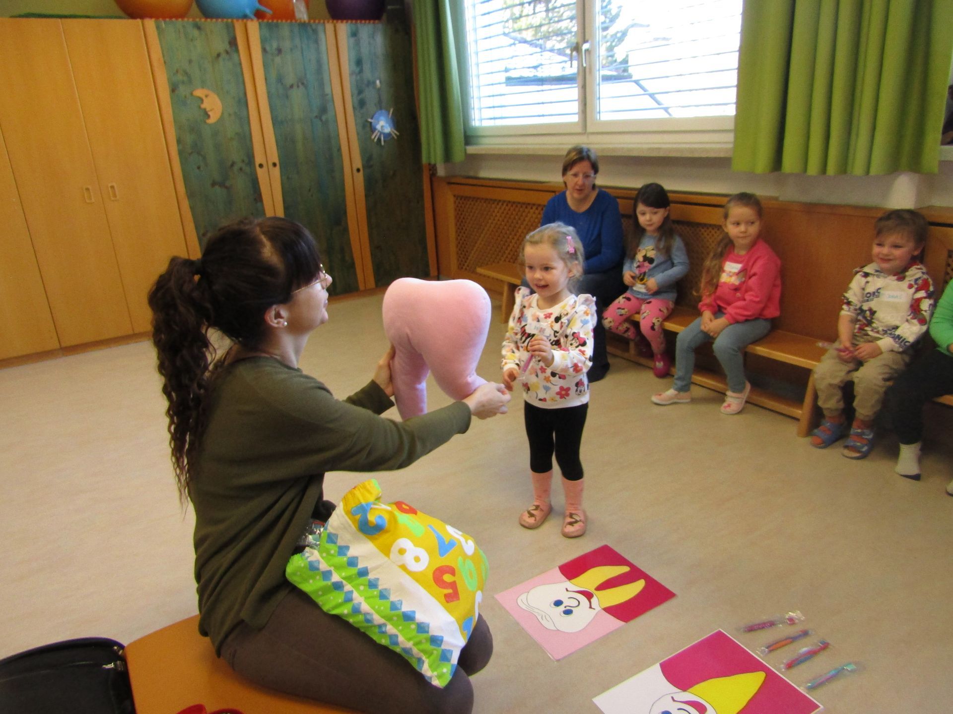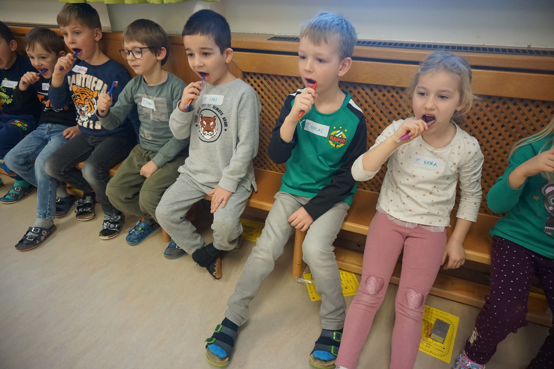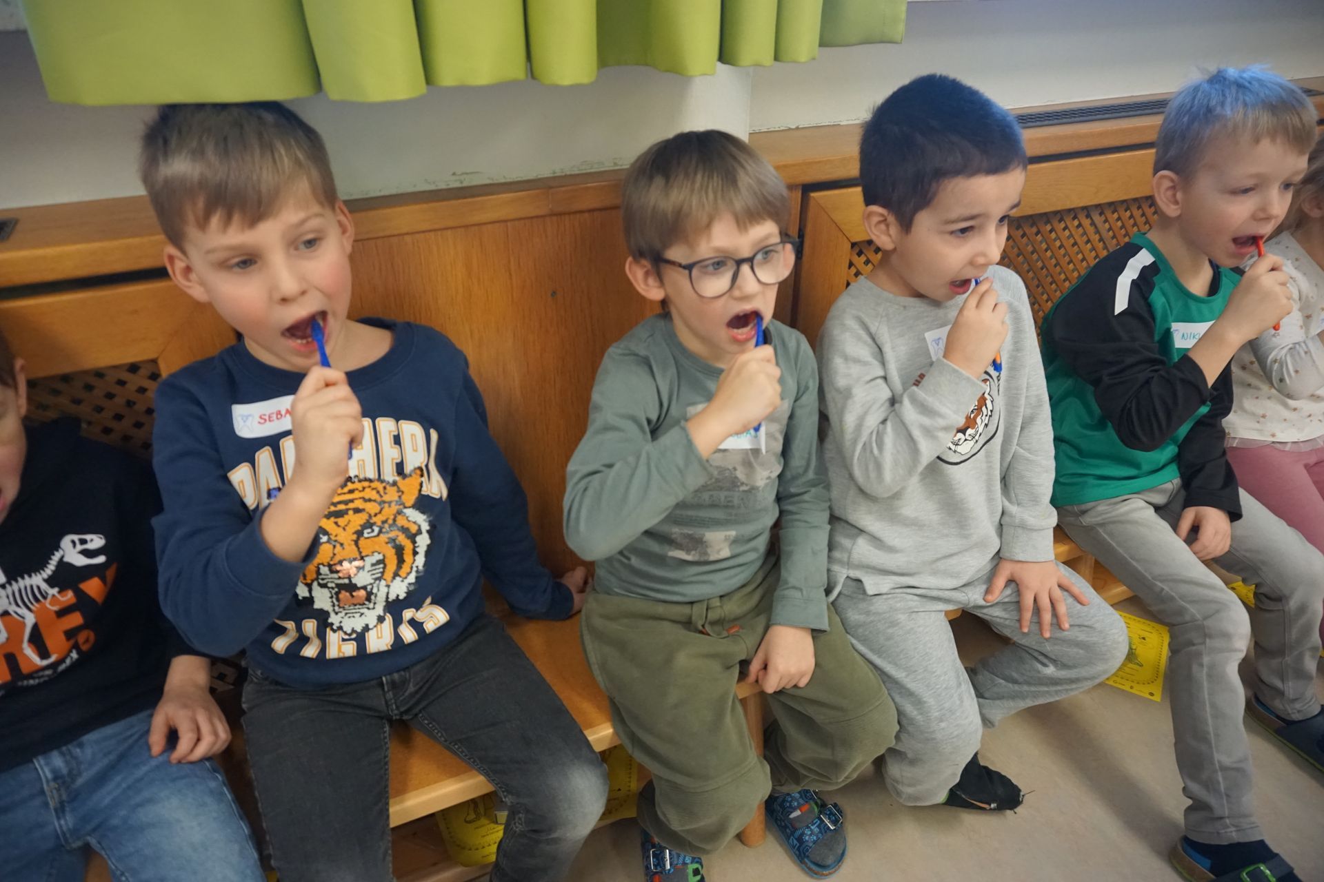 Das hat uns die Zahngesundheitserzieherin Manuela gemeinsam mit „Maxl“ und ihrer großen Zahnbürste anschaulich erklärt. Außerdem hat sie mit den Kindern besprochen, welche Lebensmittel für unsere Zähne gesund und welche eher ungesund sind. Zum Abschluss hat jedes Kind eine eigene Zahnbürste erhalten und die Schulanfänger sogar noch eine kleine Zahndose für die ersten Milchzähne.