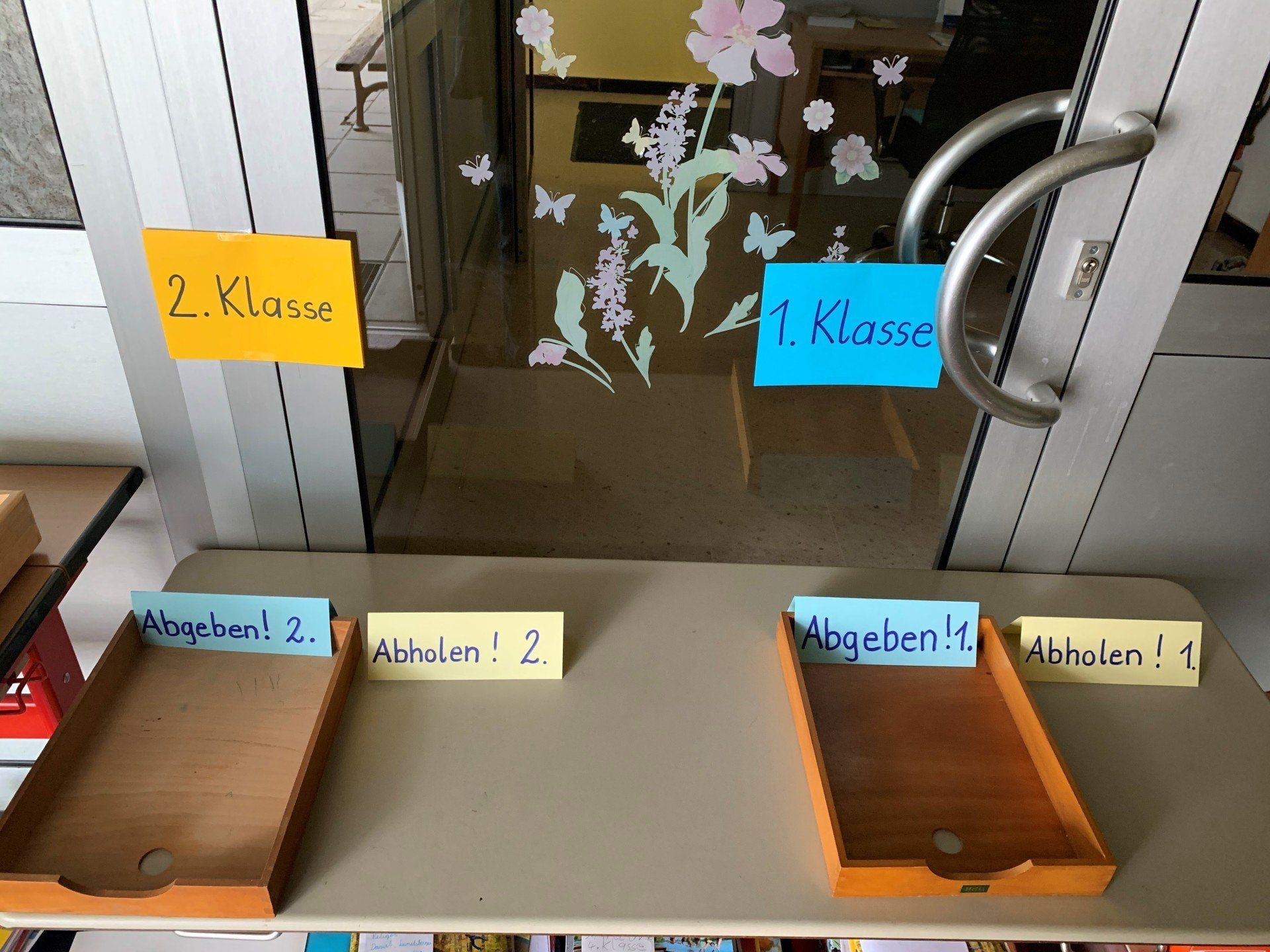 Im Eingangsbereich der Garderobe wurde eine Abhol-und Abgabestation für jede Klasse errichtet.