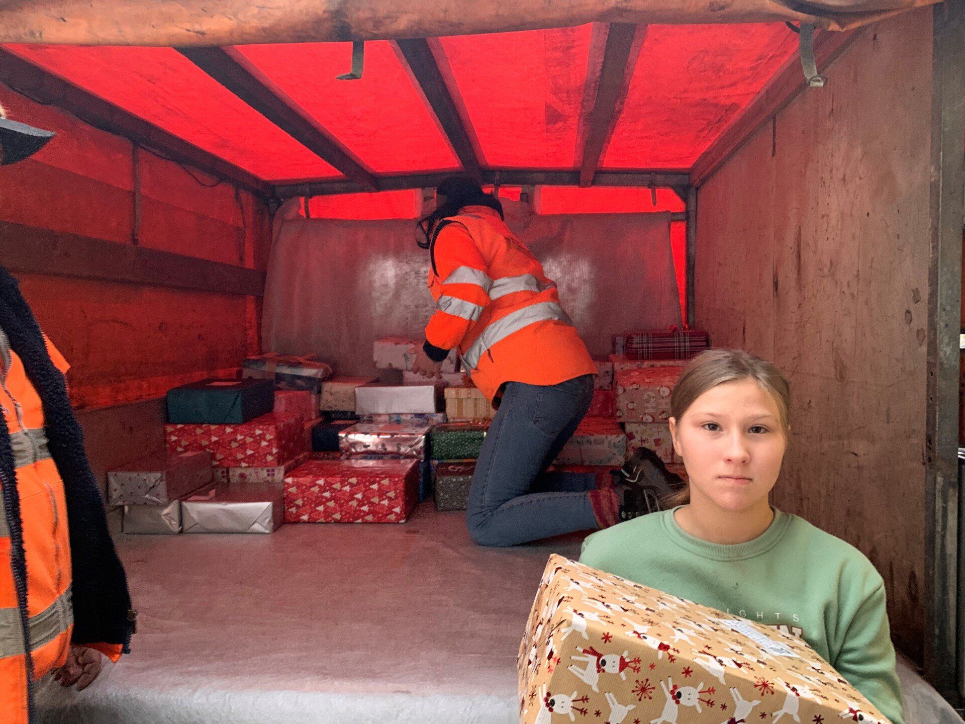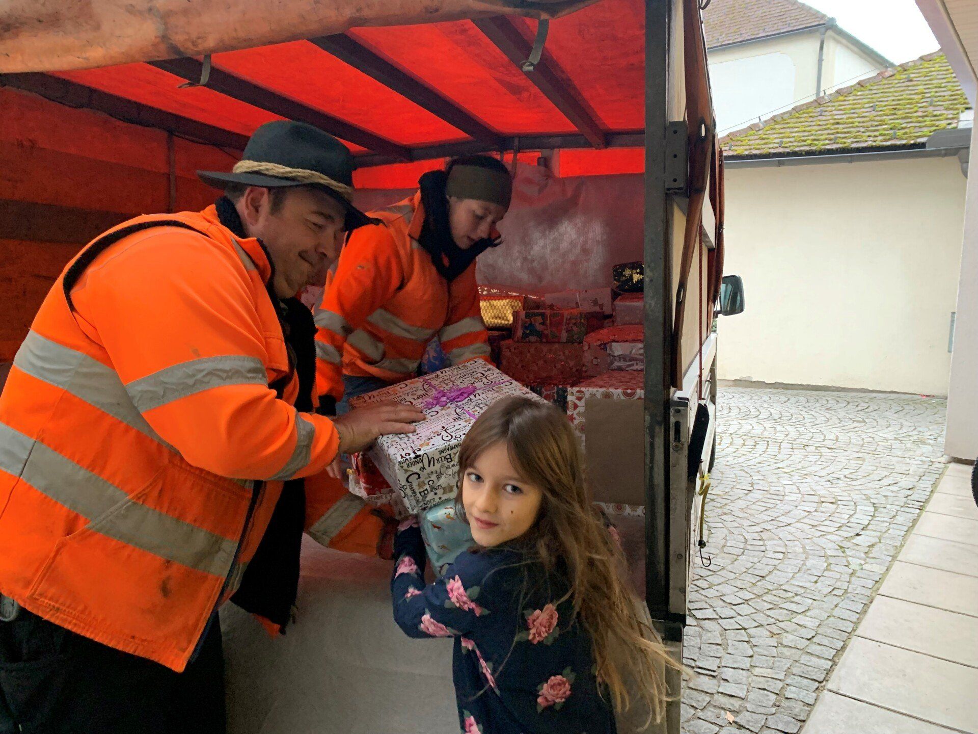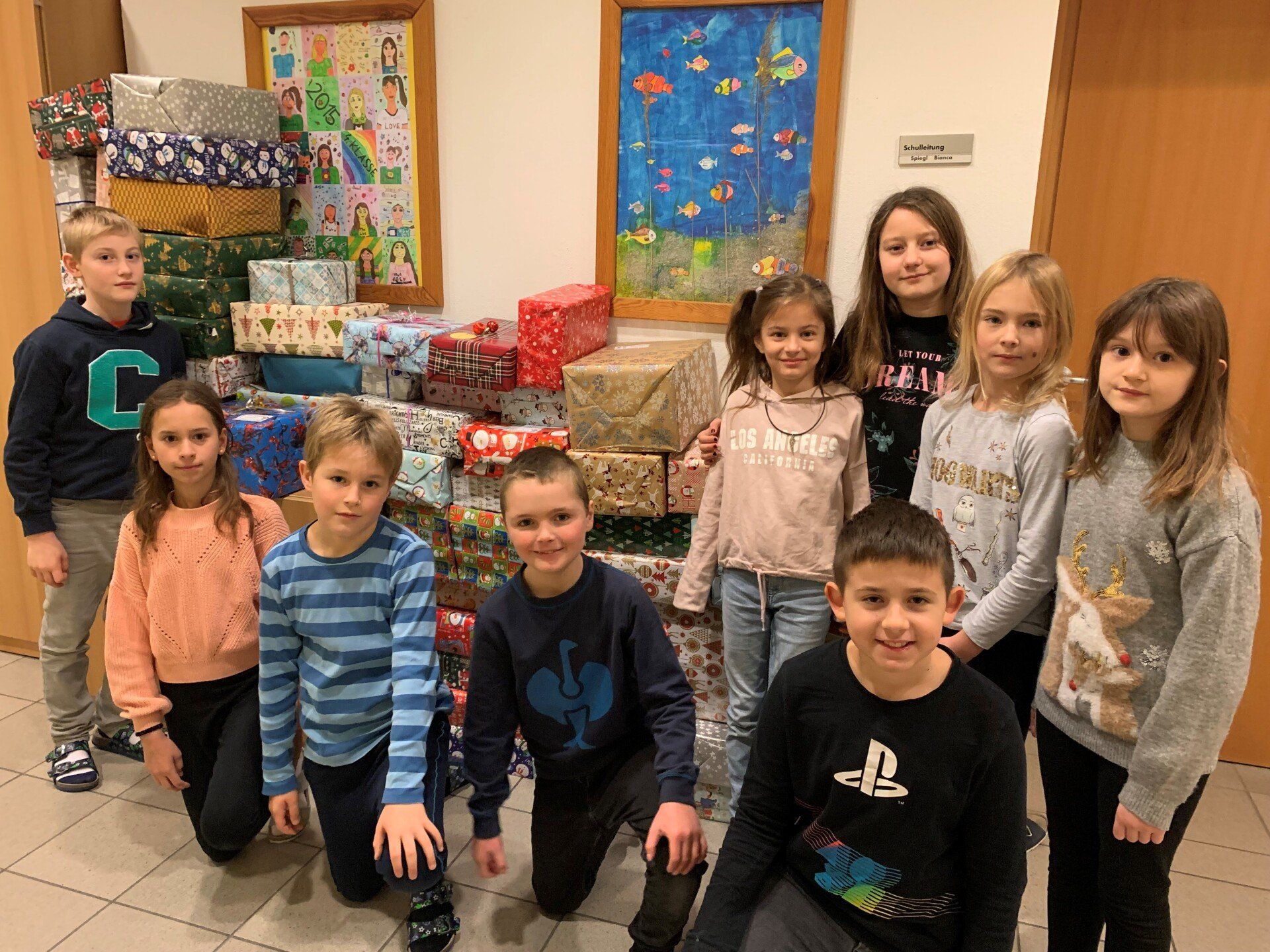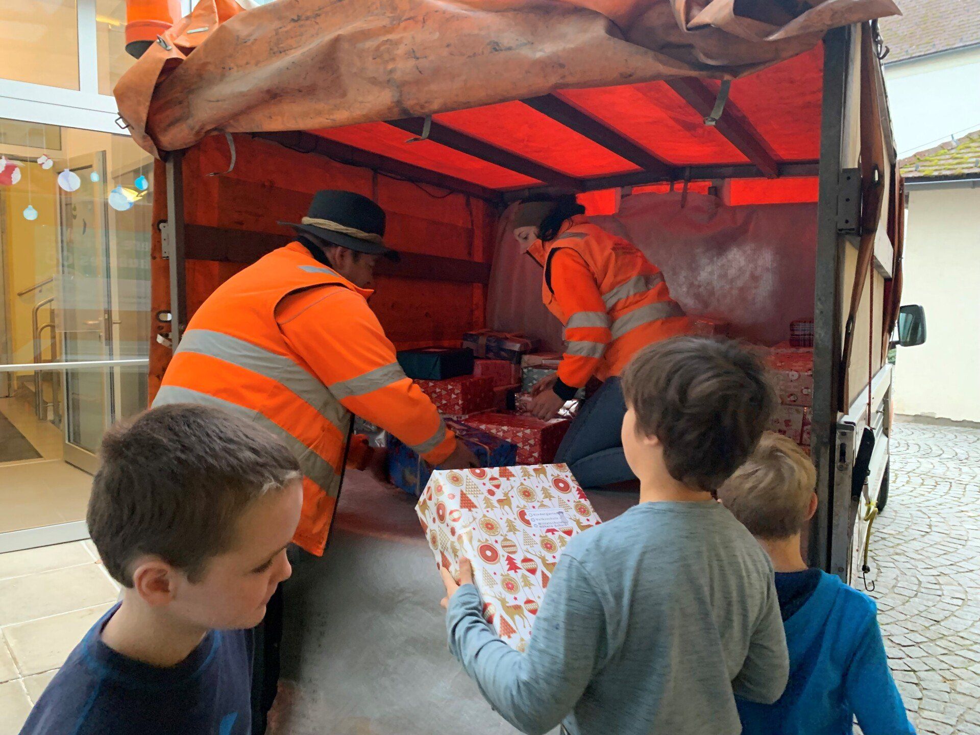 Die Kinder der 3. Klasse halfen fleißig beim Einladen der Geschenke.