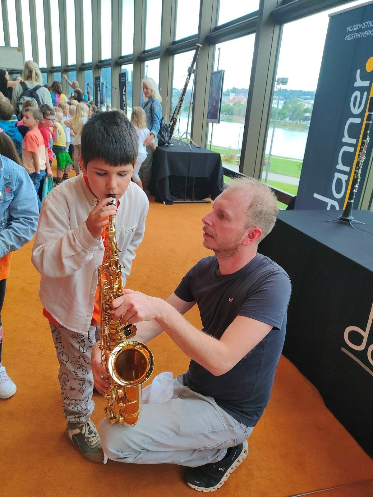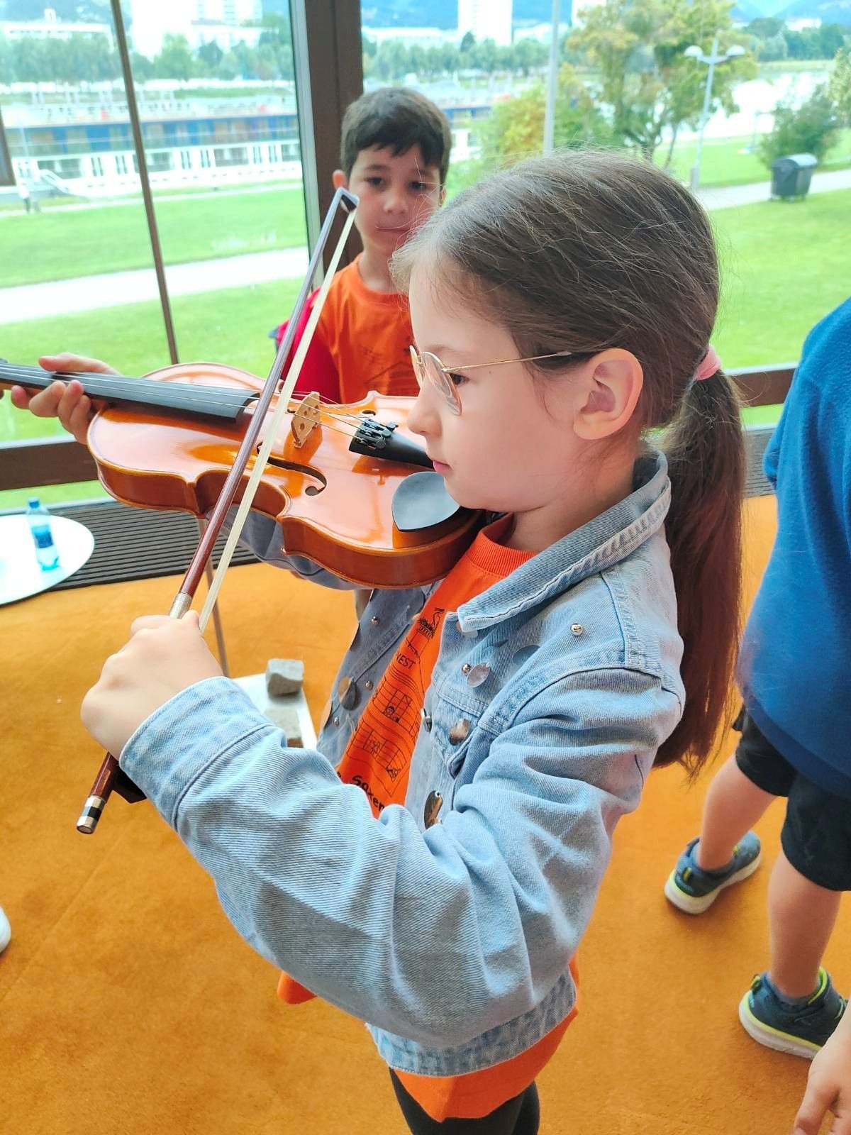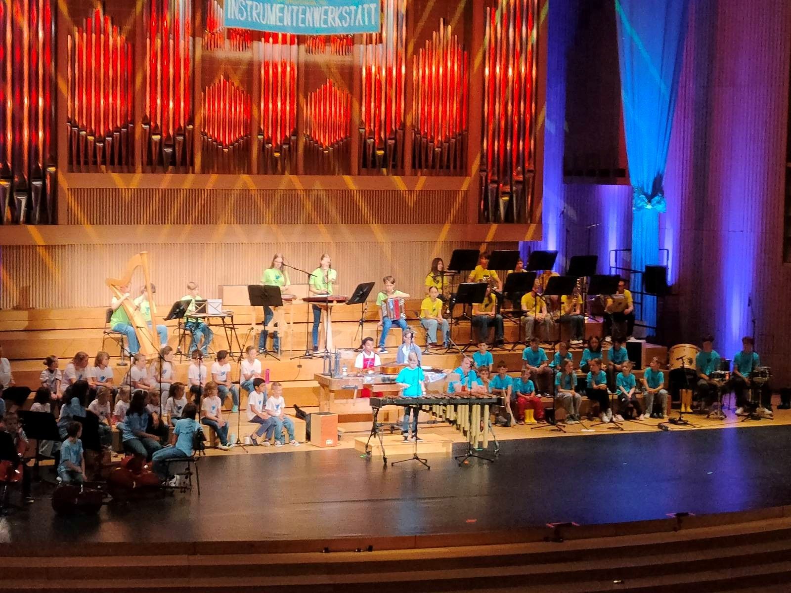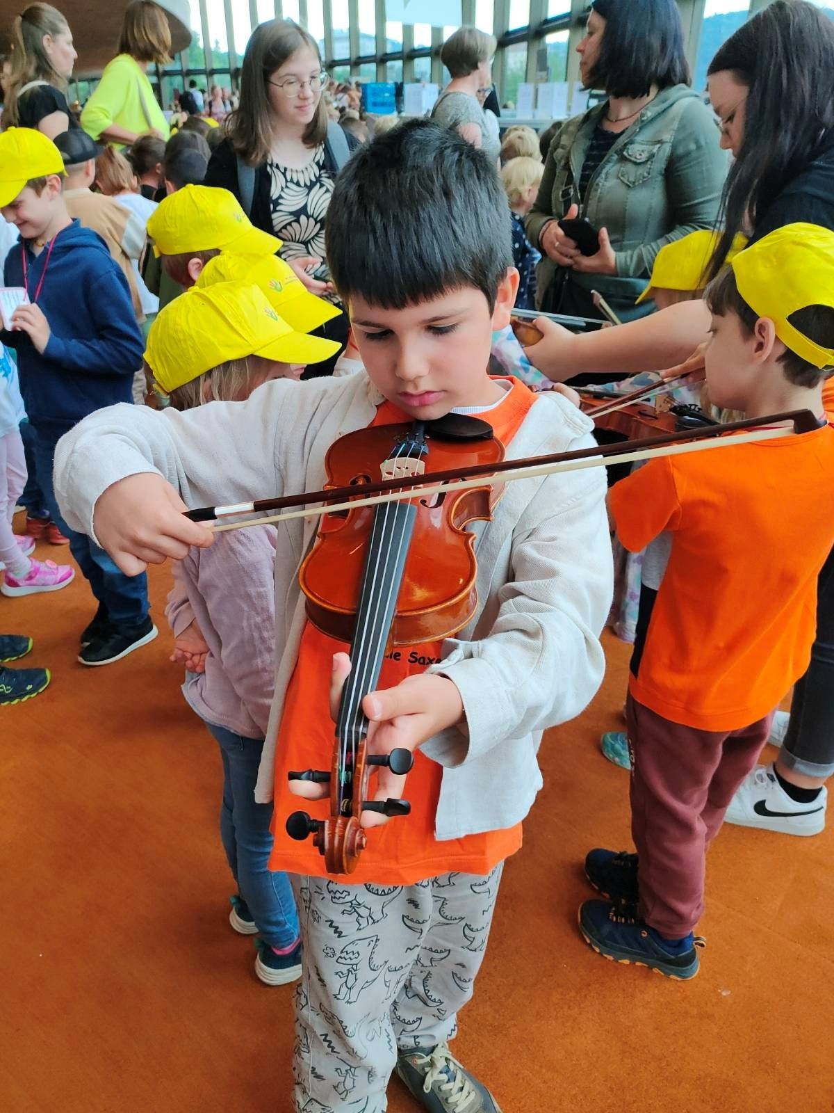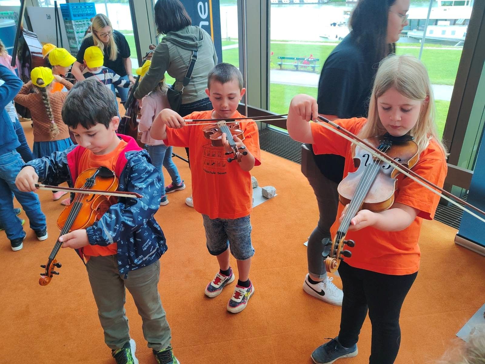 Nach der Anreise im Autobus durften die Kinder verschiedenste Instrumente des Orchesters ausprobieren.