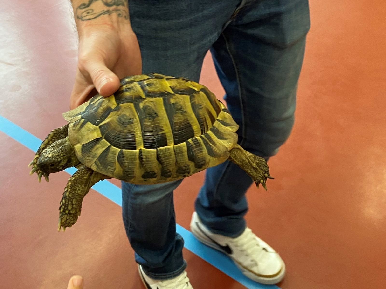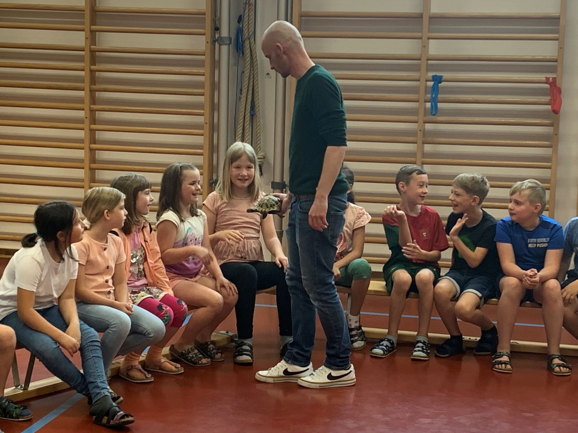Besonders war auch, dass sich die Vogelspinne während der Anreise gehäutet hatte, so konnten die Schulkinder auch die Haut der Vogelspinne anfassen. Eine griechische Landschildkröte durfte bei der Reptilienschau natürlich auch nicht fehlen.