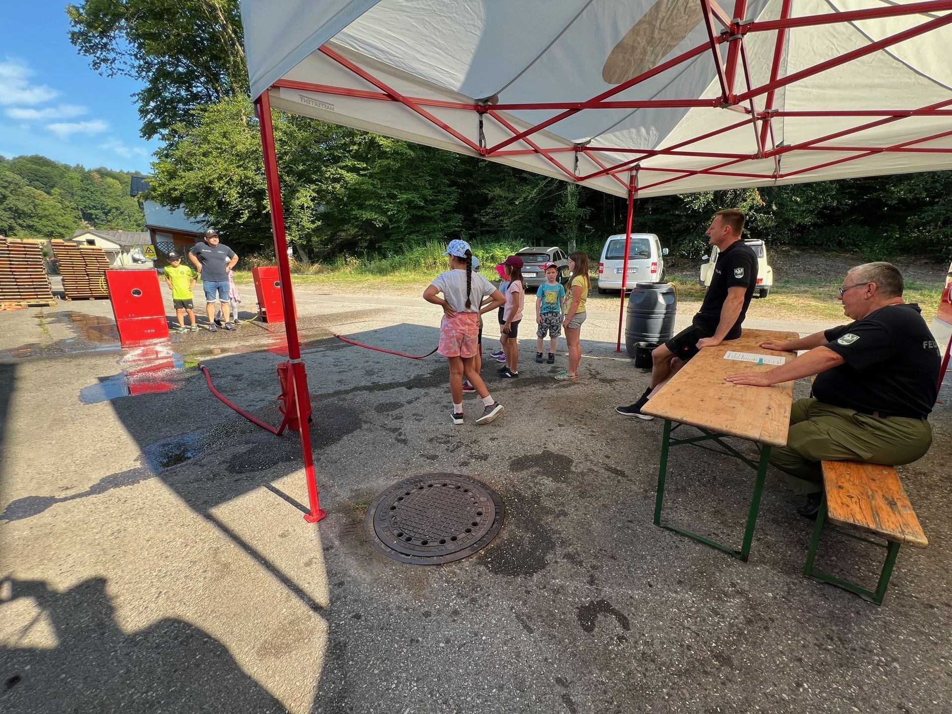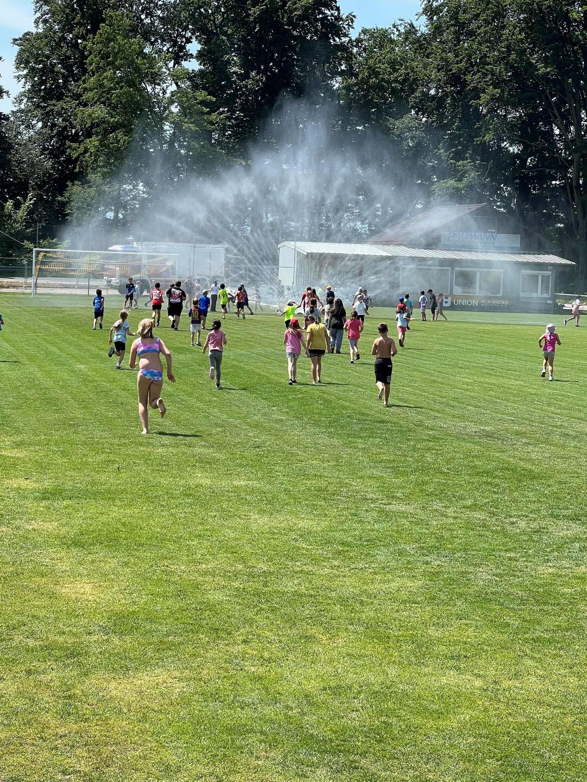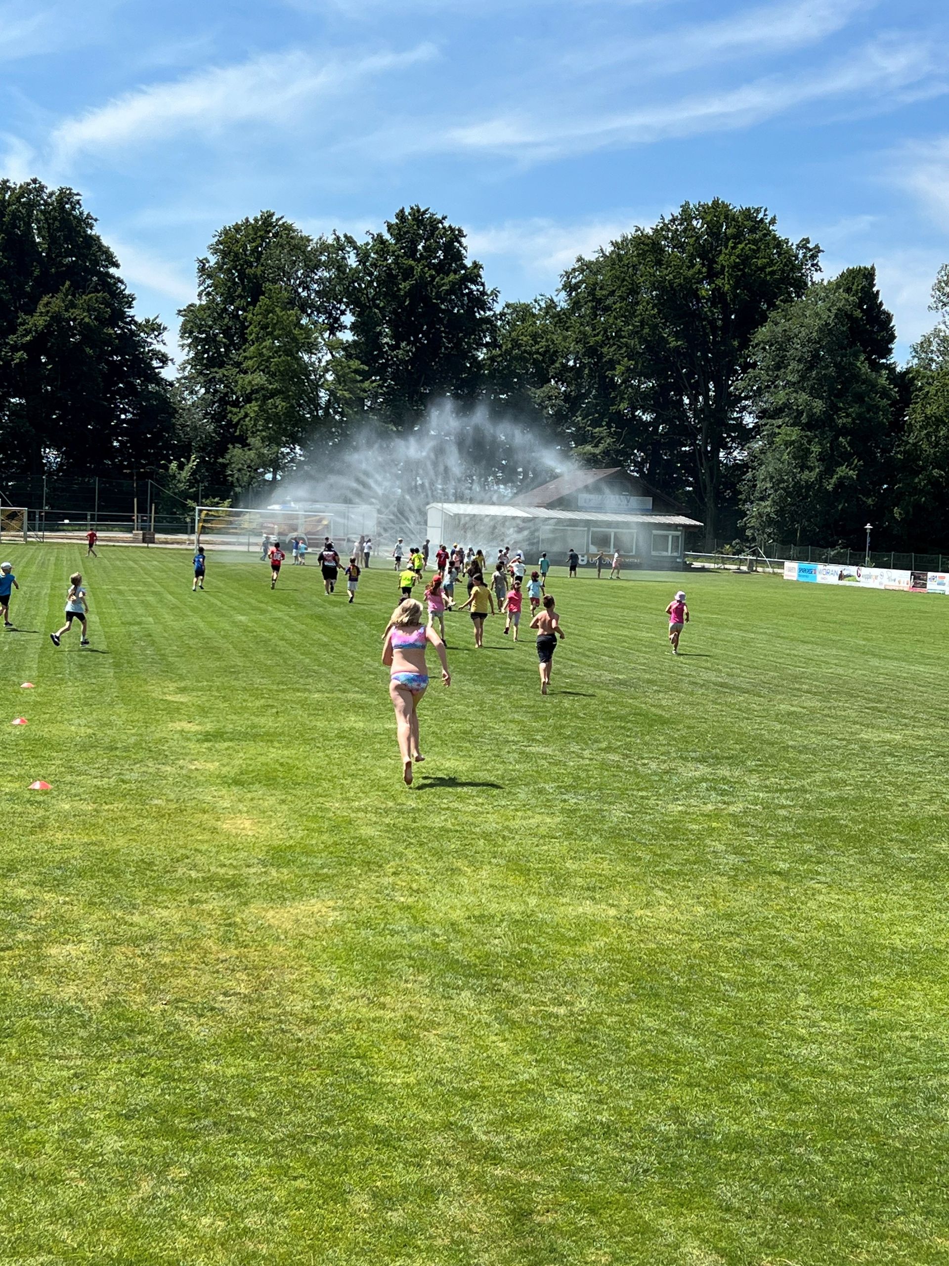 Ein Sprühregen der Feuerwehr Saxen beendete den heißen Sporttag mit einer willkommenen Abkühlung für die Kinder.