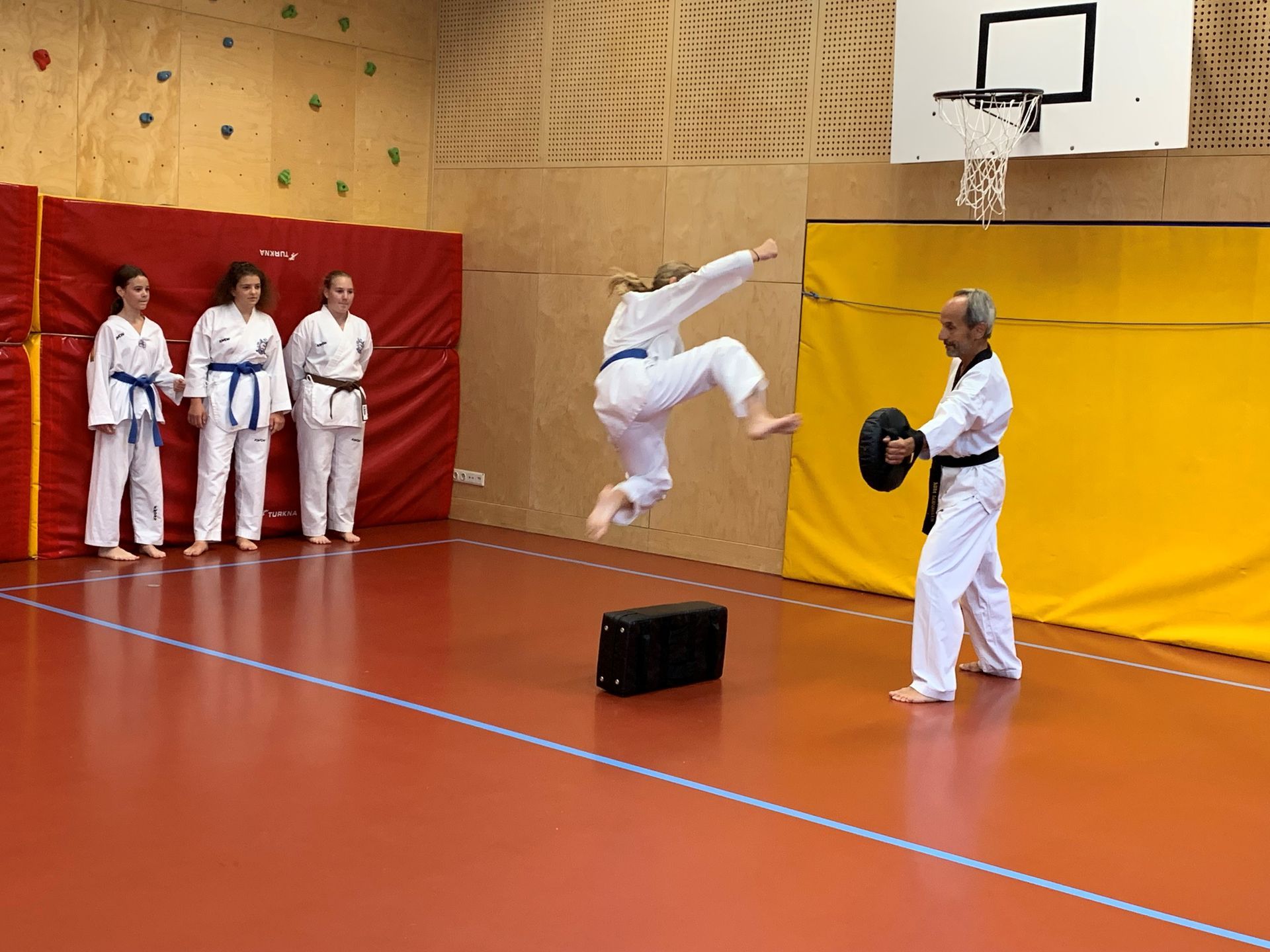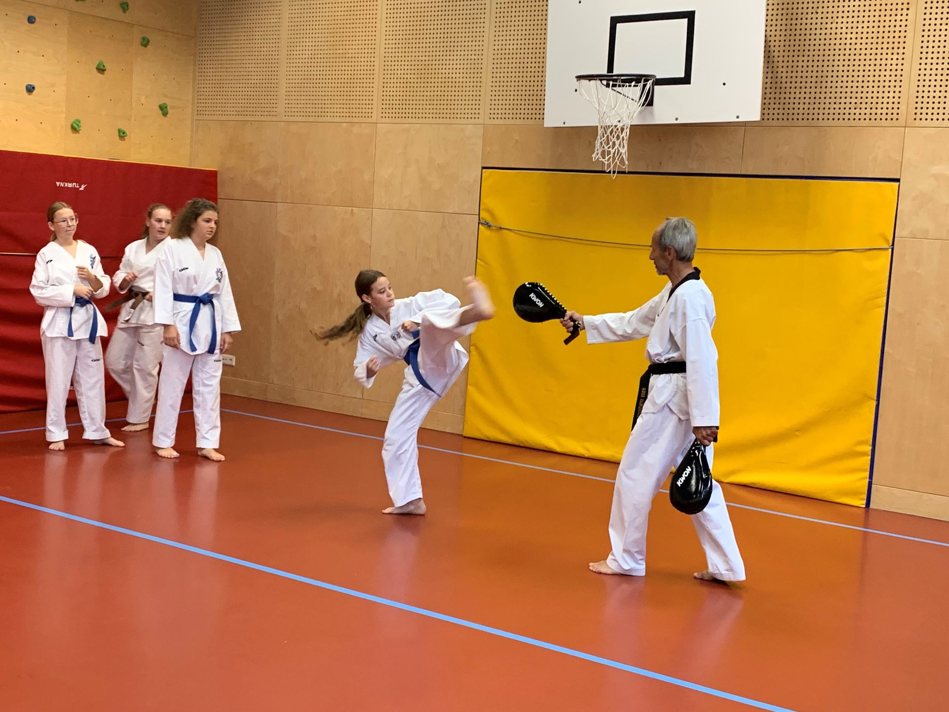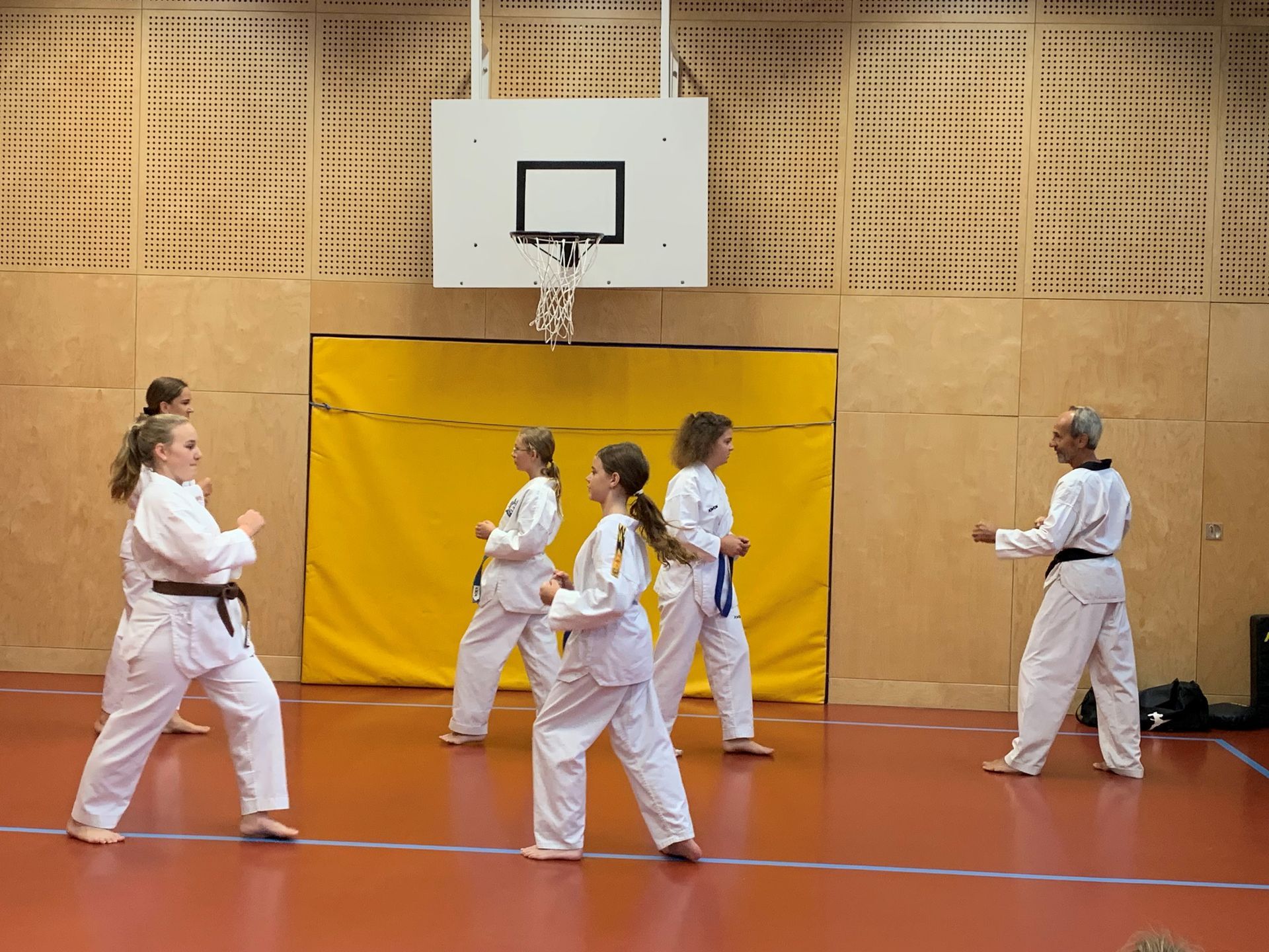 Trainer Rudi Schweiger war mit seinen Taekwondo- Schülerinnen zu Gast in der VS Saxen.
