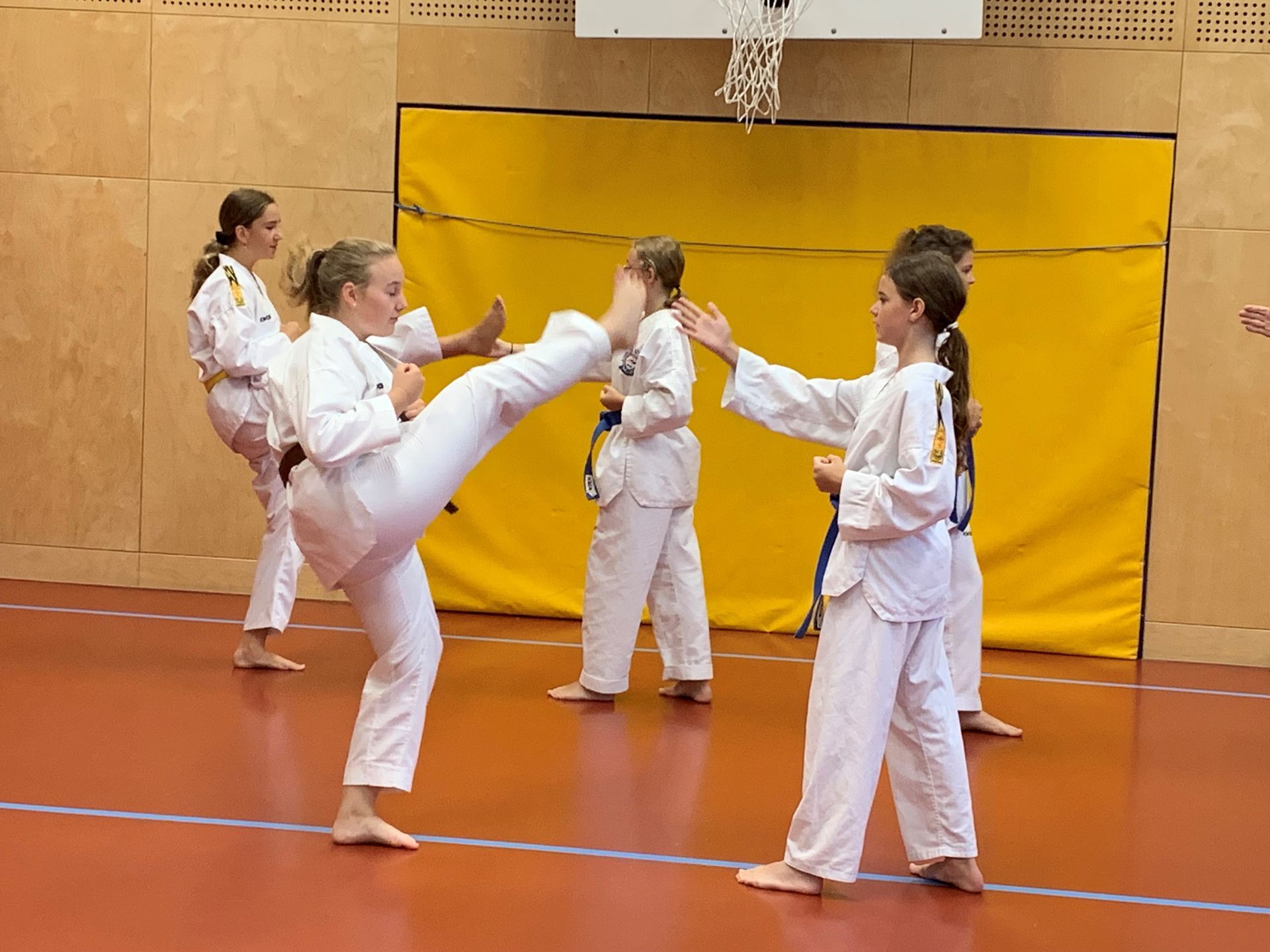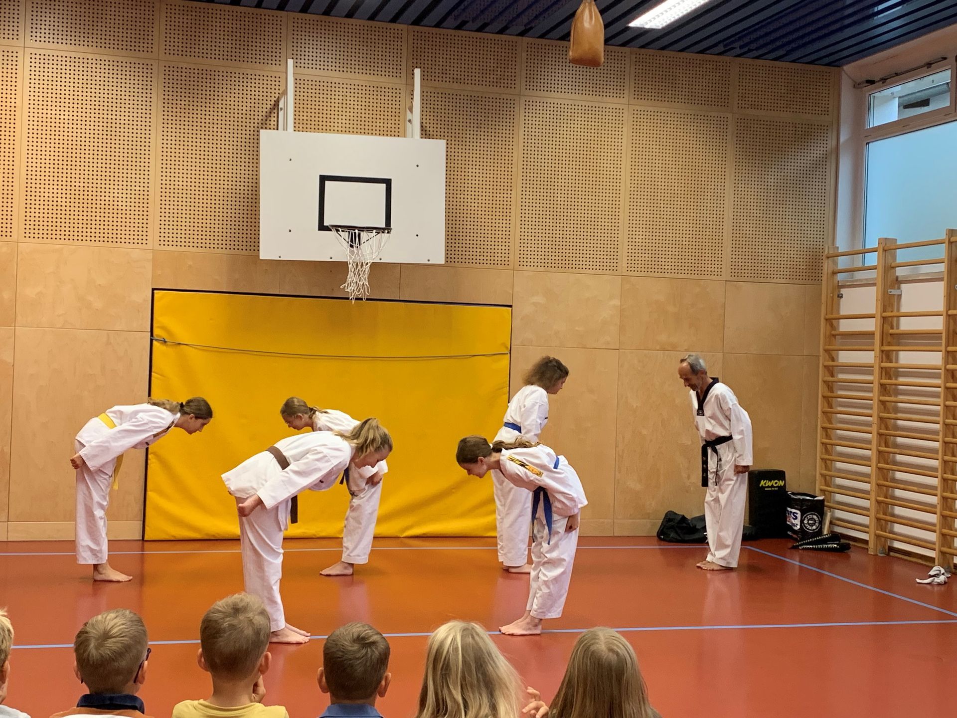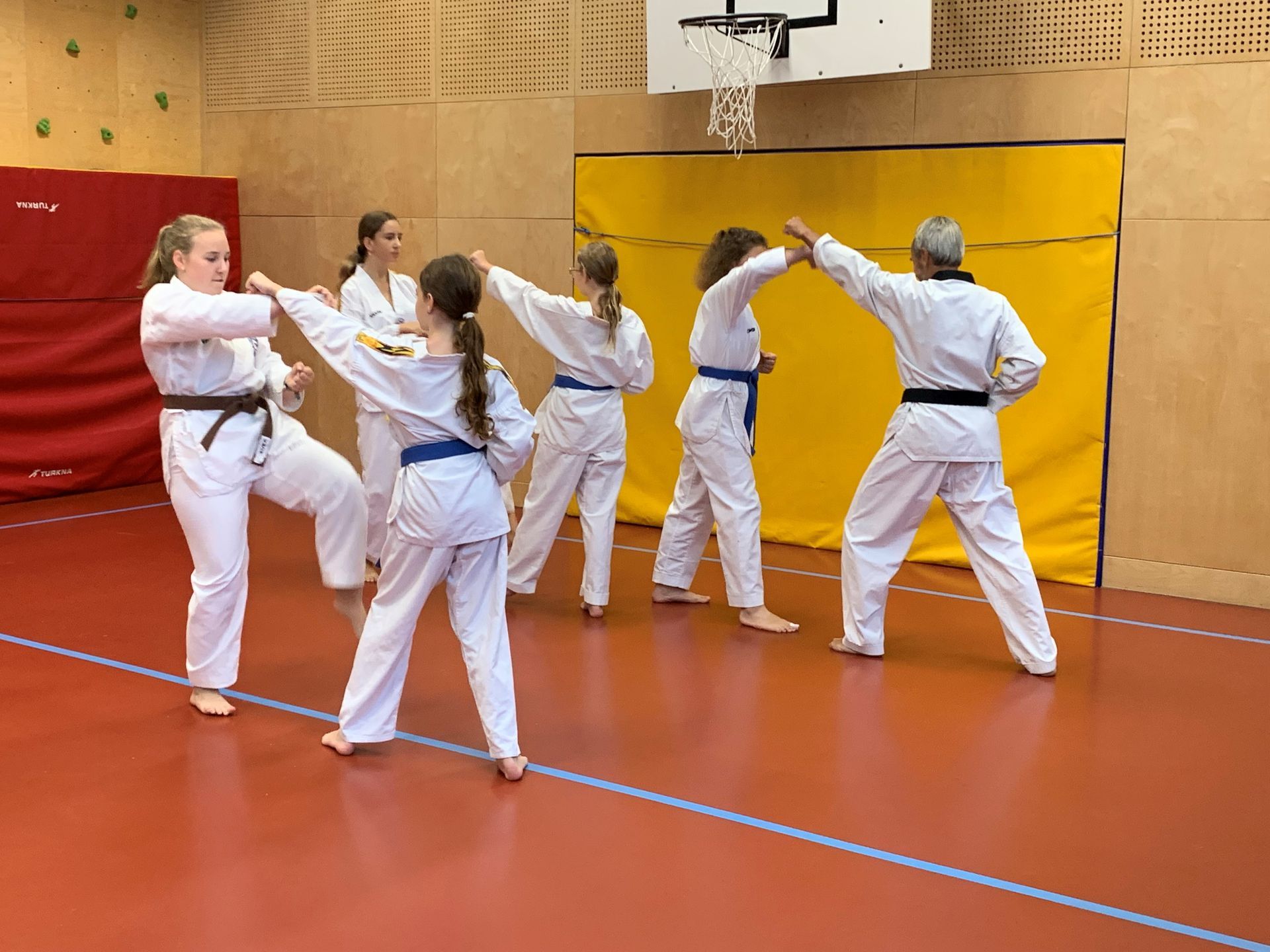 Trainer Rudi Schweiger war mit seinen Taekwondo- Schülerinnen zu Gast in der VS Saxen.