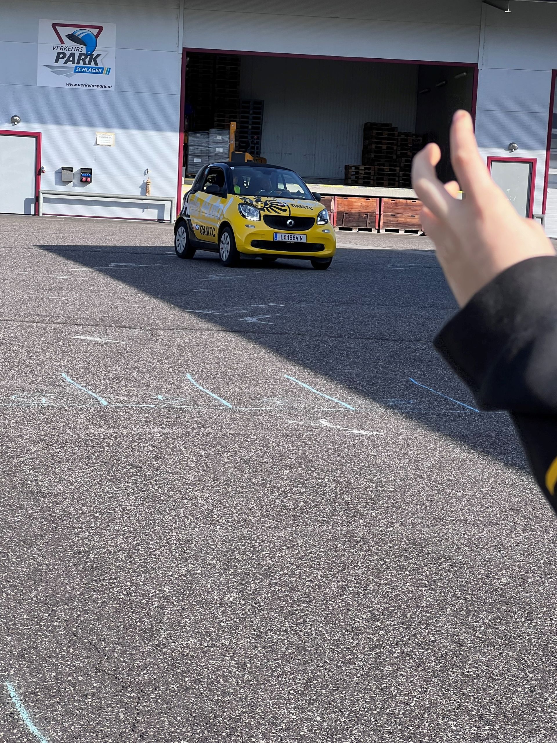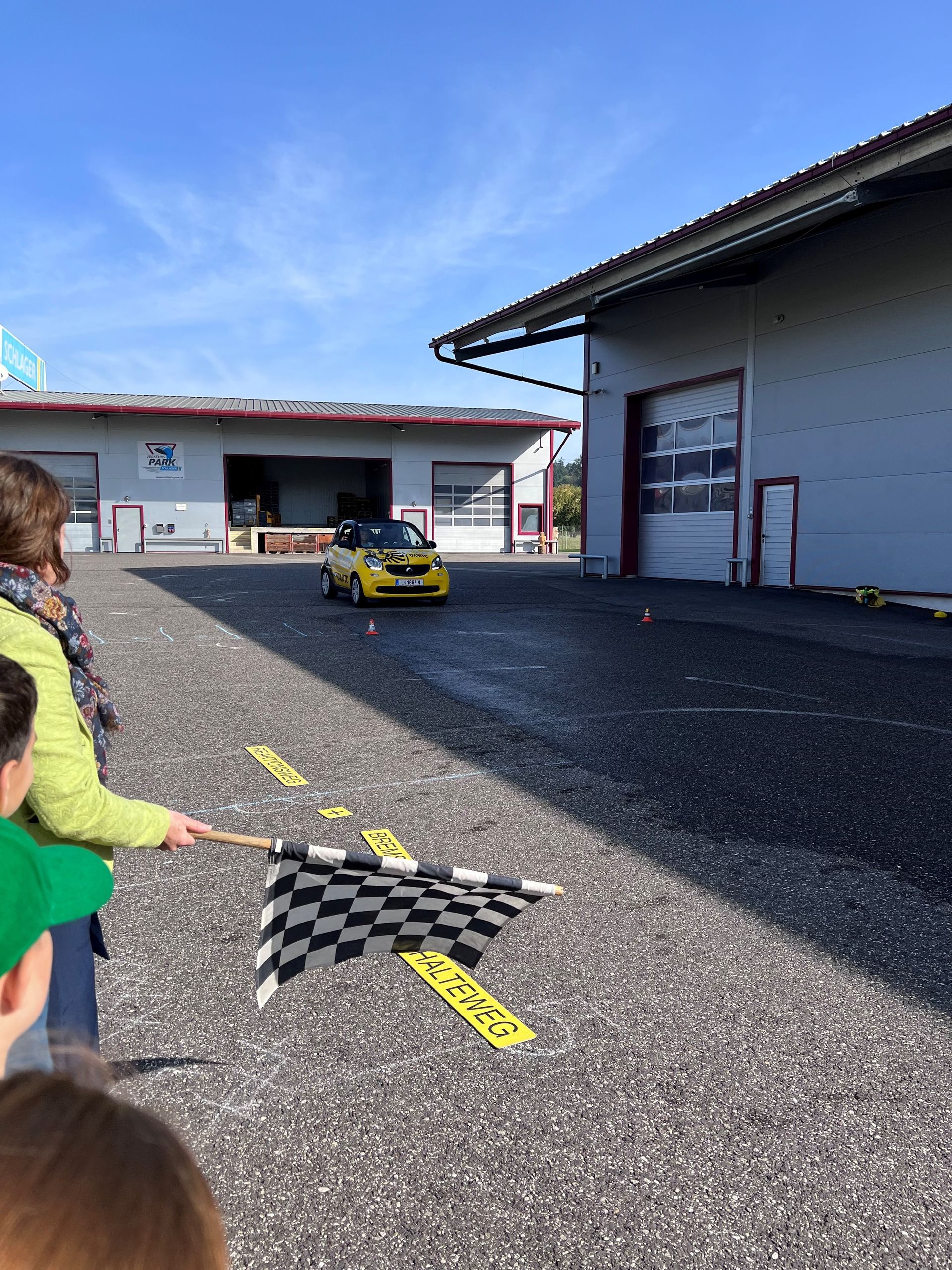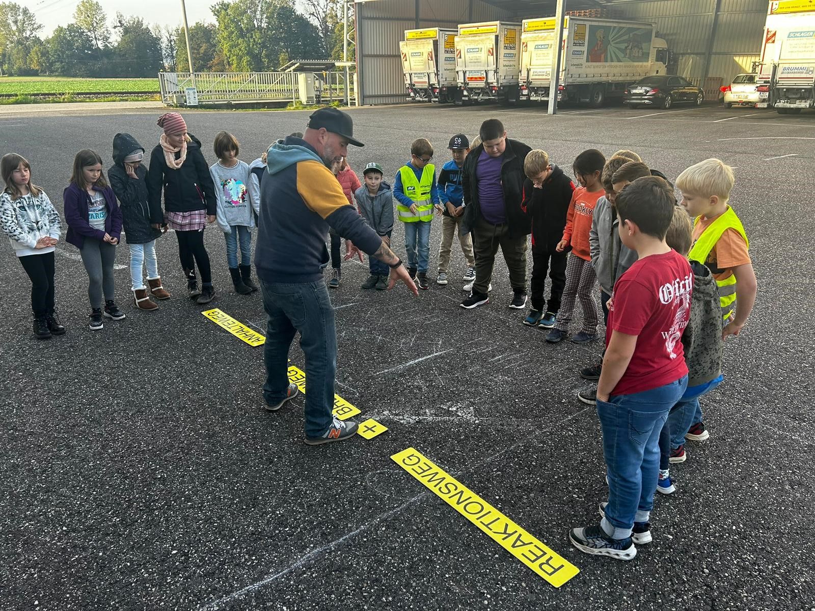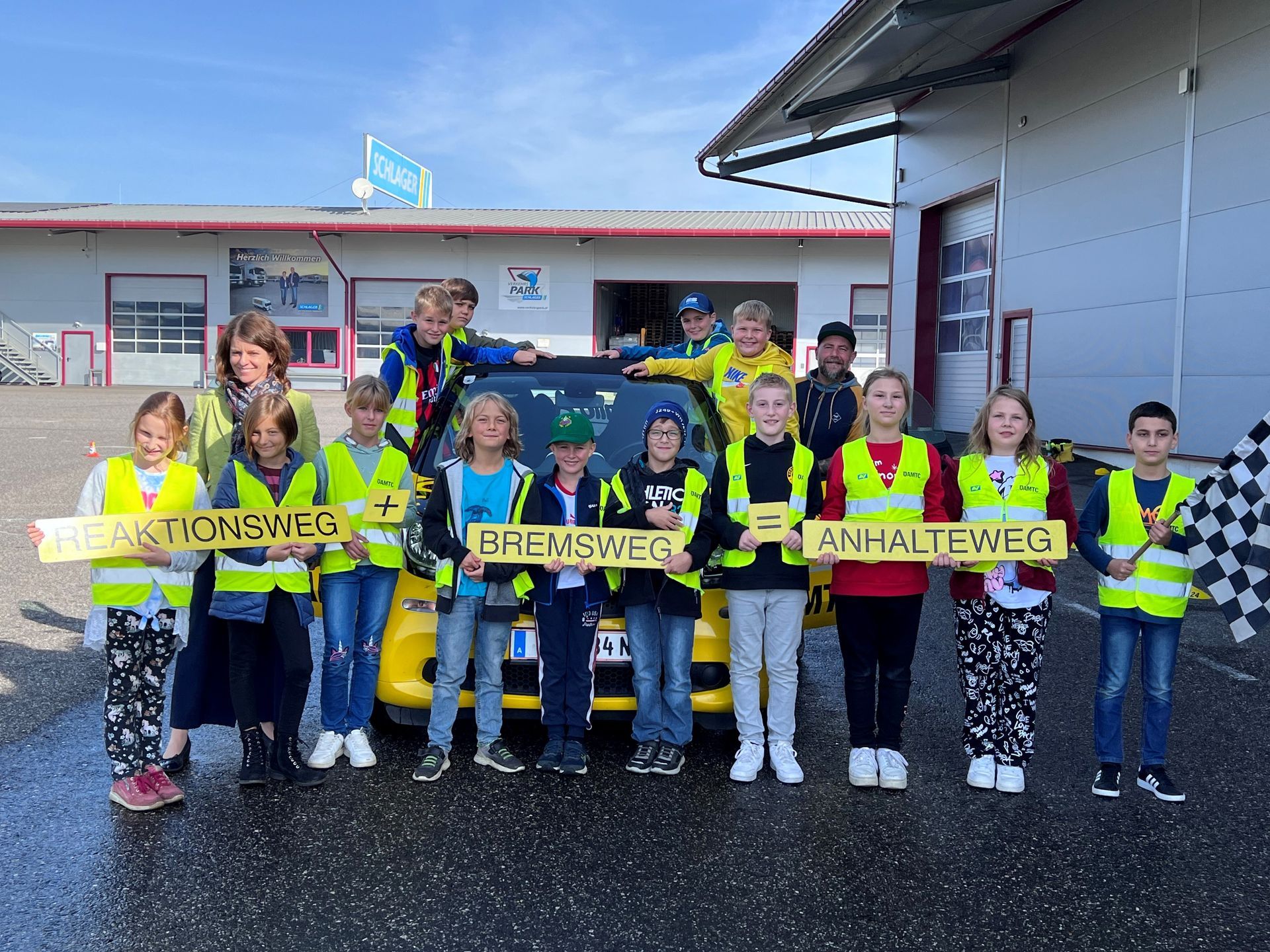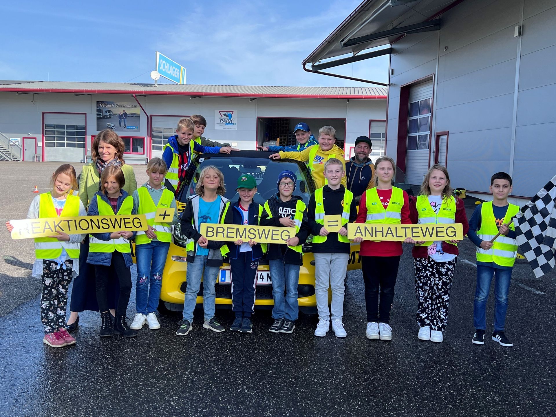 Am Firmengelände der Firma Schlager durften die Kinder der 3. und 4. Klasse hautnah erleben, wie lange ein Auto braucht, um wirklich zum Stillstand zu kommen.