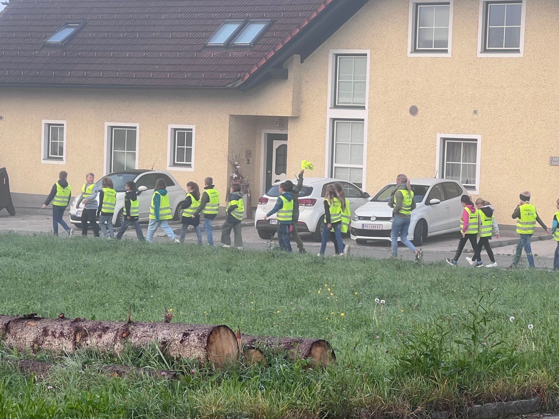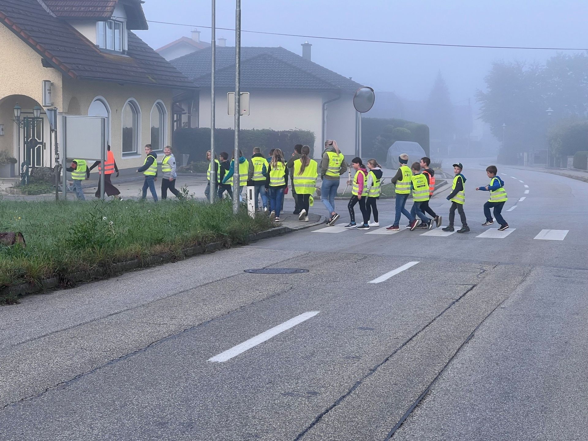 An diesem nebeligen Morgen starteten wir einen Spaziergang, natürlich alle ausgestattet mit einer Warnweste, durch Saxen.