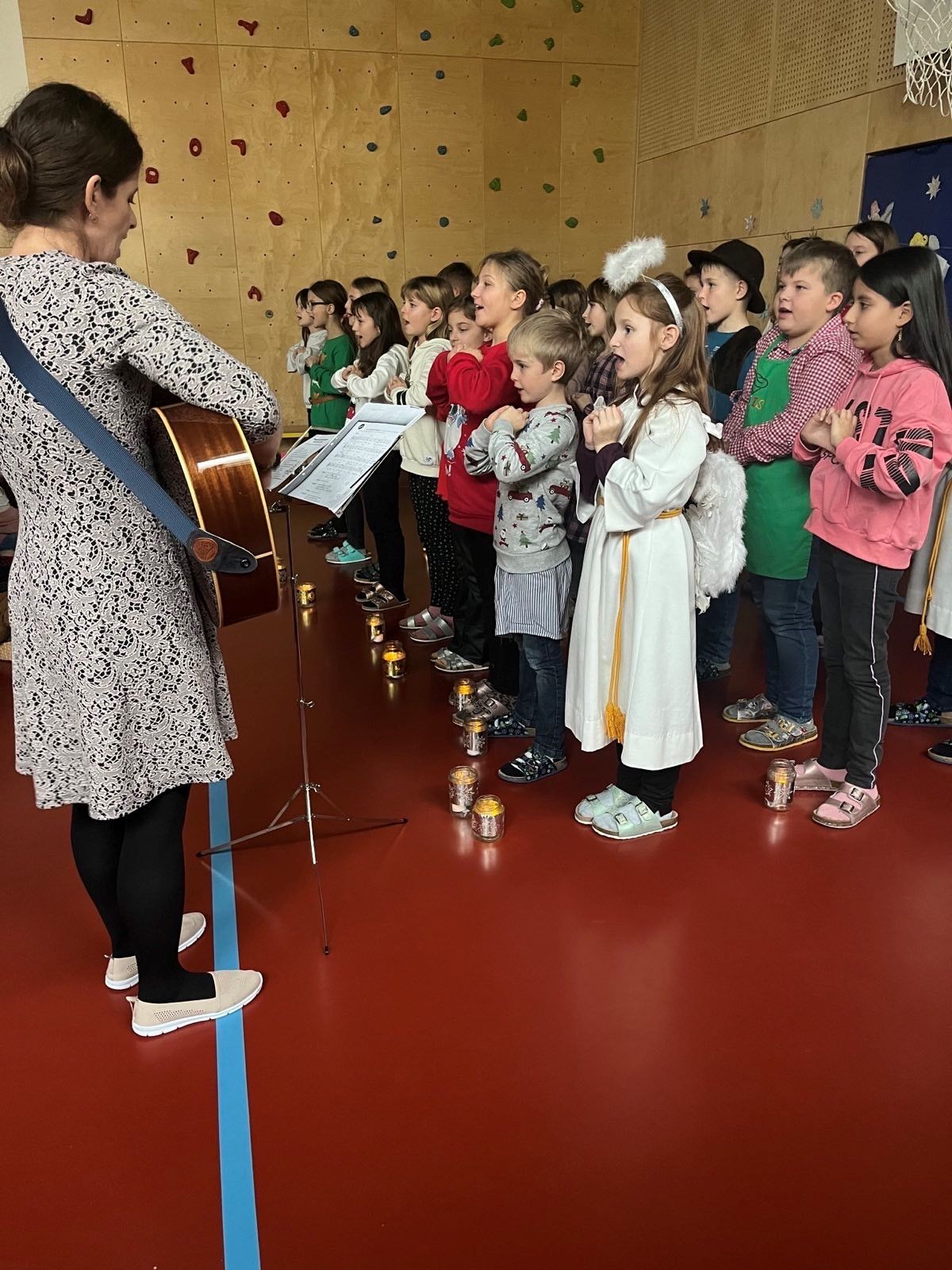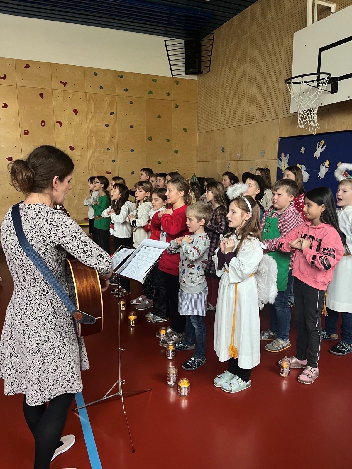 Die Kinder der 3. und 4. Klasse sangen unter der Leitung von Fr. Prof. Margit Obermayr zahlreiche Weihnachtslieder und stimmten uns besinnlich auf das Weihnachtsfest ein.
