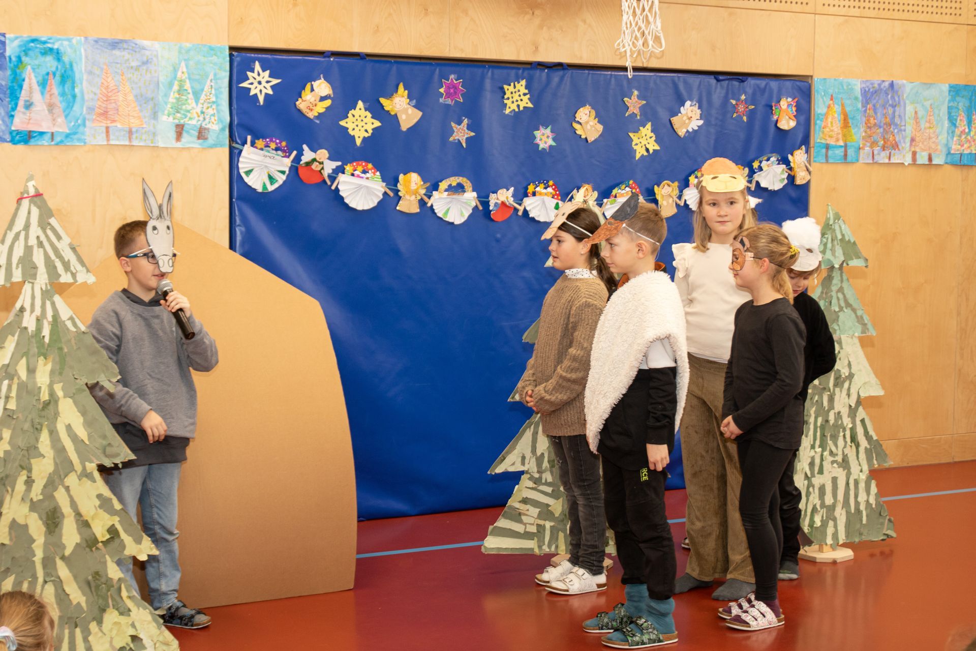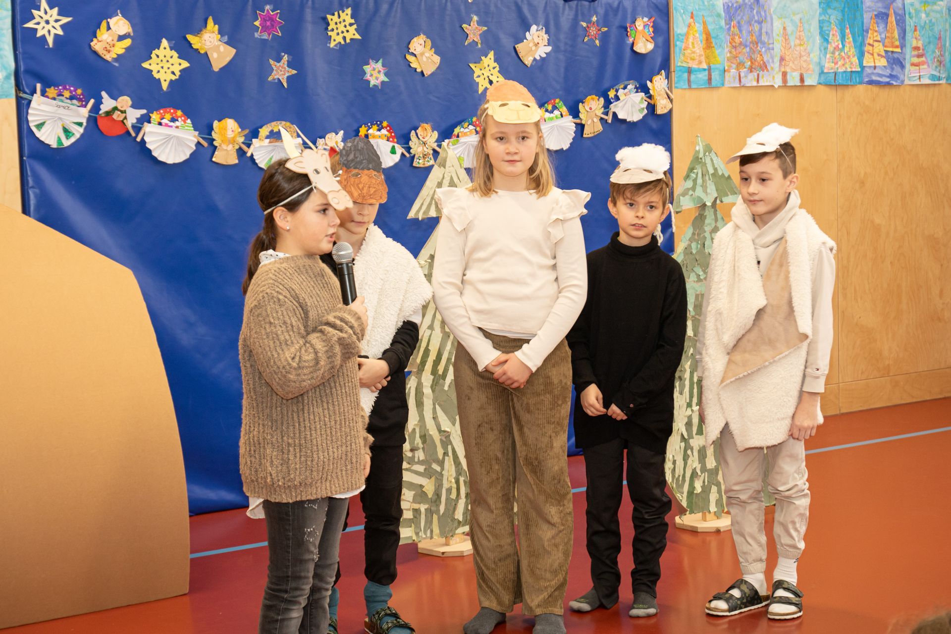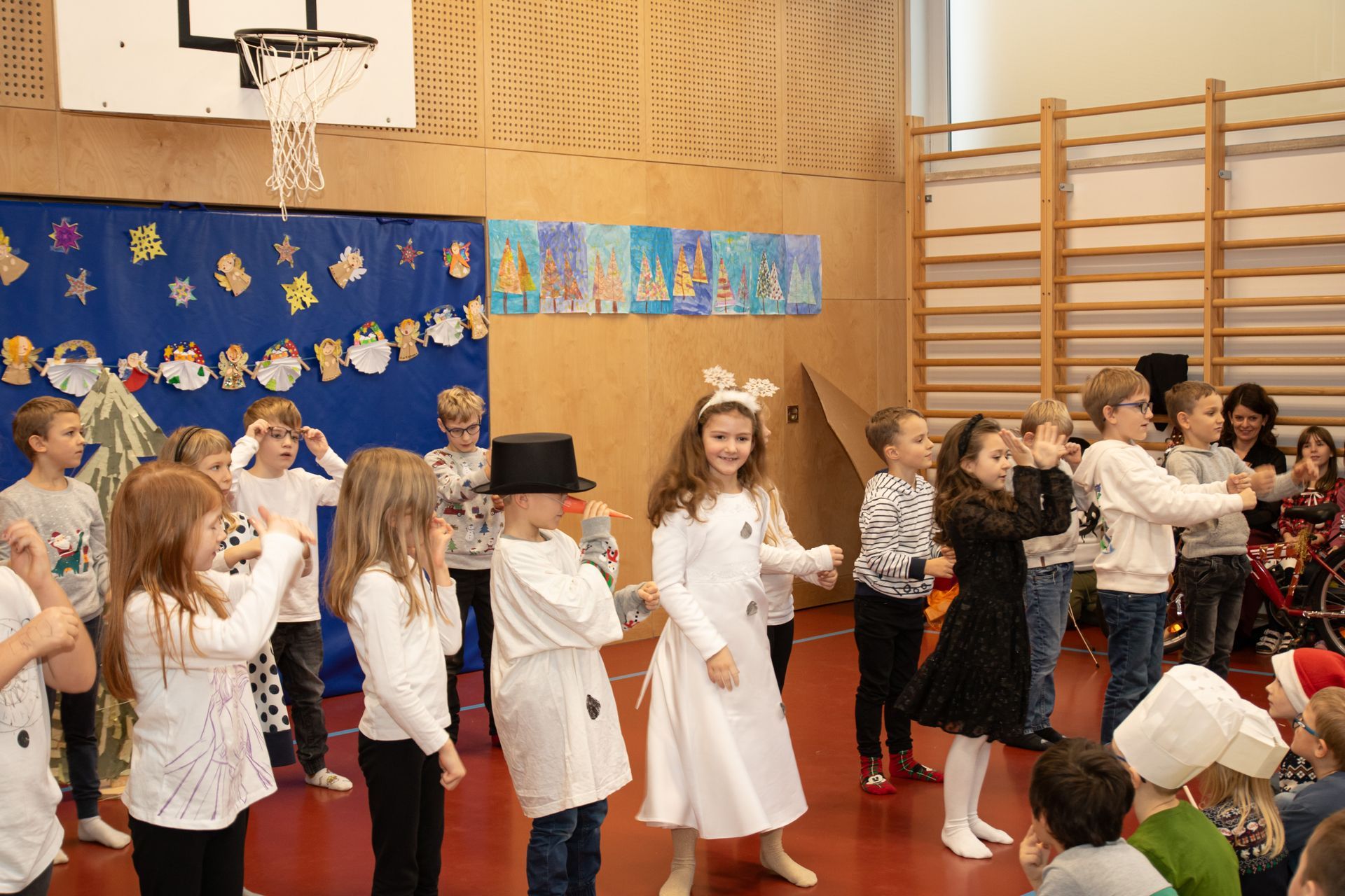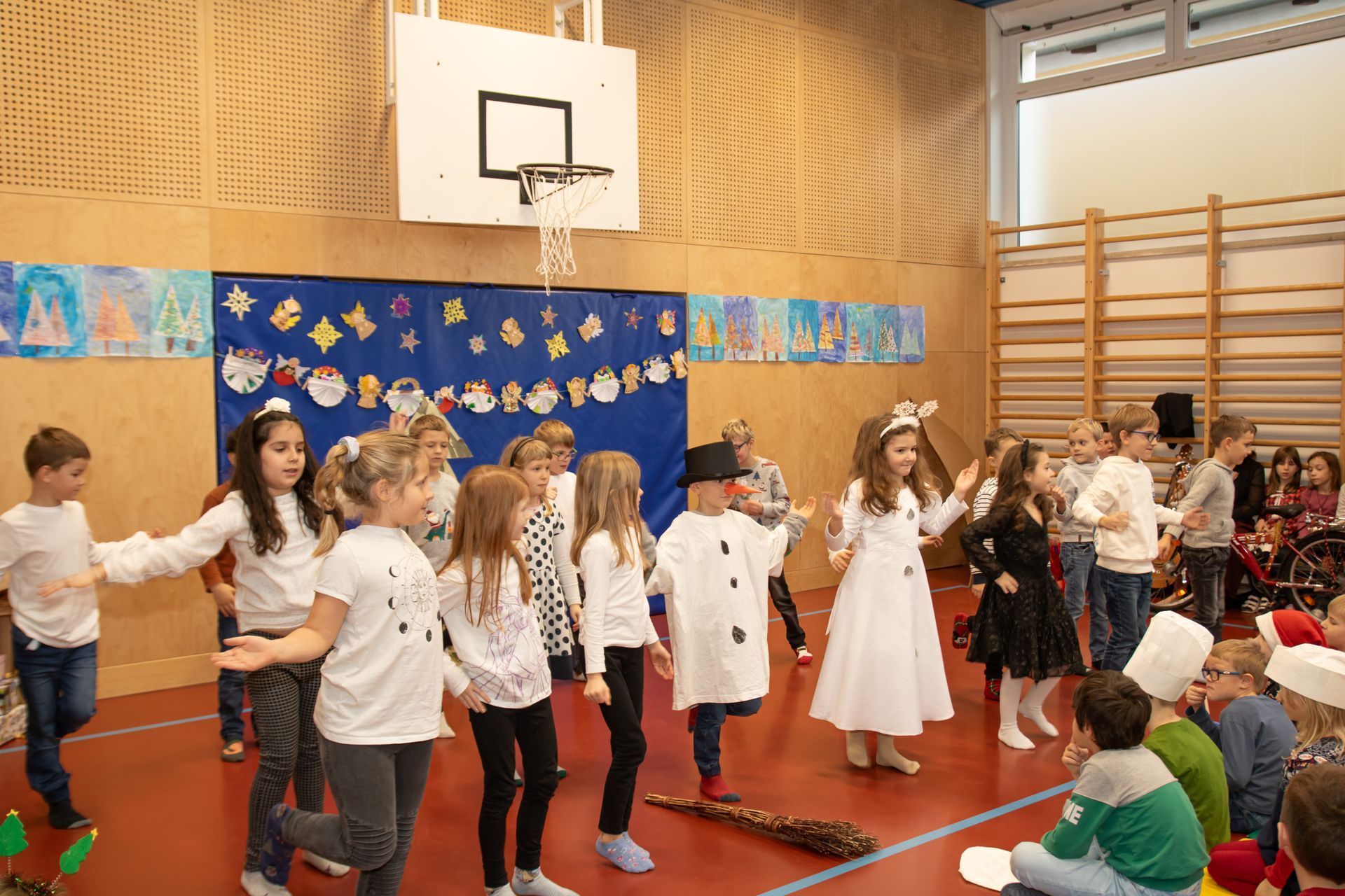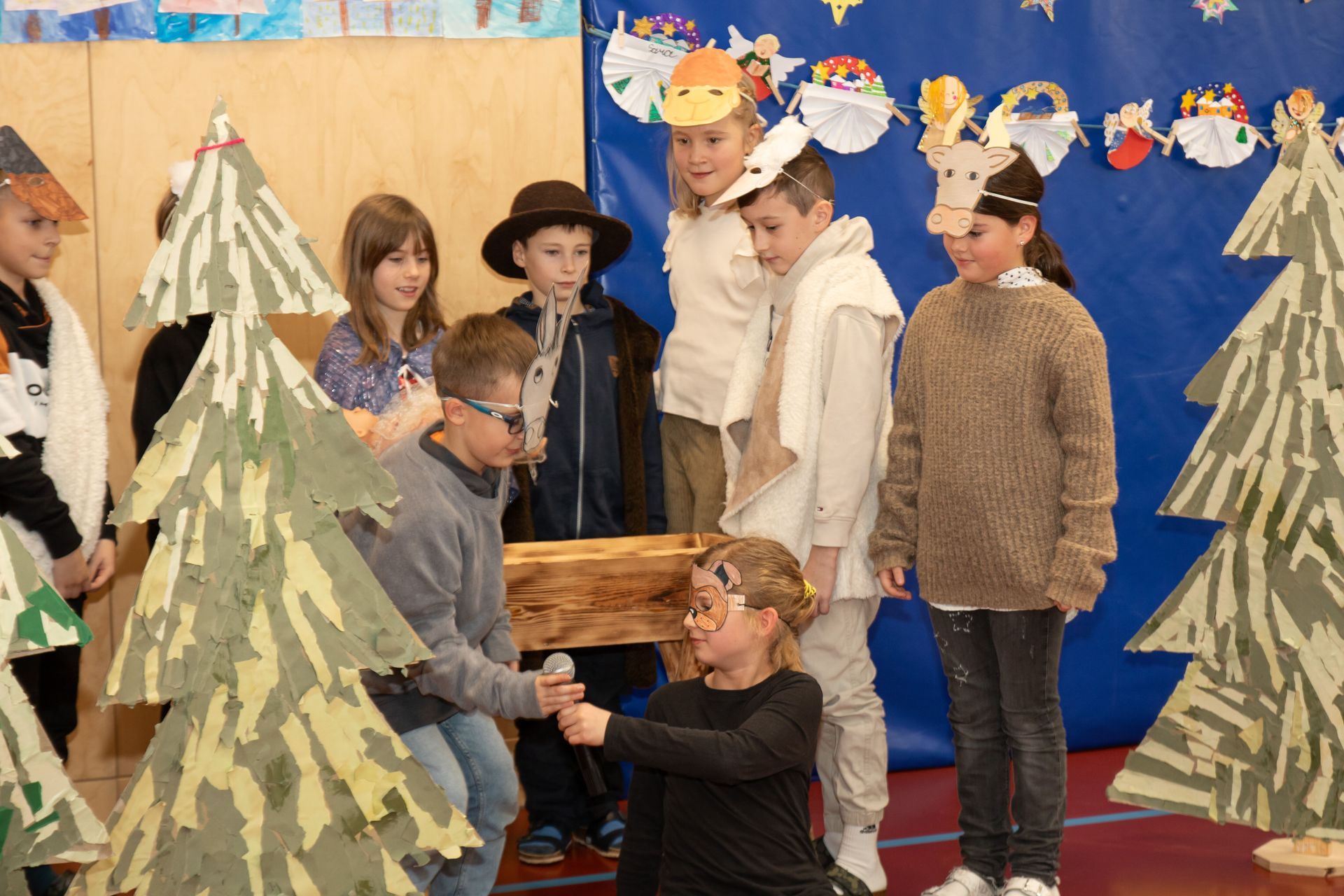 Die Kinder der 3. und 4. Klasse zeigten das Mini- Musical "Ein Dorf feiert Weihnachten", die 1. Klasse sang "In der Weihnachtsbäckerei", die 2. Klasse tanzte zum Schneemannlied. Das Hirtenspiel zeigte die 3. Klasse.