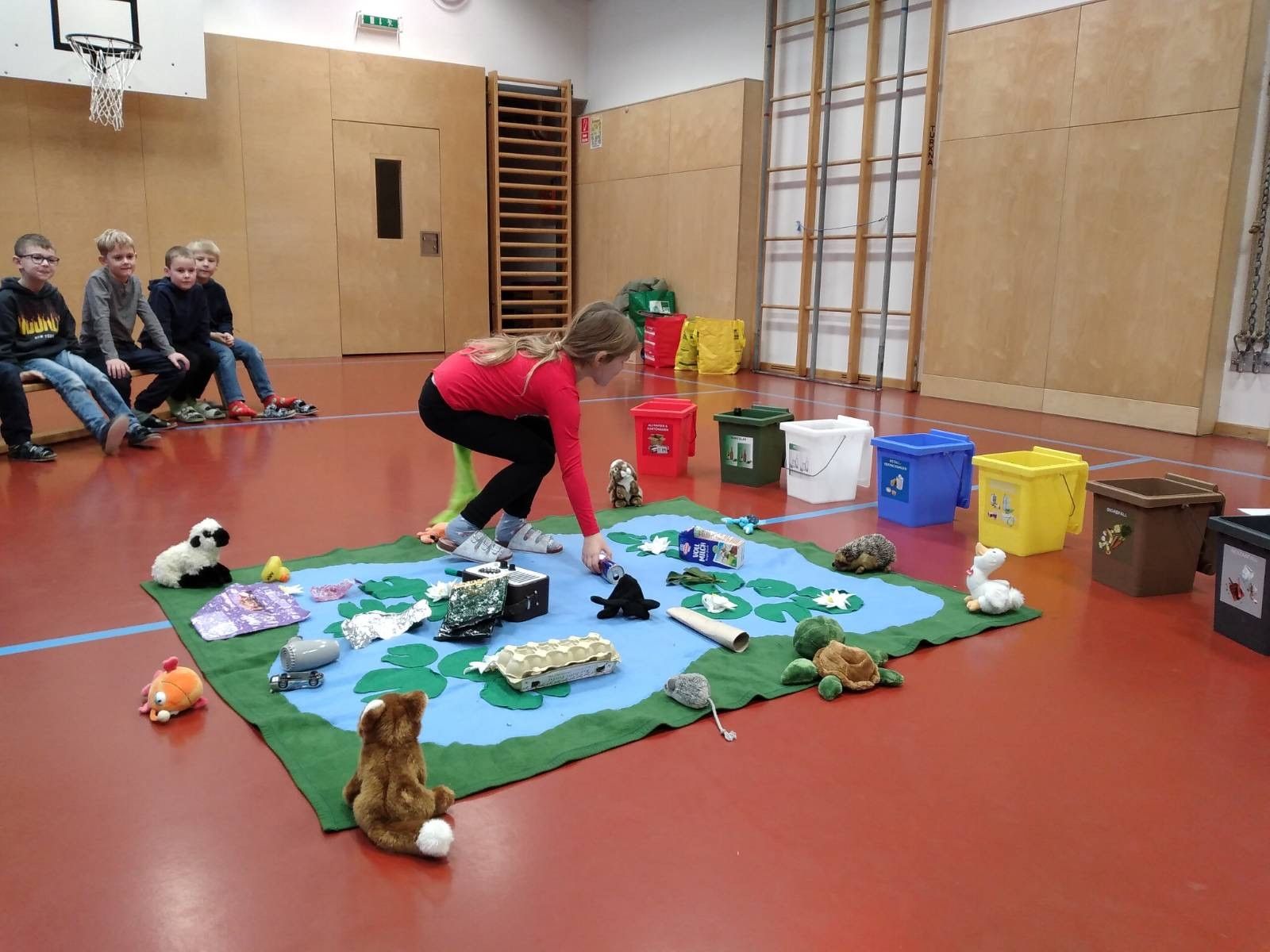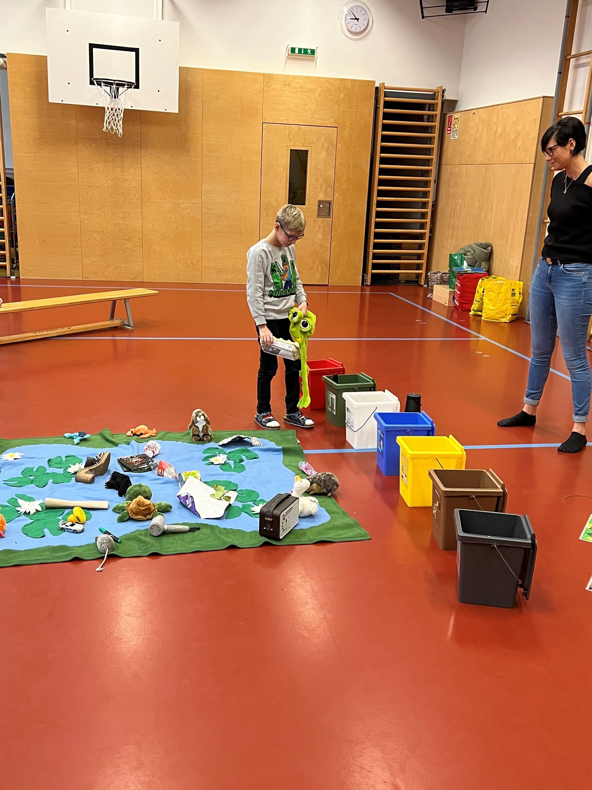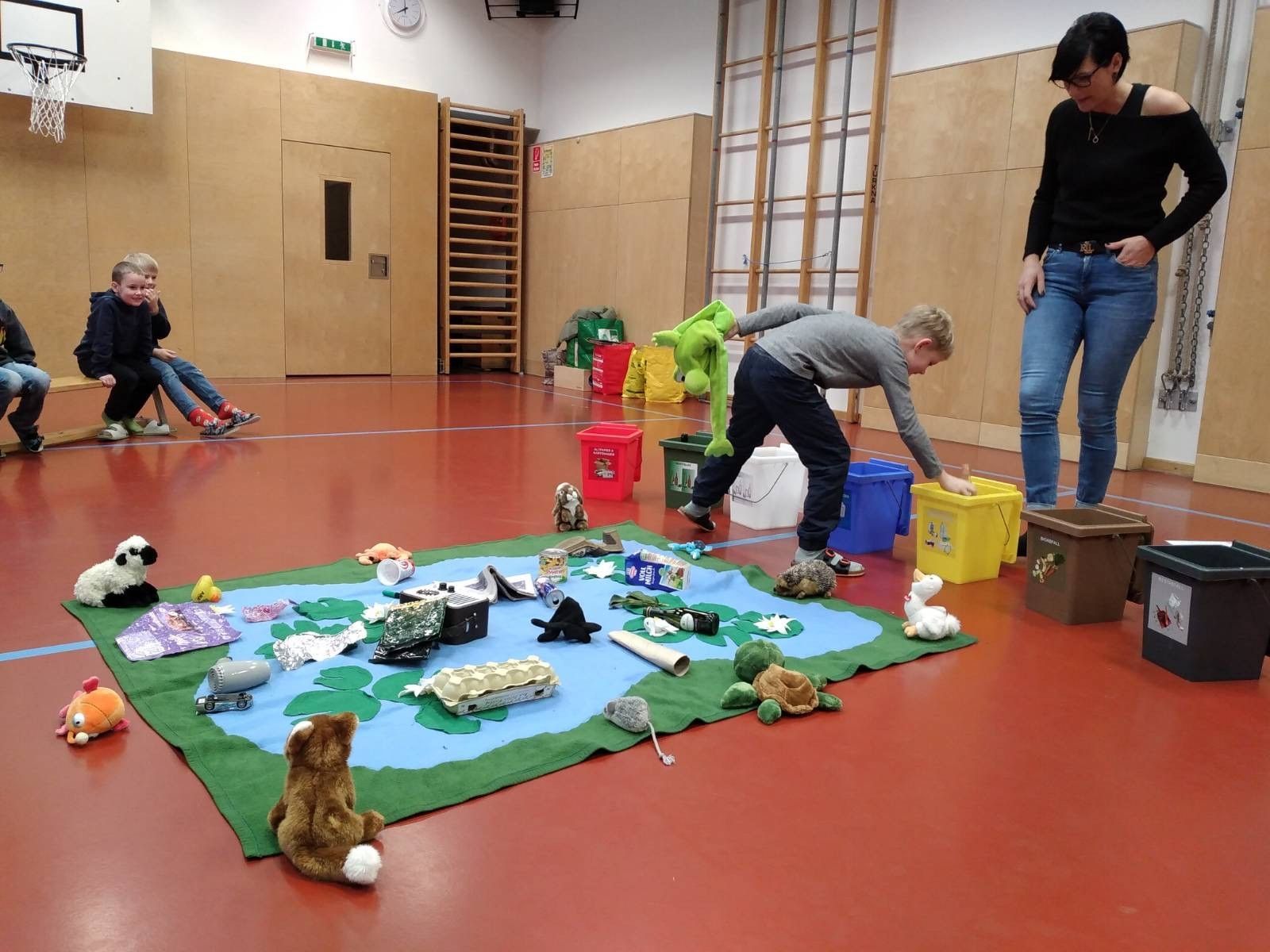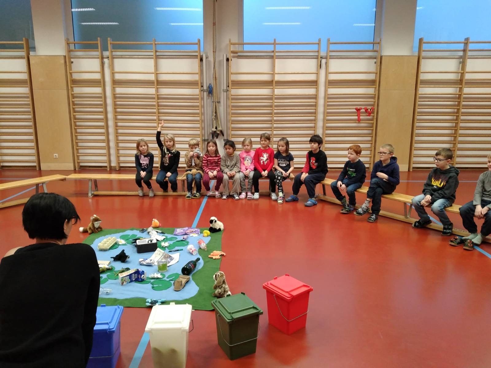 Damit die Kinder richtige Mülltrennung auf spielerische Weise erlernen, fand eine Workshop des Abfallverbandes Perg am Montag. 11.12.23 an der VS Saxen statt.