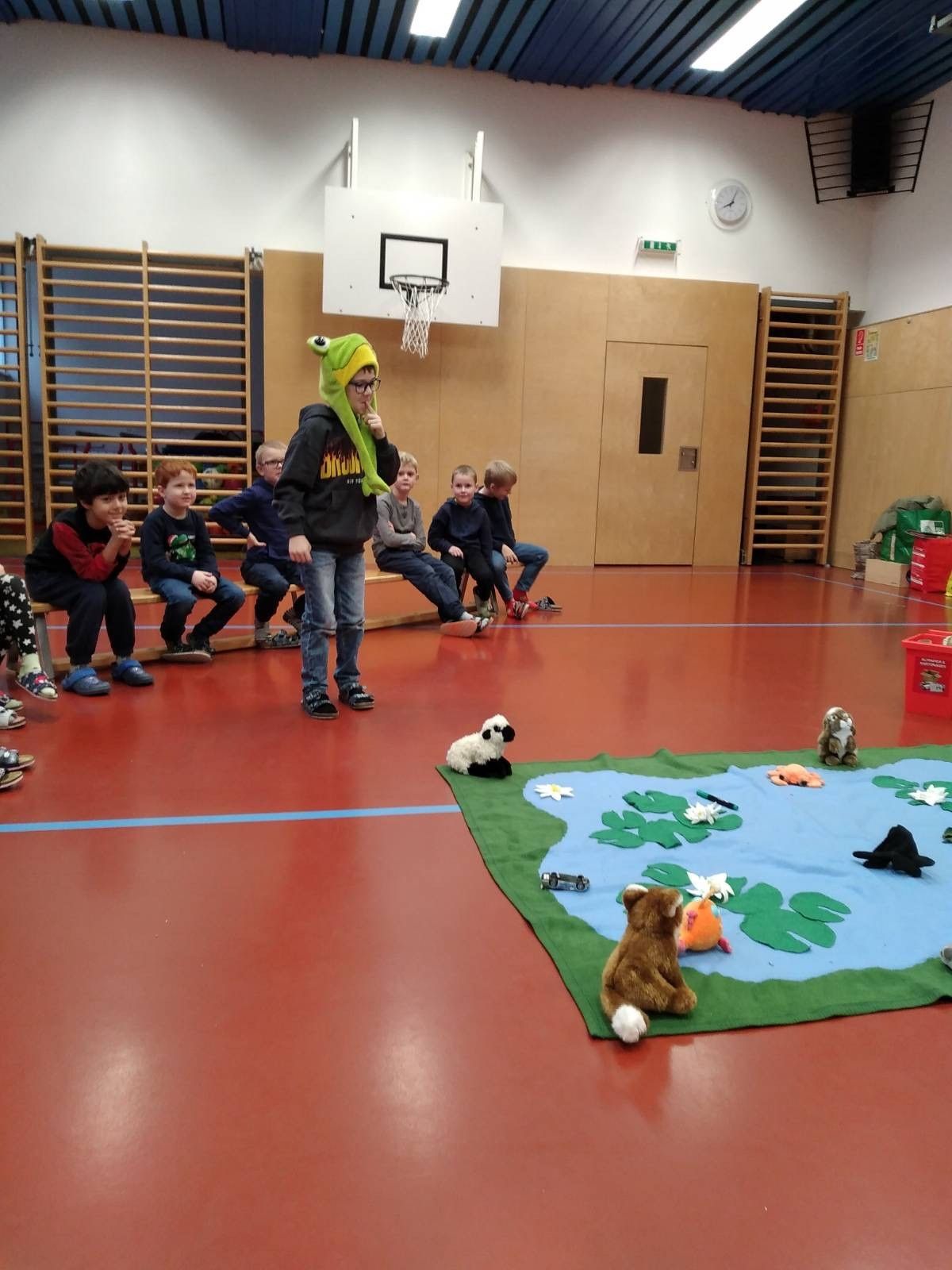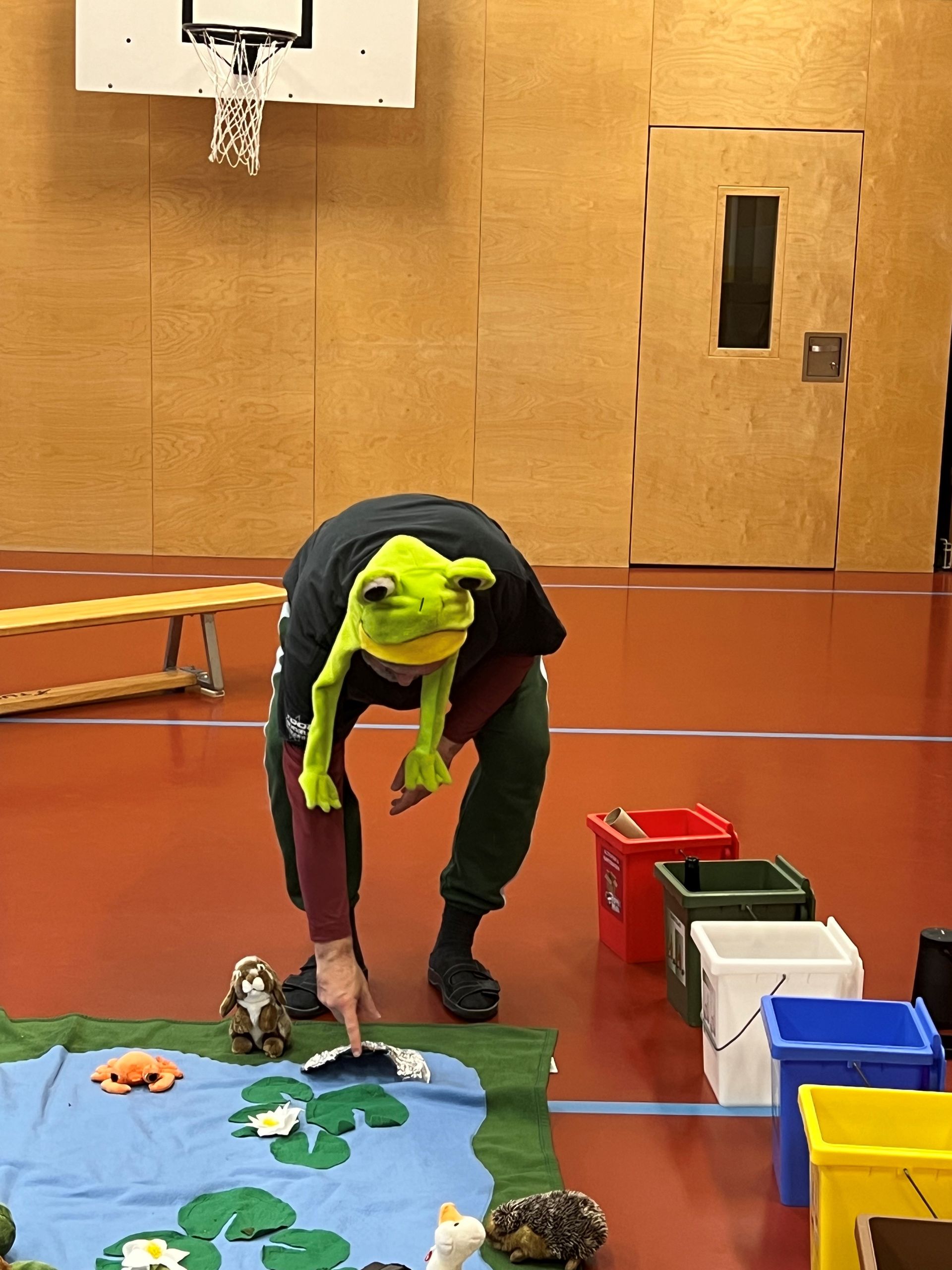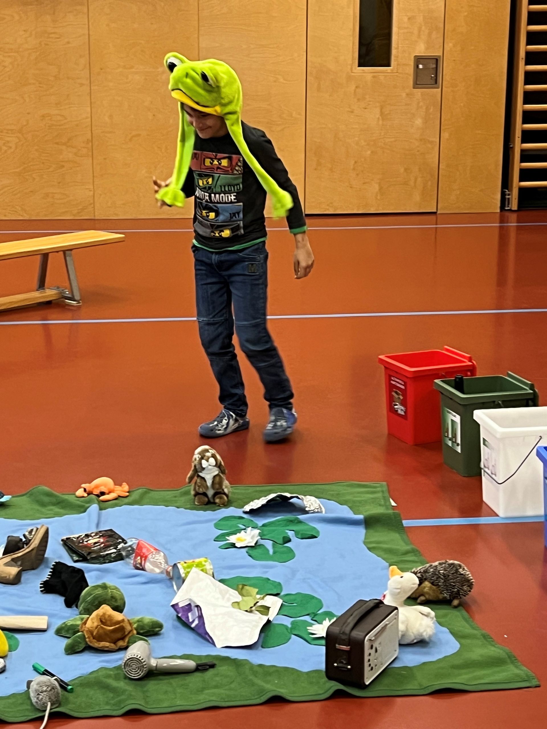 Der Seerosenteich von Quaxi war komplett vermüllt. Die Kinder halfen dem Frosch den Teich zu reinigen und den Müll richtig zu entsorgen.