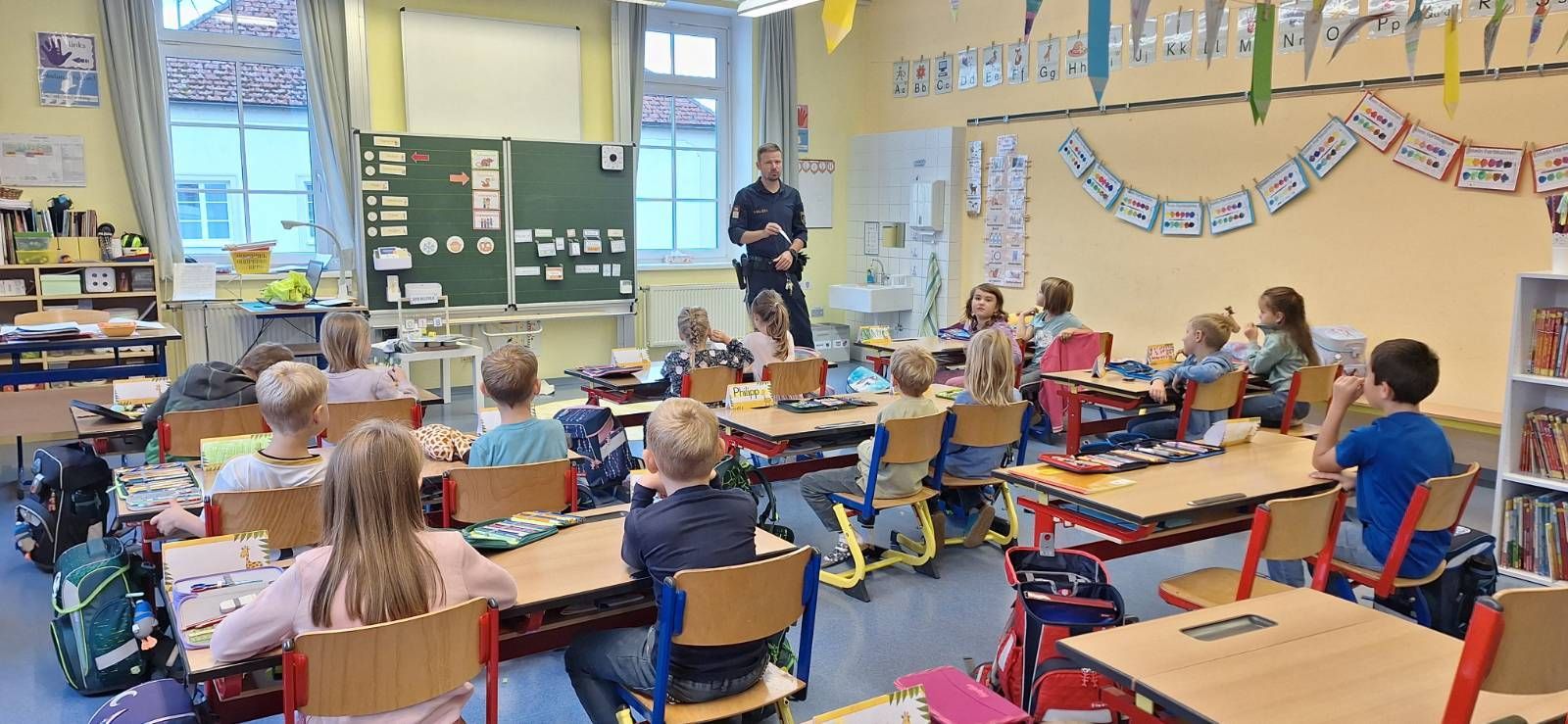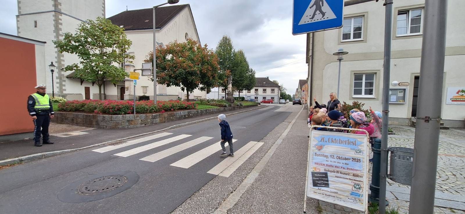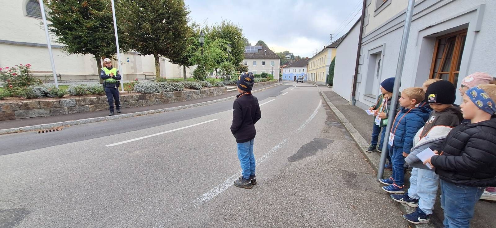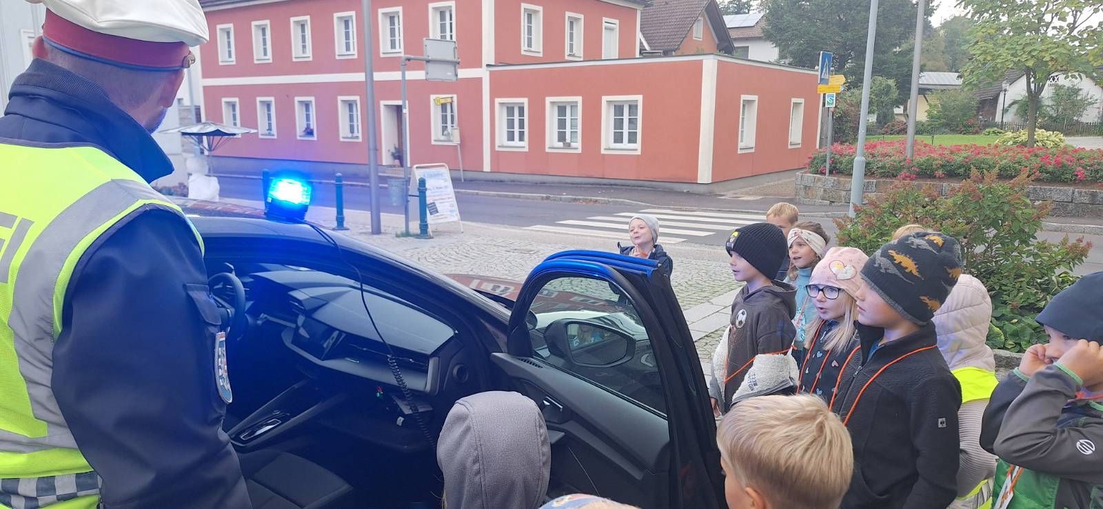 Am 1. Oktober besuchte die Kinder der 1. Klasse in Saxen ein Polizist des Postens Grein. Zuerst wurde in der Klasse das richtige Verhalten auf der Straße besprochen. Im Anschluss übten die Kinder das Überqueren der Straße am Zebrastreifen und an unübersichtlichen Stellen in Saxen. Das Polizeiauto in Zivil verwunderte auch einige Kinder, erst das Blaulicht überzeugte sie.