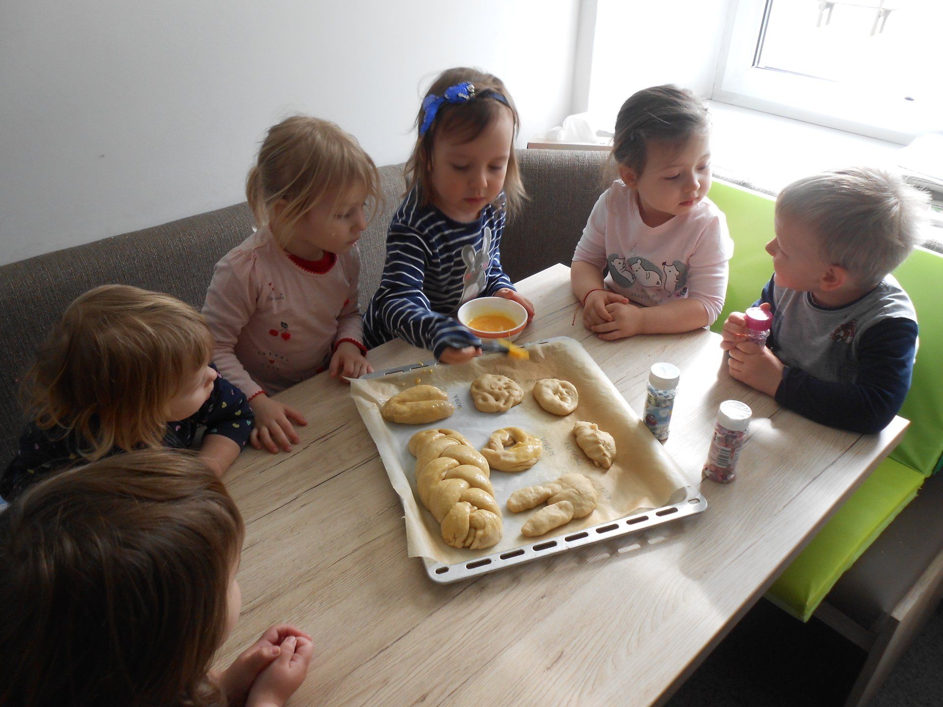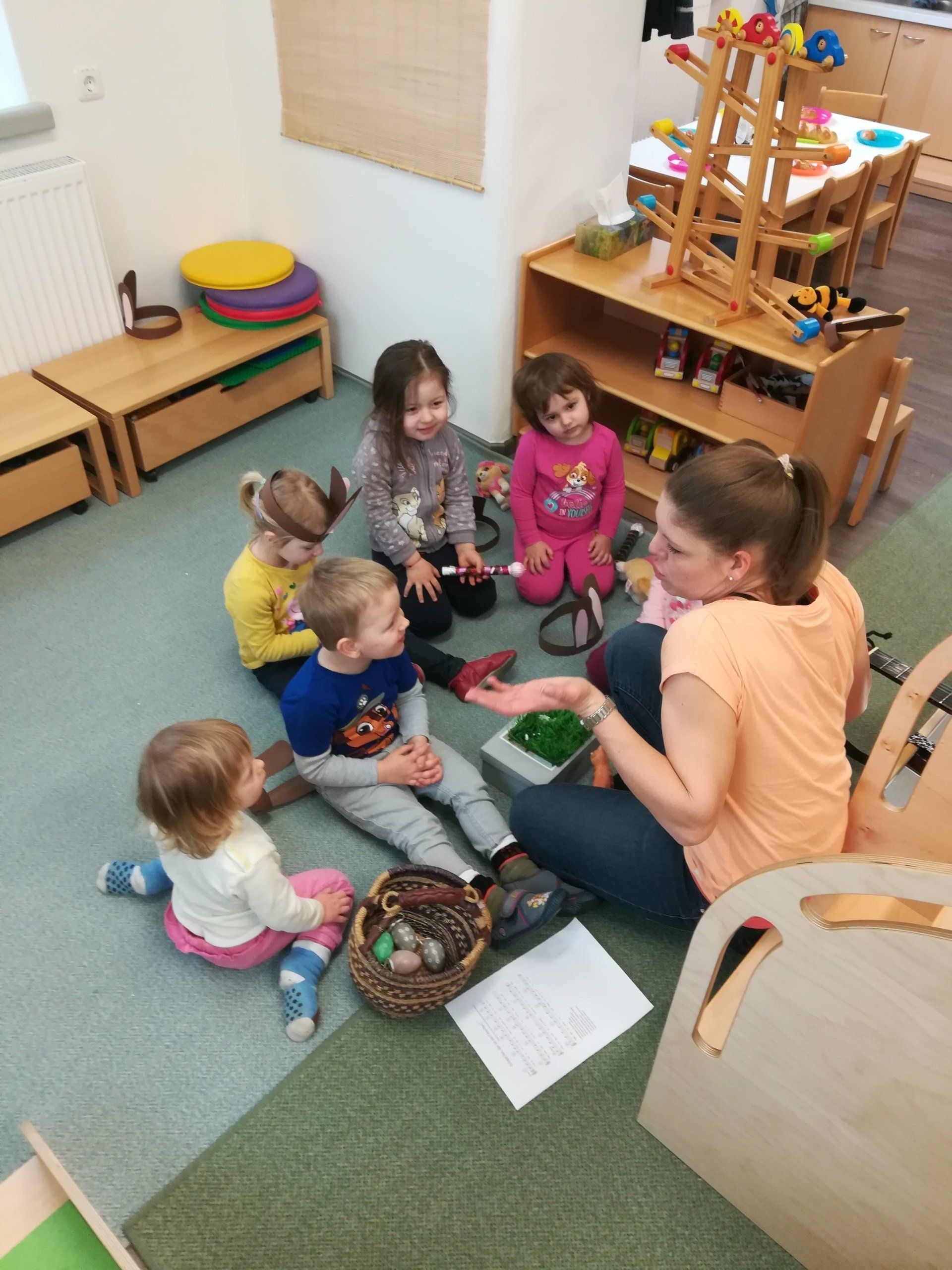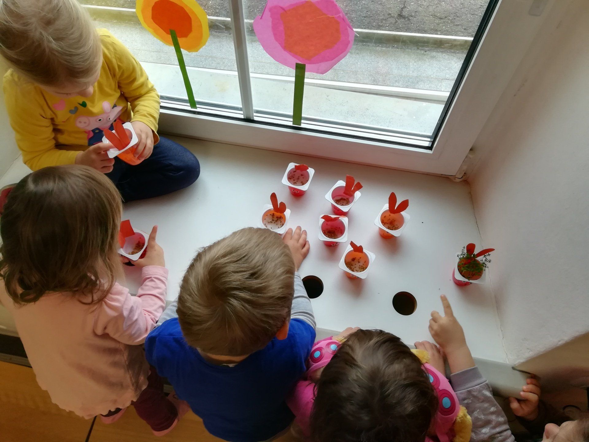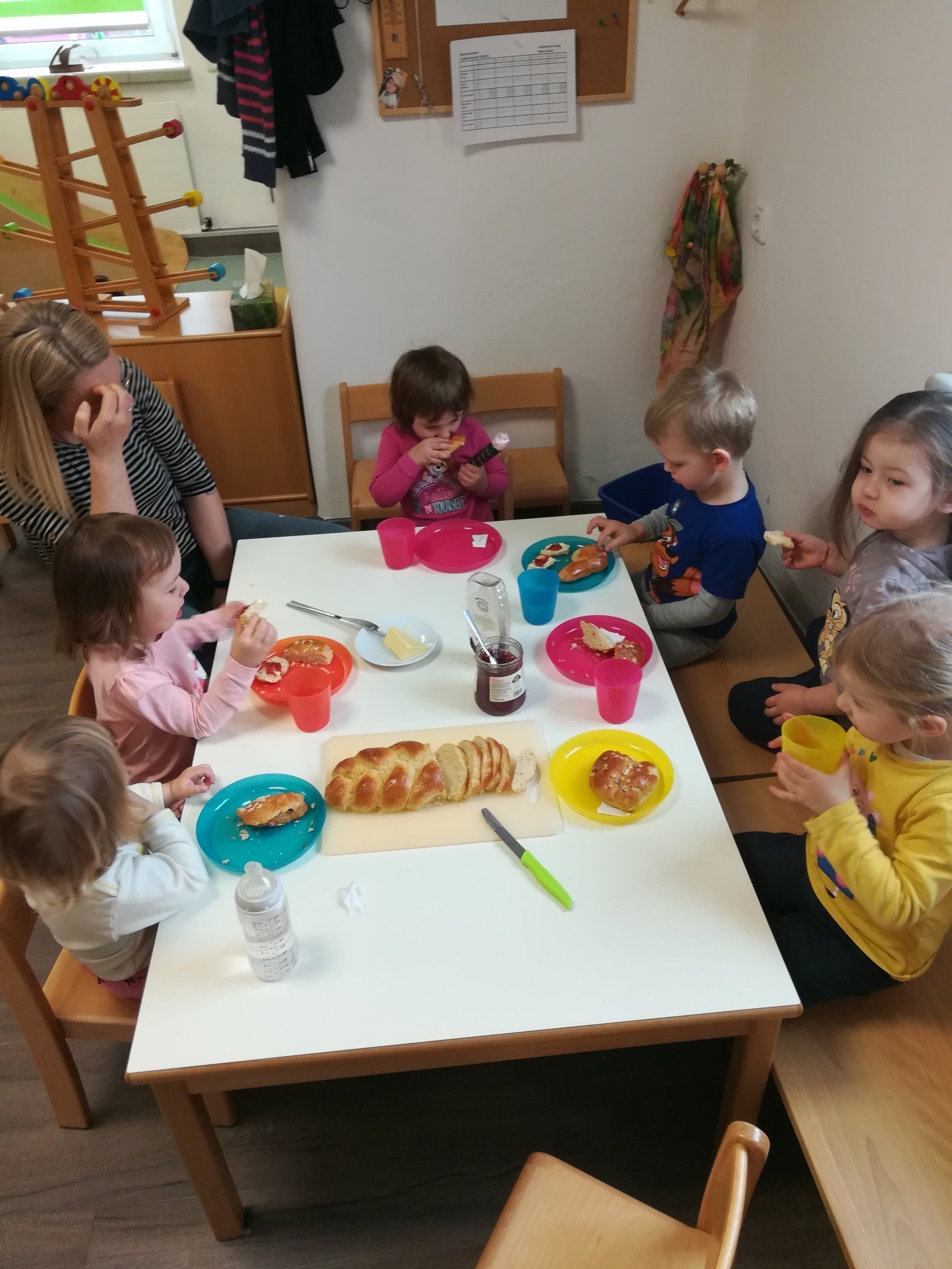 Zu Ostern ist ganz schön viel los bei uns in der Krabbelstube! Gemeinsam bauen wir Kresse an, kochen Eierspeise für die Jause, backen einen Osterstriezel, färben Ostereier und natürlich darf das Basteln und Singen nicht zu kurz kommen. Zum gemeinsamen Osterfest vor den Ferien bekamen wir sogar tierischen Besuch - frisch geschlüpfte Küken und einen zutraulichen Hasen durften wir einen Vormittag lang beobachten und füttern. Und dann hat sogar noch jemand die selbst gebastelten Osternester mit kleinen Leckereien befüllt und im Garten versteckt! Wer das wohl war...?