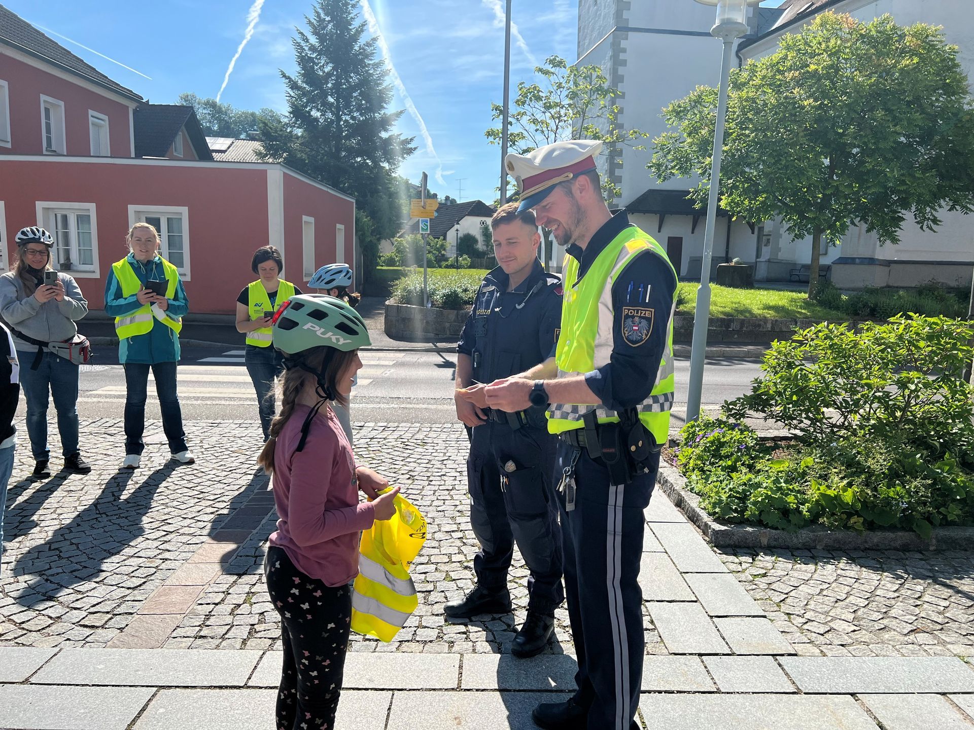 Zwei Polizisten aus Grein inspizierten noch vor der Fahrt die Helme und Räder der Kinder.