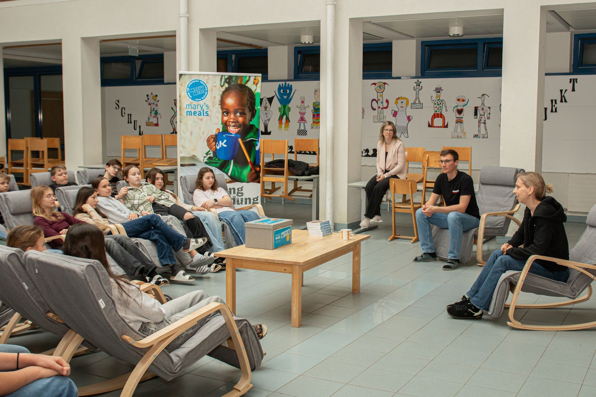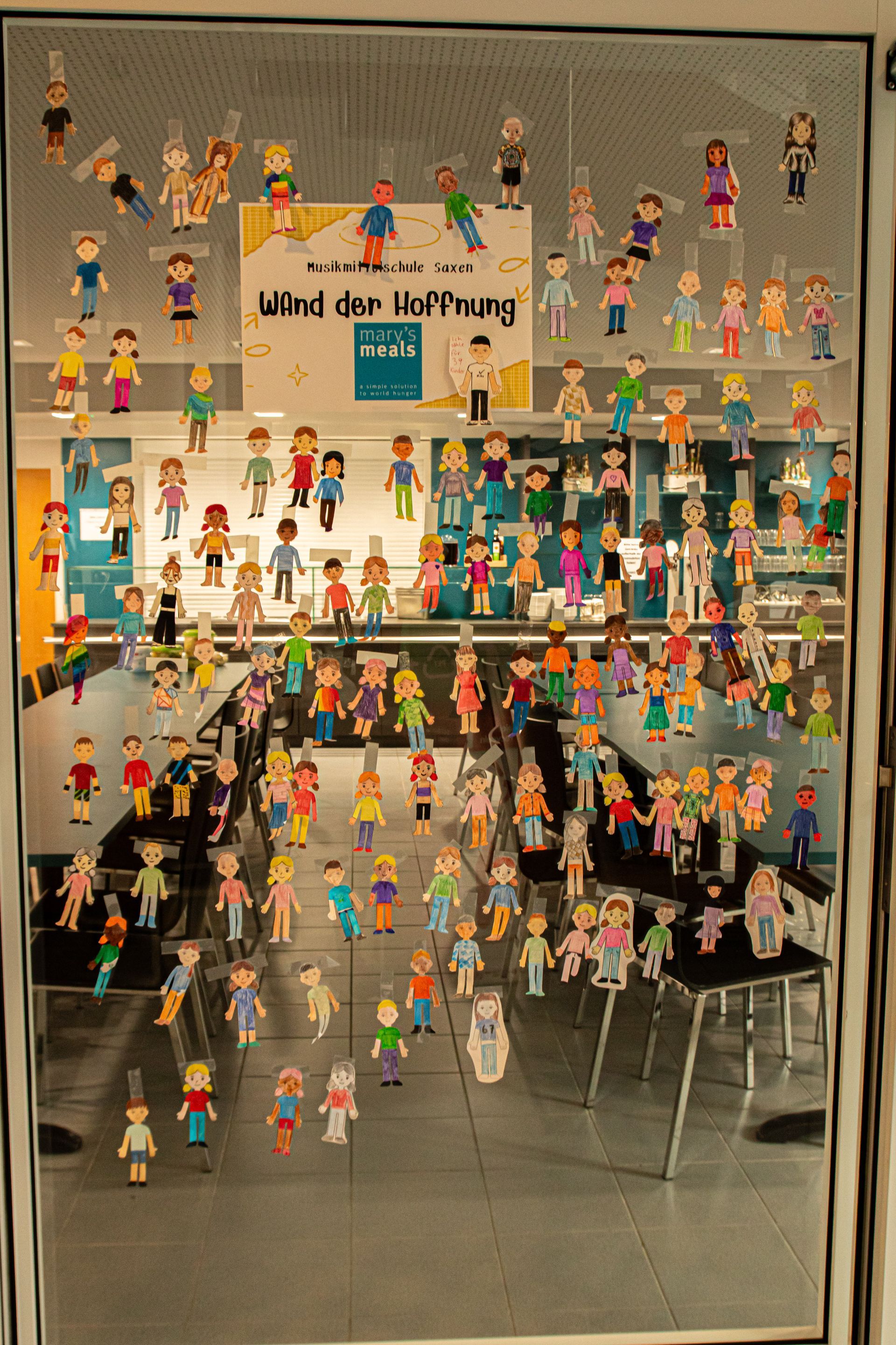 Die Kinder beklebten im Religionsunterricht mitgebrachte Tassen mit dem blauen Logo von Mary‘s Meals, um damit die Spenden zu sammeln. Hintergrund ihres Engagements ist die Arbeit von Mary’s Meals: Die Organisation stellt Kindern in einigen der ärmsten Regionen der Welt täglich eine Mahlzeit in der Schule bereit. Ziel ist es, Hunger zu lindern und gleichzeitig Bildung zu ermöglichen, da regelmäßige Mahlzeiten den Schulbesuch fördern.