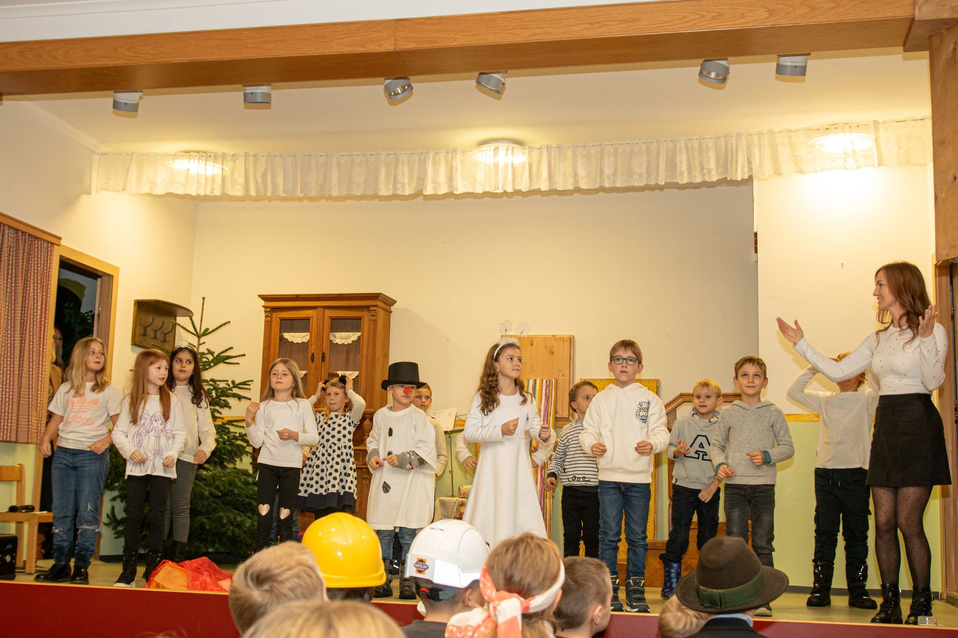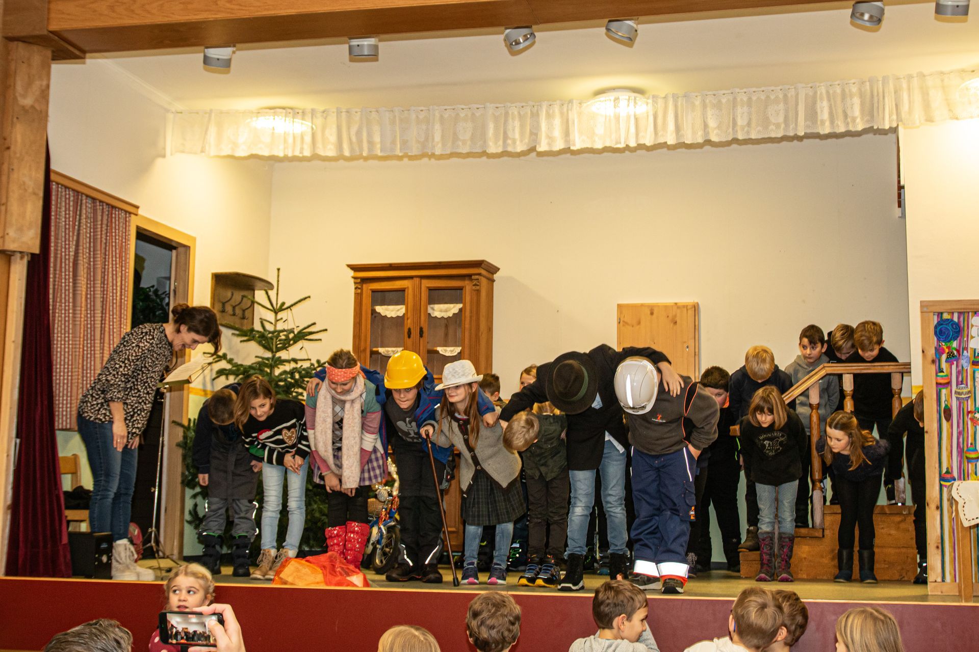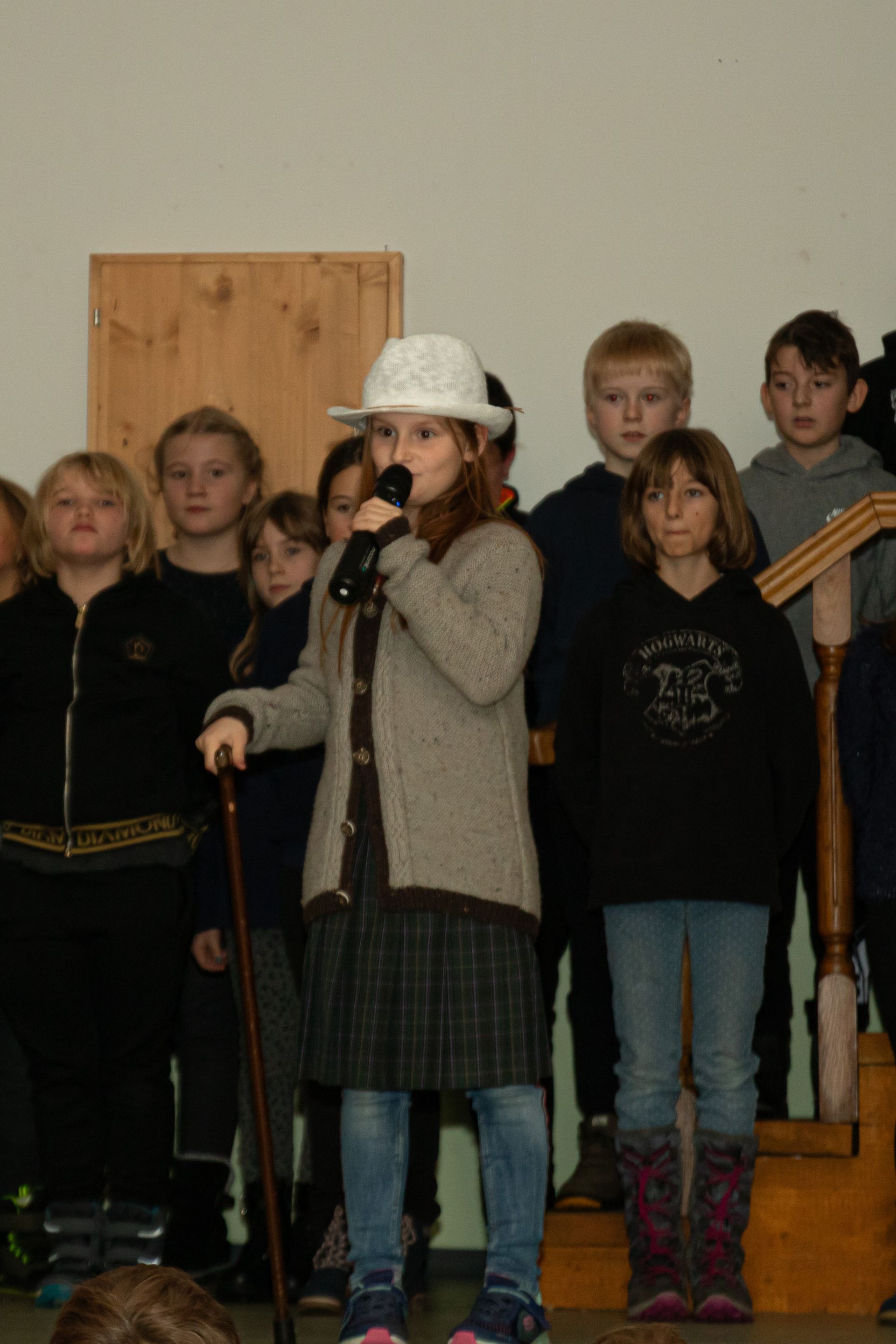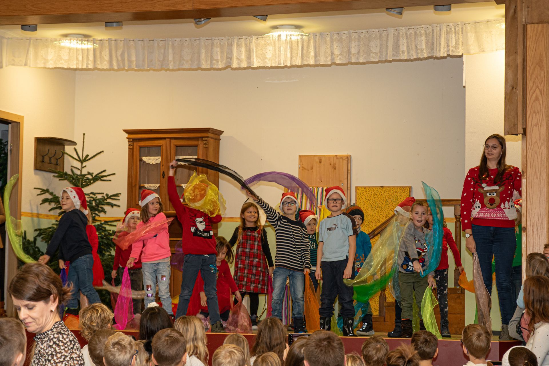 Die Kinder der 3. und 4. Klasse zeigten ein musikalisches Theaterstück mit dem Titel "Ein Dorf findet Weihnachten". Zuerst wollte im Dorf keine Weihnachtsstimmung aufkommen, alle Bewohner waren gestresst und hektisch. Doch ein kleines lustiges Mädchen namens Charlie schaffte es, die Menschen auf das wirklich Wichtige im Leben zu besinnen: Freundschaft, Gemeinschaft und Naturschutz. Besonders beeindrucken waren die gesanglichen Beiträge der Kinder.
