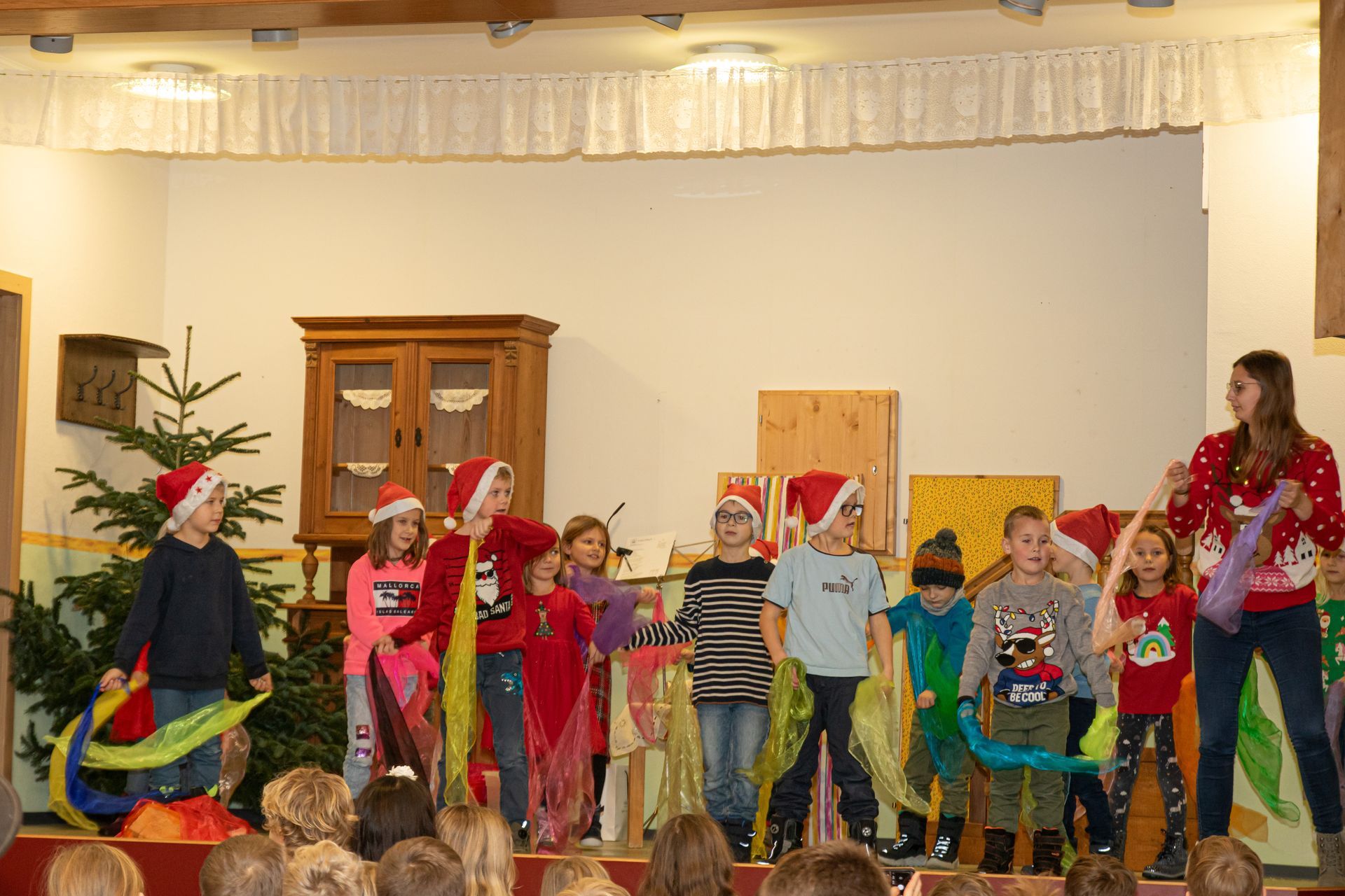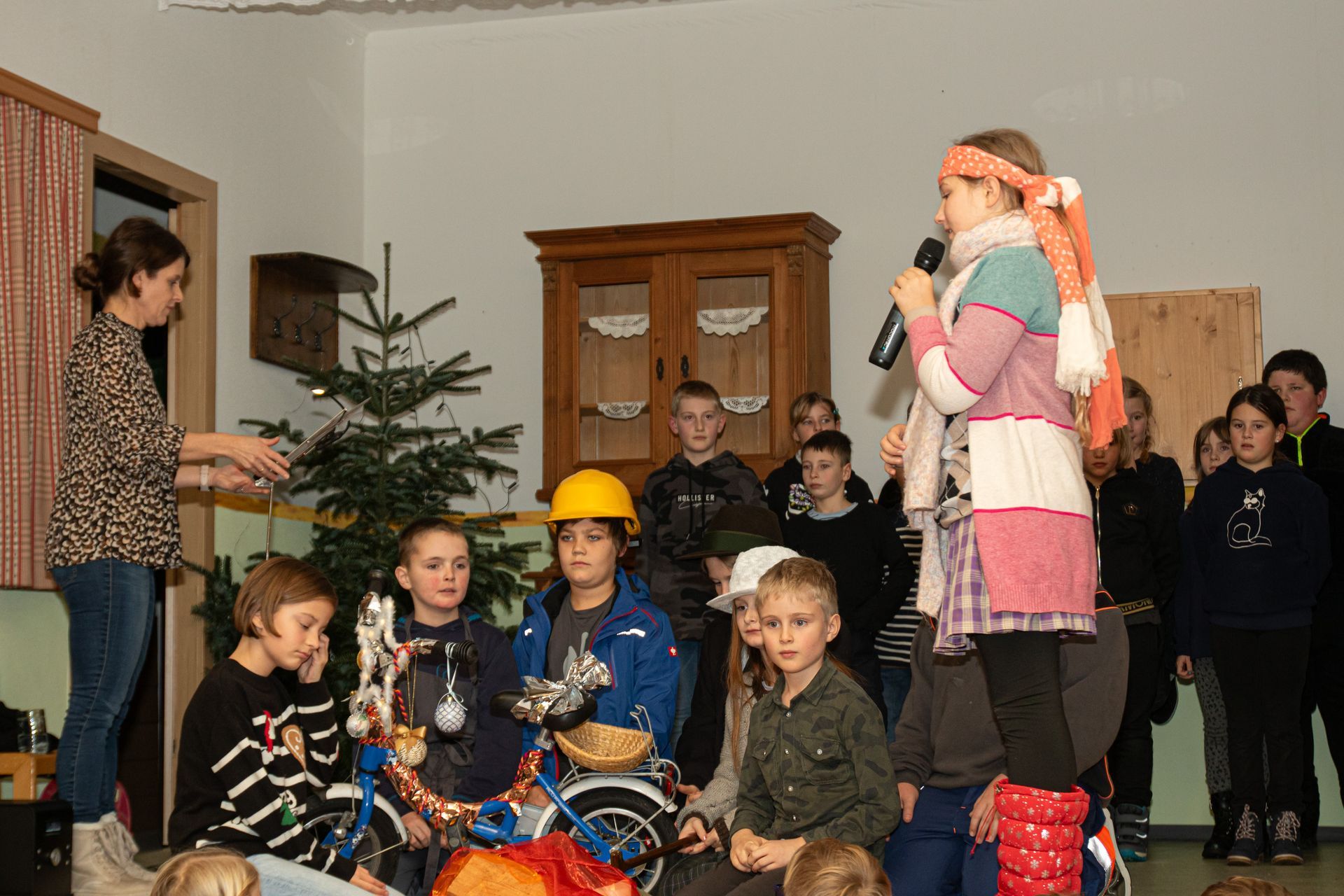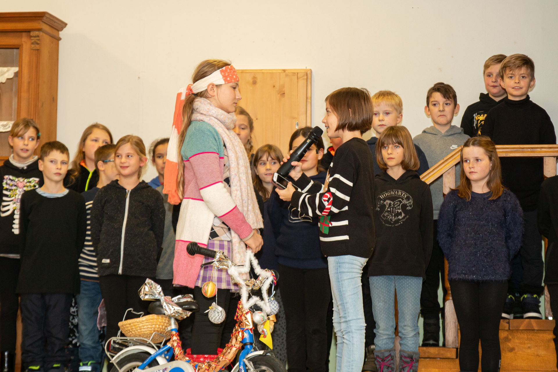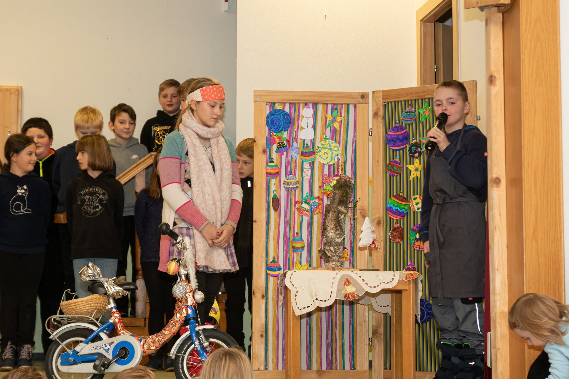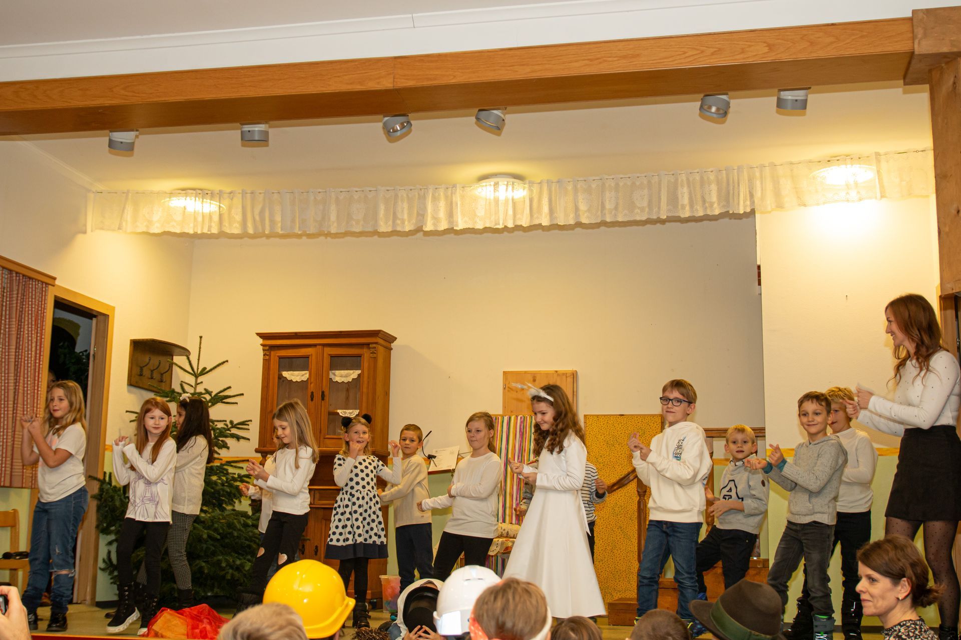 Die Kinder der 3. und 4. Klasse zeigten ein musikalisches Theaterstück mit dem Titel "Ein Dorf findet Weihnachten". Zuerst wollte im Dorf keine Weihnachtsstimmung aufkommen, alle Bewohner waren gestresst und hektisch. Doch ein kleines lustiges Mädchen namens Charlie schaffte es, die Menschen auf das wirklich Wichtige im Leben zu besinnen: Freundschaft, Gemeinschaft und Naturschutz. Besonders beeindrucken waren die gesanglichen Beiträge der Kinder.