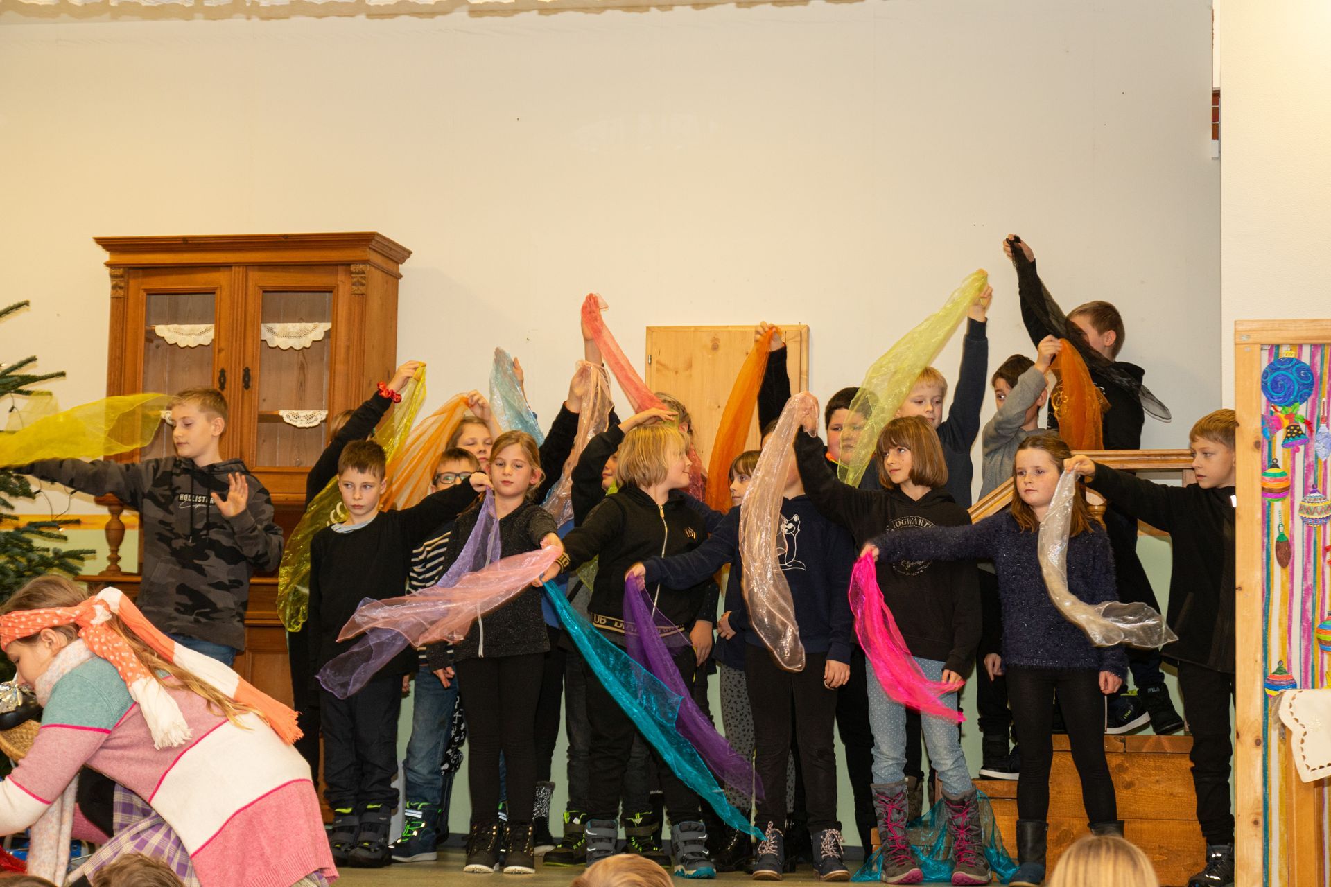 Die Kinder der ersten Klasse zeigten einen beschwingten Tanz mit Tüchern zum Lied: "Macht euch bereit". Der Schneemanntanz der 2. Klässler begeisterte das Publikum und regte alle zum Mitschunkeln an.