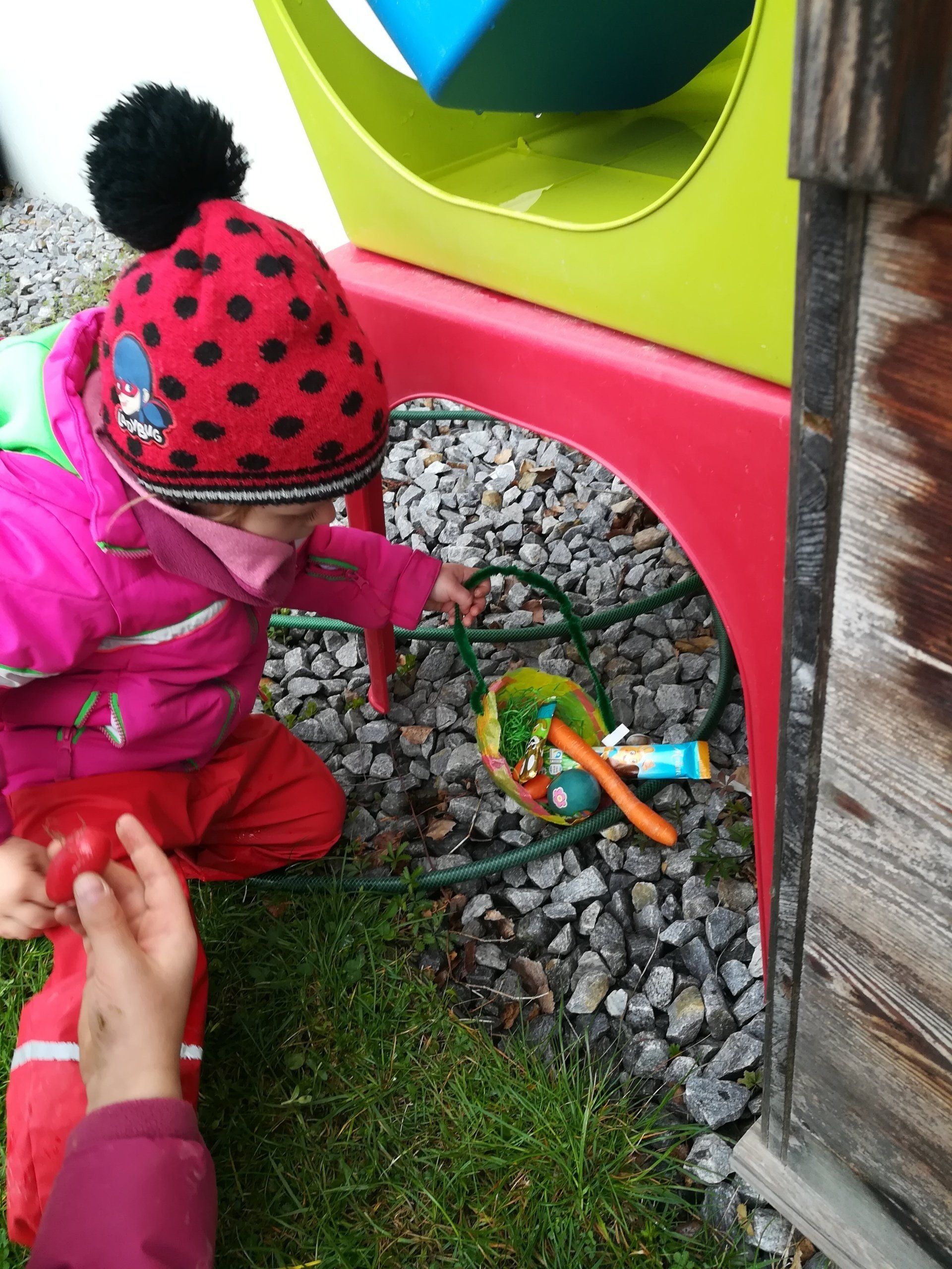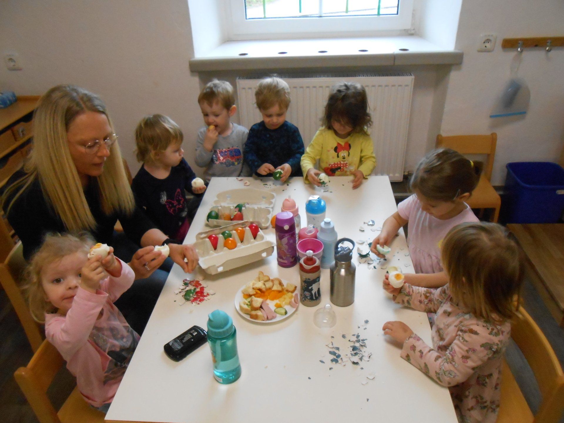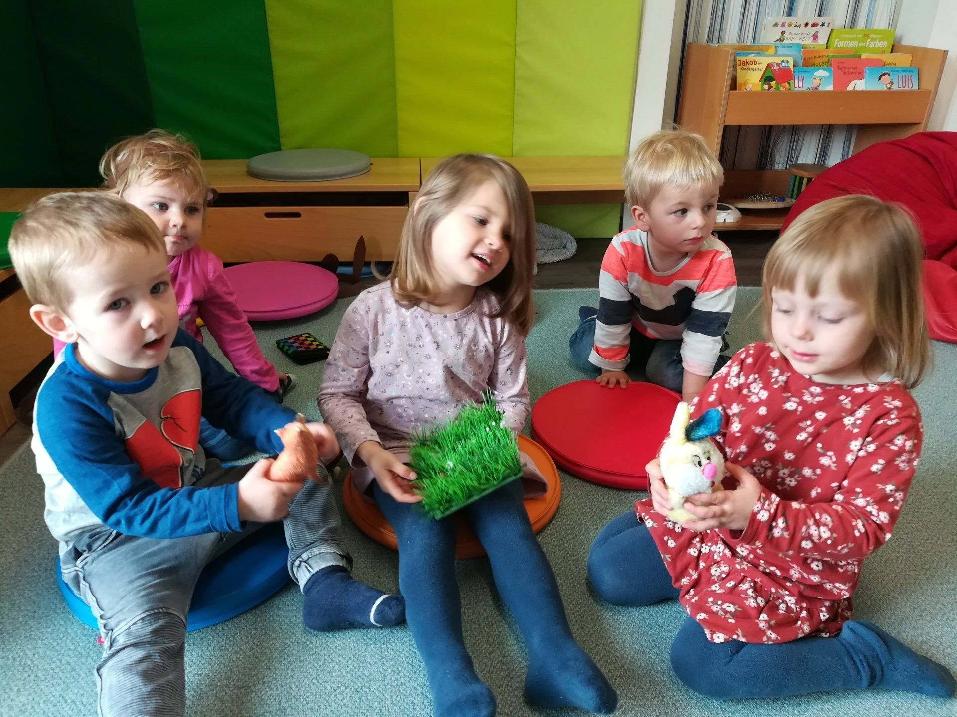Die Ostervorbereitungen sind in vollem Gange! Wir basteln Osternester, färben Ostereier, dekorieren unseren Osterstrauch mit selbst gebastelten Eiern und tanzen jeden Tag zu unseren Osterliedern. Auch ein Besuch bei den Hühnern darf nicht fehlen, um zu sehen, woher die Eier eigentlich kommen. Der Höhepunkt war natürlich das Osternesterl suchen im Krabbelstubengarten - die Freude war groß!