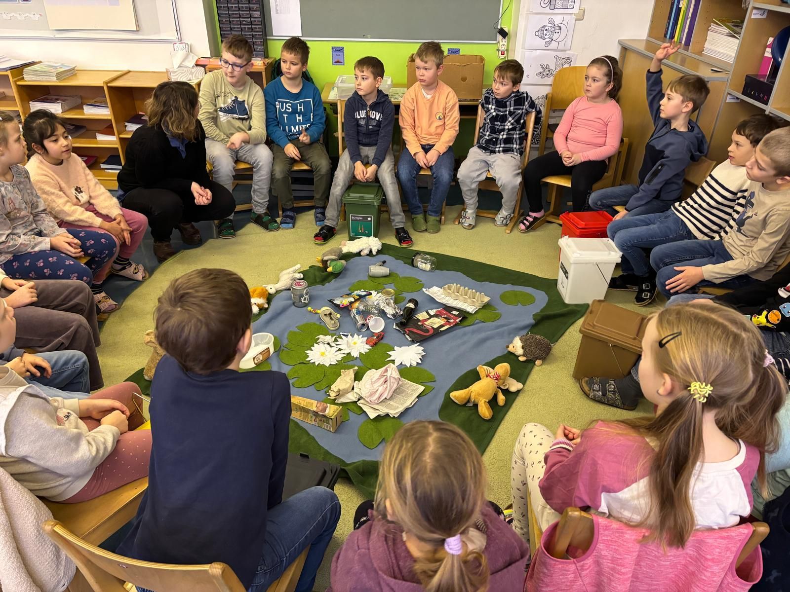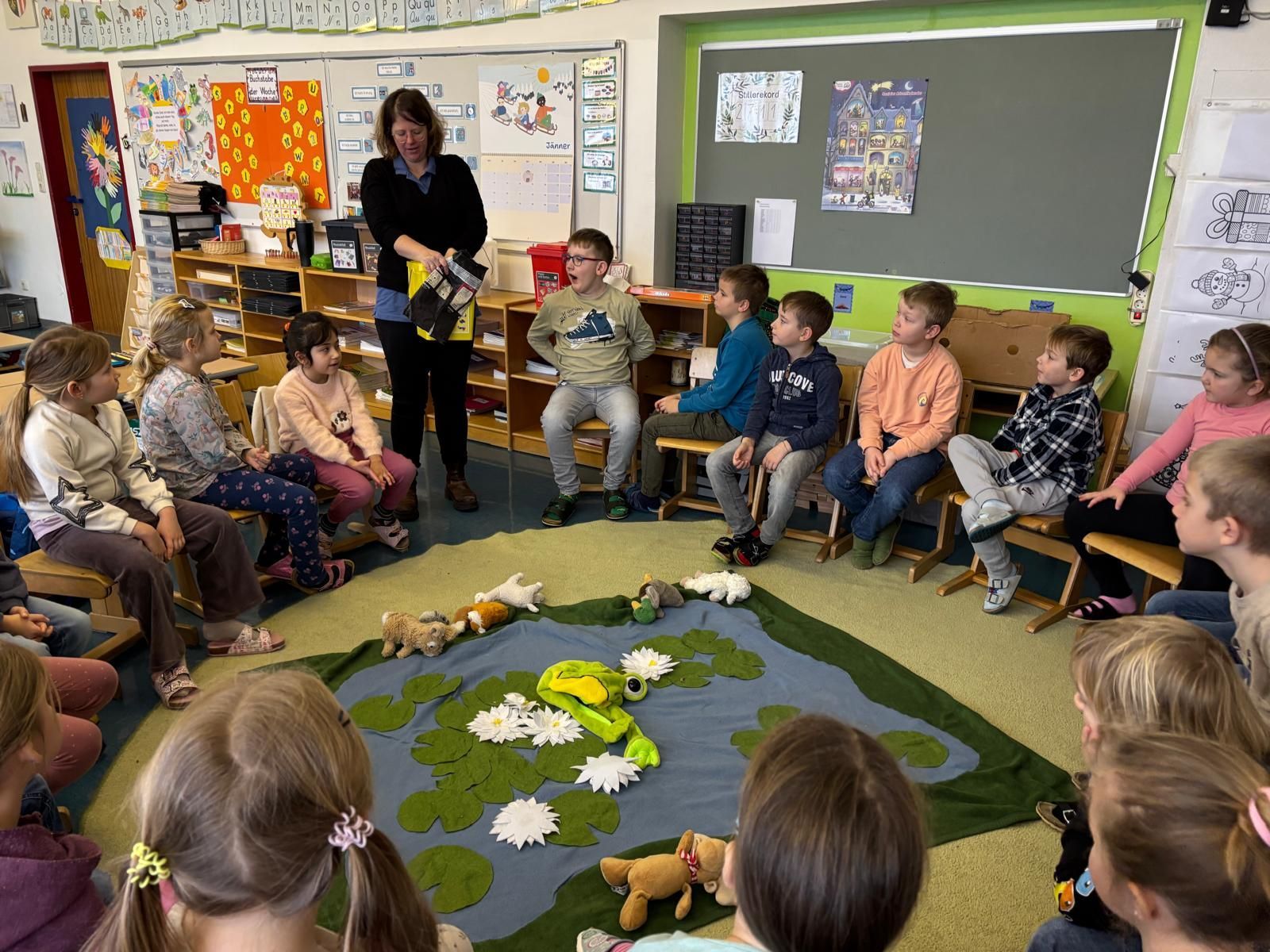 Auf spielerische Weise halfen die Kinder der 1. Klasse dem Frosch Quaxi den Seerosenteich zu säubern und den Müll richtig zu sortieren.